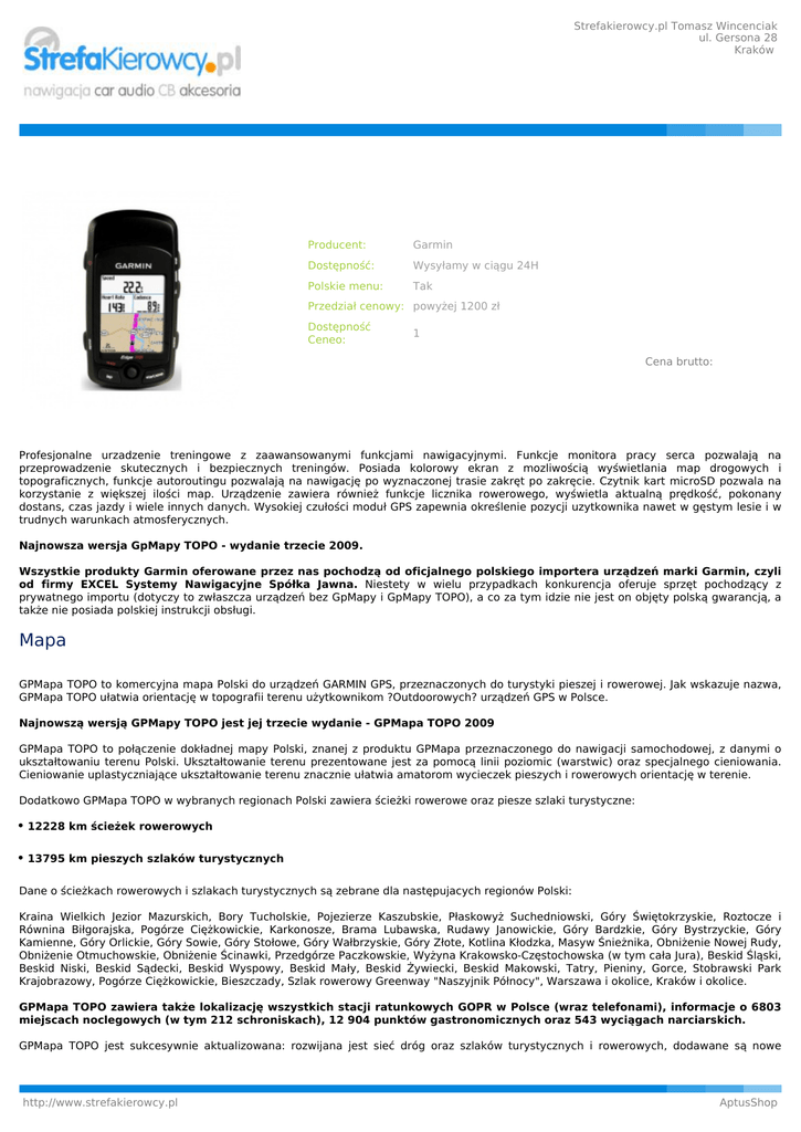 Strefakierowcy.pl Tomasz Wincenciak ul. Gersona 28 Kraków Producent: Garmin Dostępność: Wysyłamy w ciągu 24H Polskie menu: Tak Przedział cenowy: powyżej 1200 zł Dostępność Ceneo: 1 Cena brutto: Profesjonalne urzadzenie treningowe z zaawansowanymi funkcjami nawigacyjnymi. Funkcje monitora pracy serca pozwalają na przeprowadzenie skutecznych i bezpiecznych treningów. Posiada kolorowy ekran z mozliwością wyświetlania map drogowych i topograficznych, funkcje autoroutingu pozwalają na nawigację po wyznaczonej trasie zakręt po zakręcie. Czytnik kart microSD pozwala na korzystanie z większej ilości map. Urządzenie zawiera również funkcje licznika rowerowego, wyświetla aktualną prędkość, pokonany dostans, czas jazdy i wiele innych danych. Wysokiej czułości moduł GPS zapewnia określenie pozycji uzytkownika nawet w gęstym lesie i w trudnych warunkach atmosferycznych. Najnowsza wersja GpMapy TOPO - wydanie trzecie 2009. Wszystkie produkty Garmin oferowane przez nas pochodzą od oficjalnego polskiego importera urządzeń marki Garmin, czyli od firmy EXCEL Systemy Nawigacyjne Spółka Jawna. Niestety w wielu przypadkach konkurencja oferuje sprzęt pochodzący z prywatnego importu (dotyczy to zwłaszcza urządzeń bez GpMapy i GpMapy TOPO), a co za tym idzie nie jest on objęty polską gwarancją, a także nie posiada polskiej instrukcji obsługi. Mapa GPMapa TOPO to komercyjna mapa Polski do urządzeń GARMIN GPS, przeznaczonych do turystyki pieszej i rowerowej. Jak wskazuje nazwa, GPMapa TOPO ułatwia orientację w topografii terenu użytkownikom ?Outdoorowych? urządzeń GPS w Polsce. Najnowszą wersją GPMapy TOPO jest jej trzecie wydanie - GPMapa TOPO 2009 GPMapa TOPO to połączenie dokładnej mapy Polski, znanej z produktu GPMapa przeznaczonego do nawigacji samochodowej, z danymi o ukształtowaniu terenu Polski. Ukształtowanie terenu prezentowane jest za pomocą linii poziomic (warstwic) oraz specjalnego cieniowania. Cieniowanie uplastyczniające ukształtowanie terenu znacznie ułatwia amatorom wycieczek pieszych i rowerowych orientację w terenie. Dodatkowo GPMapa TOPO w wybranych regionach Polski zawiera ścieżki rowerowe oraz piesze szlaki turystyczne: 12228 km ścieżek rowerowych 13795 km pieszych szlaków turystycznych Dane o ścieżkach rowerowych i szlakach turystycznych są zebrane dla następujacych regionów Polski: Kraina Wielkich Jezior Mazurskich, Bory Tucholskie, Pojezierze Kaszubskie, Płaskowyż Suchedniowski, Góry Świętokrzyskie, Roztocze i Równina Biłgorajska, Pogórze Ciężkowickie, Karkonosze, Brama Lubawska, Rudawy Janowickie, Góry Bardzkie, Góry Bystrzyckie, Góry Kamienne, Góry Orlickie, Góry Sowie, Góry Stołowe, Góry Wałbrzyskie, Góry Złote, Kotlina Kłodzka, Masyw Śnieżnika, Obniżenie Nowej Rudy, Obniżenie Otmuchowskie, Obniżenie Ścinawki, Przedgórze Paczkowskie, Wyżyna Krakowsko-Częstochowska (w tym cała Jura), Beskid Śląski, Beskid Niski, Beskid Sądecki, Beskid Wyspowy, Beskid Mały, Beskid Żywiecki, Beskid Makowski, Tatry, Pieniny, Gorce, Stobrawski Park Krajobrazowy, Pogórze Ciężkowickie, Bieszczady, Szlak rowerowy Greenway "Naszyjnik Północy", Warszawa i okolice, Kraków i okolice. GPMapa TOPO zawiera także lokalizację wszystkich stacji ratunkowych GOPR w Polsce (wraz telefonami), informacje o 6803 miejscach noclegowych (w tym 212 schroniskach), 12 904 punktów gastronomicznych oraz 543 wyciągach narciarskich. GPMapa TOPO jest sukcesywnie aktualizowana: rozwijana jest sieć dróg oraz szlaków turystycznych i rowerowych, dodawane są nowe http://www.strefakierowcy.pl AptusShop Strefakierowcy.pl Tomasz Wincenciak ul. Gersona 28 Kraków regiony, dla których wprowadzane wprowadzamy ścieżki rowerowe i szlaki turystyczne. Ponadto GpMapa TOPO posiada wszystkie cechy samochodowej wersji GpMapy: ponad 2,4 miliona punktów adresowych ( dokładnie 2 409 527) 3335 planów miast i miejscowości w tym 2802 szczegółowych planów z adresami 410 556 kilometrów dróg ogółem w tym 309 375 km dróg asfaltowych i 101 181 km dróg gruntowych 171 878 POI takich jak: hotele, stacje benzynowe, restauracje, bankomaty, szpitale, apteki oraz wiele innych przydatnych w podróży. 44 miasta zawierające obrysy budynków: Informacje o ograniczeniach prędkości na wybranych drogach krajowych oraz w 91 miejscowościach Najważniejsze cechy Funkcje monitora pracy serca - Umożliwiają bieżącą kontrolę intensywności ćwiczeń, dopasowanie intensywności do celu jednostki treningowej. Wykorzystanie tych funkcji gwarantuje bezpieczny i efektywny trening. Funkcje GPS - Pozwalają na dokładne określenie pokonanego dystansu, aktualnej prędkości i tempa. Umożliwiają nawigację w oparciu o zapisane Waypointy oraz pokonane wcześniej trasy. Obsługa map - Urządzenie pozwala na nawigację z wykorzystaniem map drogowych i topograficznych. Autorouting - Umożliwia nawigację zakręt po zakręcie po wcześniej wyznaczonej trasie. Kolorowy ekran - Kolorowy ekran pozwala na łatwiejsze odczytywanie danych mapowych. Funkcje licznika rowerowego - Wyświetla aktualną i średnią prędkość, pokonany dystans, czas jazdy i wiele innych danych. Czytnik kart microSD - Pozwala na korzystanie z większej ilości map, zarówno drogowych jak i topograficznych. Technologia ANT+Sport - Pozwala na bezprzewodowe przesyłanie danych między urządzeniami Edge 705 a także połączenie z miernikami mocy. Wodoszczelność IPX7 - Gwarancja użyteczności urządzenia po kontakcie z wodą, nawet do 30 min. Oprogramowanie Garmin Training Center - Pozwala na analizę wykonanych treningów na ekranie komputera z wykorzystaniem tabel i wykresów. Umozliwia również monitorowanie własnej aktywności w danym tygodniu, miesiącu, itd. Łatwość instalacji Edge 705 zamknięty jest w wodoszczelnej, cienkiej obudowie, dzięki czemu doskonale pasuje na każdy rower. Urządzenie nie wymaga żadnej kalibracji, wystarczy włożyć je w dostarcz