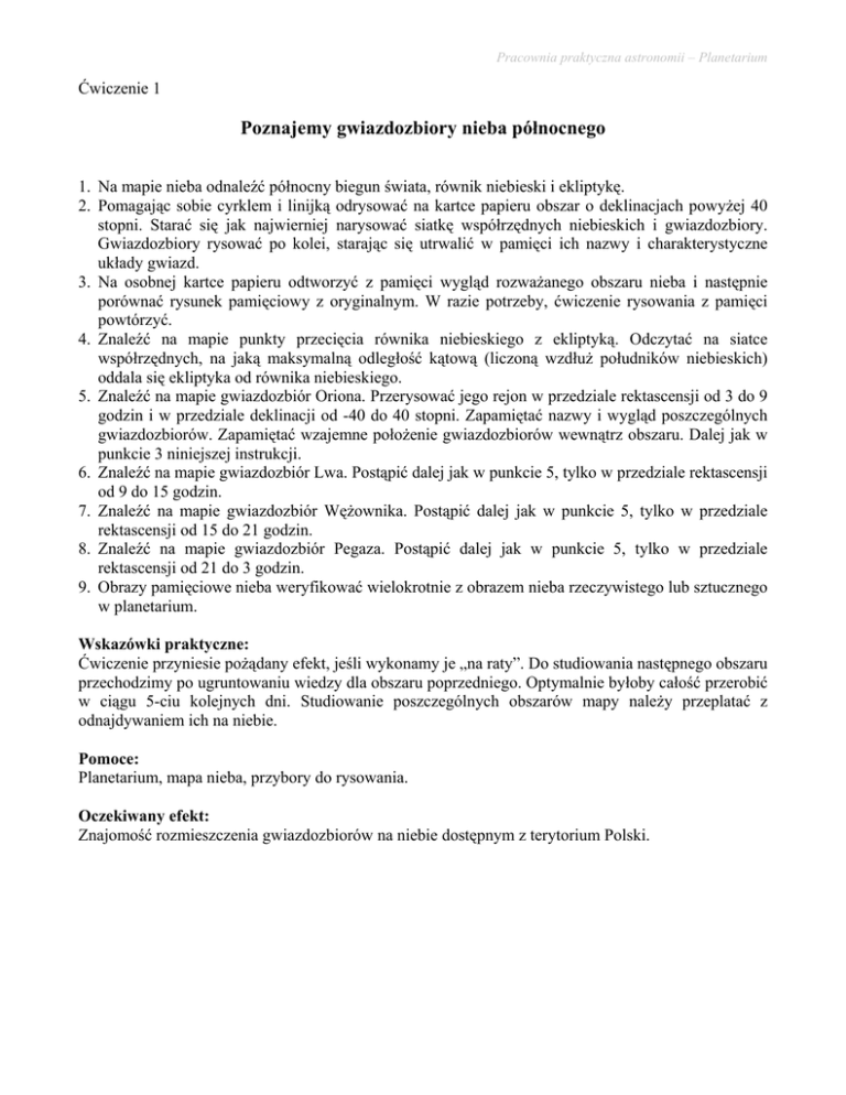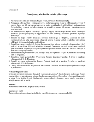 Pracownia praktyczna astronomii – Planetarium Ćwiczenie 1 Poznajemy gwiazdozbiory nieba północnego 1. Na mapie nieba odnaleźć północny biegun świata, równik niebieski i ekliptykę. 2. Pomagając sobie cyrklem i linijką odrysować na kartce papieru obszar o deklinacjach powyżej 40 stopni. Starać się jak najwierniej narysować siatkę współrzędnych niebieskich i gwiazdozbiory. Gwiazdozbiory rysować po kolei, starając się utrwalić w pamięci ich nazwy i charakterystyczne układy gwiazd. 3. Na osobnej kartce papieru odtworzyć z pamięci wygląd rozważanego obszaru nieba i następnie porównać rysunek pamięciowy z oryginalnym. W razie potrzeby, ćwiczenie rysowania z pamięci powtórzyć. 4. Znaleźć na mapie punkty przecięcia równika niebieskiego z ekliptyką. Odczytać na siatce współrzędnych, na jaką maksymalną odległość kątową (liczoną wzdłuż południków niebieskich) oddala się ekliptyka od równika niebieskiego. 5. Znaleźć na mapie gwiazdozbiór Oriona. Przerysować jego rejon w przedziale rektascensji od 3 do 9 godzin i w przedziale deklinacji od -40 do 40 stopni. Zapamiętać nazwy i wygląd poszczególnych gwiazdozbiorów. Zapamiętać wzajemne położenie gwiazdozbiorów wewnątrz obszaru. Dalej jak w punkcie 3 niniejszej instrukcji. 6. Znaleźć na mapie gwiazdozbiór Lwa. Postąpić dalej jak w punkcie 5, tylko w przedziale rektascensji od 9 do 15 godzin. 7. Znaleźć na mapie gwiazdozbiór Wężownika. Postąpić dalej jak w punkcie 5, tylko w przedziale rektascensji od 15 do 21 godzin. 8. Znaleźć na mapie gwiazdozbiór Pegaza. Postąpić dalej jak w punkcie 5, tylko w przedziale rektascensji od 21 do 3 godzin. 9. Obrazy pamięciowe nieba weryfikować wielokrotnie z obrazem nieba rzeczywistego lub sztucznego w planetarium. Wskazówki praktyczne: Ćwiczenie przyniesie pożądany efekt, jeśli wykonamy je „na raty”. Do studiowania następnego obszaru przechodzimy po ugruntowaniu wiedzy dla obszaru poprzedniego. Optymalnie byłoby całość przerobić w ciągu 5-ciu kolejnych dni. Studiowanie poszczególnych obszarów mapy należy przeplatać z odnajdywaniem ich na niebie. Pomoce: Planetarium, mapa nieba, przybory do rysowania. Oczekiwany efekt: Znajomość rozmieszczenia gwiazdozbiorów na niebie dostępnym z terytorium Polski.