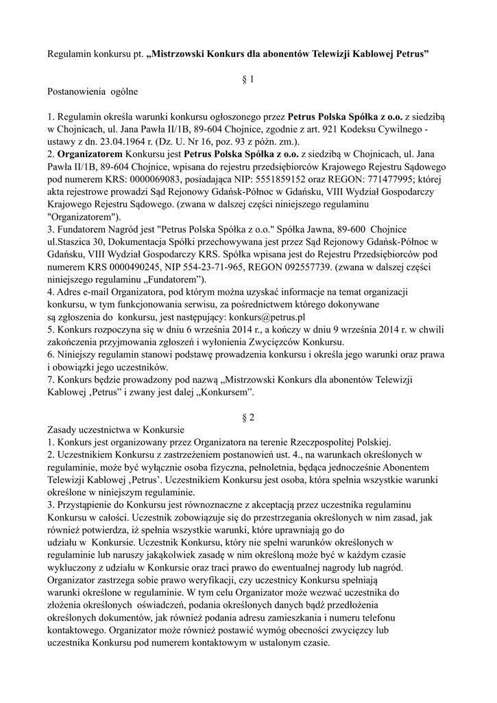 Regulamin konkursu pt. „Mistrzowski Konkurs dla abonentów Telewizji Kablowej Petrus” ! §1 Postanowienia ogólne ! 1. Regulamin określa warunki konkursu ogłoszonego przez Petrus Polska Spółka z o.o. z siedzibą w Chojnicach, ul. Jana Pawła II/1B, 89-604 Chojnice, zgodnie z art. 921 Kodeksu Cywilnego ustawy z dn. 23.04.1964 r. (Dz. U. Nr 16, poz. 93 z późn. zm.). 2. Organizatorem Konkursu jest Petrus Polska Spółka z o.o. z siedzibą w Chojnicach, ul. Jana Pawła II/1B, 89-604 Chojnice, wpisana do rejestru przedsiębiorców Krajowego Rejestru Sądowego pod numerem KRS: 0000069083, posiadająca NIP: 5551859152 oraz REGON: 771477995; której akta rejestrowe prowadzi Sąd Rejonowy Gdańsk-Północ w Gdańsku, VIII Wydział Gospodarczy Krajowego Rejestru Sądowego. (zwana w dalszej części niniejszego regulaminu "Organizatorem"). 3. Fundatorem Nagród jest "Petrus Polska Spółka z o.o." Spółka Jawna, 89-600 Chojnice ul.Staszica 30, Dokumentacja Spółki przechowywana jest przez Sąd Rejonowy Gdańsk-Północ w Gdańsku, VIII Wydział Gospodarczy KRS. Spółka wpisana jest do Rejestru Przedsiębiorców pod numerem KRS 0000490245, NIP 554-23-71-965, REGON 092557739. (zwana w dalszej części niniejszego regulaminu „Fundatorem”). 4. Adres e-mail Organizatora, pod którym można uzyskać informacje na temat organizacji konkursu, w tym funkcjonowania serwisu, za pośrednictwem którego dokonywane są zgłoszenia do konkursu, jest następujący: [email protected] 5. Konkurs rozpoczyna się w dniu 6 września 2014 r., a kończy w dniu 9 września 2014 r. w chwili zakończenia przyjmowania zgłoszeń i wyłonienia Zwycięzców Konkursu. 6. Niniejszy regulamin stanowi podstawę prowadzenia konkursu i określa jego warunki oraz prawa i obowiązki jego uczestników. 7. Konkurs będzie prowadzony pod nazwą „Mistrzowski Konkurs dla abonentów Telewizji Kablowej ‚Petrus” i zwany jest dalej „Konkursem”. ! §2 Zasady uczestnictwa w Konkursie 1. Konkurs jest organizowany przez Organizatora na terenie Rzeczpospolitej Polskiej. 2. Uczestnikiem Konkursu z zastrzeżeniem postanowień ust. 4., na warunkach określonych w regulaminie, może być wyłącznie osoba fizyczna, pełnoletnia, będąca jednocześnie Abonentem Telewizji Kablowej ‚Petrus’. Uczestnikiem Konkursu jest osoba, która spełnia wszystkie warunki określone w niniejszym regulaminie. 3. Przystąpienie do Konkursu jest równoznaczne z akceptacją przez uczestnika regulaminu Konkursu w całości. Uczestnik zobowiązuje się do przestrzegania określonych w nim zasad, jak również potwierdza, iż spełnia wszystkie warunki, które uprawniają go do udziału w Konkursie. Uczestnik Konkursu, który nie spełni warunków określonych w regulaminie lub naruszy jakąkolwiek zasadę w nim określoną może być w każdym czasie wykluczony z udziału w Konkursie oraz traci prawo do ewentualnej nagrody lub nagród. Organizator zastrzega sobie prawo weryfikacji, czy uczestnicy Konkursu spełniają warunki określone w regulaminie. W tym celu Organizator może wezwać uczestnika do złożenia określonych oświadczeń, podania określonych danych bądź przedłożenia określonych dokumentów, jak również podania adresu zamieszkania i numeru telefonu kontaktowego. Organizator może również postawić wymóg obecności zwycięzcy lub uczestnika Konkursu pod numerem kontaktowym w ustalonym czasie. 4. W Konkursie nie mogą brać udziału pracownicy Organizatora oraz innych firm współpracujących przy organizacji i przeprowadzeniu Konkursu ani członkowie rodzin pracowników tych podmiotów do drugiego stopnia pokrewieństwa włącznie. 5. Uczestnictwa w Konkursie, jak i praw i obowiązków z nim związanych, w tym także prawa do żądania wydania nagrody nie można przenosić na inne podmioty. §3 Zasady Konkursu 1. Konkurs prowadzony będzie zgodnie z postanowieniami zapisu § 1. ust. 5, tj. od soboty do wtorku. Po zakończeniu przyjmowania zgłoszeń zgodnie z ust. 2. i 3. odbywa się wybór najciekawszego zgłoszenia. 2. Warunkiem przystąpienia do Konkursu jest przysłanie w okresie od dnia 6 września 2014 r. do dnia 9 września 2014 r., do godziny 12:00 podczas trwania Konkursu, wiadomości e-mail: na adres [email protected] i spełnienie warunków określonych w ust. od 3. do 6. ! 3. Zadaniem uczestników Konkursu jest przysłanie uzasadnienia, dlaczego to właśnie Nadsyłający zgłoszenie powinien wygrać bilet na mecz siatkarski, który odbędzie się 11 września 2014 r. w Bydgoszczy w ramach trwających w Polsce Mistrzostw Świata w Piłce Siatkowej Mężczyzn 2014. 4. Uczestnik może zgłosić do Konkursu dowolną ilość wiadomości e-mail z tym, że jedna wiadomość e-mail może dotyczyć tylko jednego uzasadnienia. 5. Po zakończeniu nadsyłania zgłoszeń wyznaczona na potrzeby Konkursu Komisja wybiera spośród zgłoszeń e-mail, trzy wiadomości w jej ocenie z najciekawszymi uzasadnieniami. Następnie Komisja dokonuje próby skontaktowania się z autorami wybranych Uzasadnień, wysyłając do Autorów informację na adresy e-mail, z których zostały wysłane wybrane przez Komisję wiadomości e-mail celem uzgodnienia warunków odbioru Nagrody. 6. Autorzy wybranych zgodnie z ust. 5 zgłoszeń, każdorazowo zobowiązani są odpowiedzieć na wiadomość od Organizatora w ciągu 12 godzin od otrzymania informacji. 7. Jeśli w ciągu 12 godzin od otrzymania informacji od Organizatora, Autor wybranej przez Komisję Konkursową wiadomości nie skontaktuje się z Organizatorem dany uczestnik, traci szansę na wygranie nagrody. Wówczas Komisja Konkursowa może zdecydować o próbie kontaktu z kolejnym wybranym uczestnikiem, bądź o przepadku Nagrody. ! §4 Nagrody 1. Nagrodą w Konkursie są bilety na siatkarski mecz, który odbędzie się w czwartek 11 września 2014 r. o godz. 16:30 w Bydgoszczy w ramach trwających w Polsce Mistrzostw Świata w Piłce Siatkowej Mężczyzn 2014. Nagrodę w Konkursie zagwa