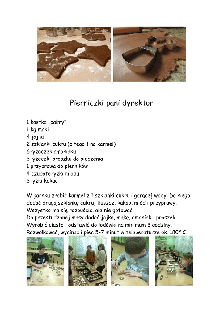 Pierniczki pani dyrektor 1 kostka „palmy” 1 kg mąki 4 jajka 2 szklanki cukru (z tego 1 na karmel) 6 łyżeczek amoniaku 3 łyżeczki proszku do pieczenia 1 przyprawa do pierników 4 czubate łyżki miodu 3 łyżki kakao W garnku zrobić karmel z 1 szklanki cukru i gorącej wody. Do niego dodać drugą szklankę cukru, tłuszcz, kakao, miód i przyprawy. Wszystko ma się rozpuścić, ale nie gotować. Do przestudzonej masy dodać jajka, mąkę, amoniak i proszek. Wyrobić ciasto i odstawić do lodówki na minimum 3 godziny. Rozwałkować, wycinać i piec 5-7 minut w temperaturze ok. 180º C.