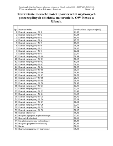 Dzierżawa b. Ośrodka Wypoczynkowego «Nexus» w Gibach na lata 2010 – 2035” (SA-2126-3/10) Wykaz nieruchomości – zał. nr 2 do umowy dzierżawy Strona 1 z 2 Zestawienie nieruchomości i powierzchni użytkowych poszczególnych obiektów na terenie b. OW Nexus w Gibach. Lp. 1 2 3 4 5 6 7 8 9 10 11 12 13 14 15 16 17 18 19 20 21 22 23 24 25 26 27 28 29 30 31 32 33 34 35 36 37 Nazwa obiektu Domek campingowy Nr 1 Domek campingowy Nr 2 Domek campingowy Nr 3 Domek campingowy Nr 4 Domek campingowy Nr 5 Domek campingowy Nr 6 Domek campingowy Nr 7 Domek campingowy Nr 8 Domek campingowy Nr 9 Domek campingowy Nr 10 Domek campingowy Nr 11 Domek campingowy Nr 12 Domek campingowy Nr 13 Domek campingowy Nr 14 Domek campingowy Nr 15 Domek campingowy Nr 16 Domek campingowy Nr 17 Domek campingowy Nr 18 Domek campingowy Nr 19 Domek campingowy Nr 20 Domek campingowy Nr 21 Domek campingowy Nr 22 Domek campingowy Nr 23 Domek campingowy Nr 24 Domek campingowy Nr 25 Domek campingowy Nr 26 Domek campingowy Nr 27 Domek campingowy Nr 28 Domek campingowy Nr 29 Domek campingowy Nr 30 Domek Mazowsze Budynek agregatu prądotwórczego Budynek hydroforni Śmietnik murowany wolnostojący Budynek przystani wioślarskiej Barak Budynek magazynowy murowany Powierzchnia użytkowa [m2] 16,90 17,15 16,91 17,25 16,98 21,18 21,12 22,12 20,97 21,98 21,63 50,06 21,61 21,37 21,69 21,85 21,73 21,76 21,96 21,93 22,36 20,79 20,43 50,03 16,92 22,09 21,82 22,99 22,54 31,85 66,42 22,42 22,80 16,43 82,95 31,06 65,33 Dzierżawa b. Ośrodka Wypoczynkowego «Nexus» w Gibach na lata 2010 – 2035” (SA-2126-3/10) Wykaz nieruchomości – zał. nr 2 do umowy dzierżawy Strona 2 z 2 Budynek trzykondygnacyjny kuchni murowany ze 38 stołówką i drewnianą dobudówką Razem budynki 39 Parking samochodowy 40 Szambo zamknięte 9 kom. z kr. bet. 41 Ogrodzenie 840,81 1838,19