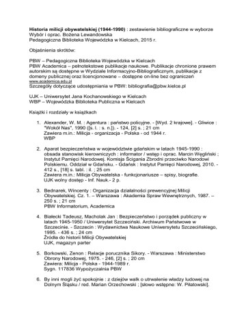 Historia milicji obywatelskiej (1944-1990) : zestawienie bibliograficzne w wyborze Wybór i oprac. Bożena Lewandowska Pedagogiczna Biblioteka Wojewódzka w Kielcach, 2015 r. Objaśnienia skrótów: PBW – Pedagogiczna Biblioteka Wojewódzka w Kielcach PBW Academica – pełnotekstowe publikacje naukowe. Publikacje chronione prawem autorskim są dostępne w Wydziale Informacyjno-Bibliograficznym, publikacje z domeny publicznej oraz licencjonowane – dostępne on-line bez ograniczeń www.academica.edu.pl Szczegóły dotyczące udostępniania w PBW: [email protected] UJK – Uniwersytet Jana Kochanowskiego w Kielcach WBP – Wojewódzka Biblioteka Publiczna w Kielcach Książki i rozdziały w książkach 1. Alexander, W. M. : Agentura : państwo policyjne. - [Wyd. 2 krajowe]. - Gliwice : "Wokół Nas", 1990 ([s. l. : s. n.]). - 124, [2] s. ; 21 cm Zawiera m.in.: Milicja - organizacja - Polska - od 1944 r. WBP 2. Aparat bezpieczeństwa w województwie gdańskim w latach 1945-1990 : obsada stanowisk kierowniczych : informator / wstęp i oprac. Marcin Węgliński ; Instytut Pamięci Narodowej. Komisja Ścigania Zbrodni przeciwko Narodowi Polskiemu. Oddział w Gdańsku. - Gdańsk : Instytut Pamięci Narodowej, 2010. 412 s., [18] s. tabl. : il. ; 25 cm Zawiera m.in.: Milicja Obywatelska - funkcjonariusze – spisy, biografie. UJK wolny dostęp - Inf. Nauk.- 2 p. 3. Bednarek, Wincenty : Organizacja działalności prewencyjnej Milicji Obywatelskiej. Cz. 1. – Warszawa : Akademia Spraw Wewnętrznych, 1987. – 250 s. ; 21 cm PBW Informatorium, Academica 4. Białecki Tadeusz, Macholak Jan : Bezpieczeństwo i porządek publiczny w latach 1945-1950 / Uniwersytet Szczeciński. Archiwum Państwowe w Szczecinie. - Szczecin : Wydawnictwa Naukowe Uniwersytetu Szczecińskiego, 1995. - 436 s. ; 24 cm Źródła do historii Milicji Obywatelskiej UJK, magazyn parter 5. Borkowski, Zenon : Relacje porucznika Sikory. - Warszawa : Ministerstwo Obrony Narodowej, 1975. - 246, [2] s. ; 20 cm Zawiera: Milicja - Polska - 1944-1989 r. Sygn. 117836 Wypożyczalnia PBW 6. By inni mogli żyć spokojnie : z dziejów walk o utrwalenie władzy ludowej na Dolnym Śląsku / red. Marian Orzechowski ; [słowo wstępne: W. Piłatowski]. - Wrocław : Zakład Narodowy im. Ossolińskich, 1967. - 259, [1] s. : il. ; 23 cm Zawiera m.in.: Milicja - Polska - 1944-1989 r., Służba bezpieczeństwa - Polska 1944-1989 r. Sygn. 51837 Wypożyczalnia PBW 7. Caban Ireneusz, Machocki Edward : Za władzę ludu. – Lublin : Wydawnictwo Lubelskie, 1975. – 594 s. : tab. ; 25 cm. – Bibliogr. Sygn. 117594 Wypożyczalnia PBW 8. Ciąg dalszy nastąpił / Zbigniew Bryczkowski [et al.]. - Warszawa : "Książka i Wiedza", 1971. - 365, [3] s. ; 23 cm Zawiera m.in.: Milicja - Polska - 1944-1989 r., Służba bezpieczeństwa - Polska 1944-1989 r. Sygn. 87443 Wypożyczalnia PBW 8. Daleszak, Bogdan : Proszę wprowadzić podejrzanego. - Wrocław : Zakład Narodowy im. Ossolińskich, 1975. - 391, [1] s. ; 20 cm Zawiera m.in.: Milicja - Polska - 1944-1989 r. Sygn.115260 Wypożyczalnia PBW 9. Daleszak, Bogdan : Zarządzam blokadę całego rejonu. - Wrocław : Zakład Narodowy im. Ossolińskich, 1977. - 273, [2] s. ; 20 cm Zawiera m.in.: Milicja - Polska. Sygn. 136670 Wypożyczalnia PBW 10. Filar, Alfons : Gdy umilkły działa : wspomnienia. - Warszawa : Wydawnictwo Ministerstwa Obrony Narodowej, 1972. - 428, [4] s., [20] s. tabl. : il. ; 18 cm Zawiera m.in.: Milicja – Polska, Służba bezpieczeństwa - Polska - 1944-1989 r. Sygn. 92692 Wypożyczalnia PBW 11. Filar, Alfons : Nie tylko pod znakiem walki. - Warszawa : Ministerstwo Obrony Narodowej, 1987. - 257, [3] s., [16] s. tabl. : fot., portr. ; 20 cm Sygn. 194084 Wypożyczalnia PBW 12. Góra Władysław, Jakubowski Zenon: Z dziejów organów bezpieczeństwa i porządku publicznego w województwie lubelskim 1944-1948 / Władysław Góra. - Lublin : Wydawnictwo Lubelskie, 1978. - 214, [2] s. : mapa, tab. ; 22 cm Zawiera m.in.: Milicja - Polska - 1944-1956 r., Służba bezpieczeństwa - Polska 1944-1956 r. Sygn. 141200 Wypożyczalnia PBW 13. Grodziński, Juliusz : Numer służbowy 1895. - Warszawa : "Książka i Wiedza", 1967. - 215, [1] s. ; 18 cm Reportaże dotyczące pracy Milicji Obywatelskiej. Sygn. 53280 Wypożyczalnia 14. Jakubowski, Zenon : Milicja Obywatelska : 1944-1948. - Warszawa : Państwowe Wydawnictwo Naukowe, 1988. - 530, [2] s. ; 22 cm. - Bibliogr. s. 511-520 Sygn. 196673 Wypożyczalnia PBW 15. Jakubowski, Jerzy : Policjant : okrutne zbrodnie, głośne śledztwa. - Zakrzewo : Wydawnictwo Replika, cop. 2008. - 193, [2] s. : il. ; 21 cm Zawiera m.in.: Milicja - Polska - pamiętniki Pamiętniki polskie - od 1944 r. WBP 16. Kryptonim "Anna" / Tadeusz Brytan [et al.]. - Warszawa : "Książka i Wiedza", 1976. - 403, [5] s. : 20 cm Zawiera m.in.: Milicja - Polska. Sygn. 128398 Wypożyczalnia PBW 17. Kukuła, Piotr Aleksander : A oni ginęli dalej. - Wyd. 2 popr. - Łódź : Wydawnictwo Łódzkie, 1973. - 461, [2] s., [8] k. tabl. : il. ; 18 cm Zawiera m.in.: Milicja - Polska - 1944-1989 r. Sygn. 96955 Wypożyczalnia PBW 18. Lipka, Marian : Zwierzenia niezwykłego policjanta. - Warszawa : "Warsgraf" : nakł. autora, 1999. - 439, [1] s. ; 21 cm Zawiera m.in.: Milicja obywatelska w l. 1945-1990. UJK, Magazyn-parter 19. Majer, Piotr : Historiografia i stan badań nad dziejami aparatu bezpieczeństwa i porządku publicznego oraz wojsk wewnętrznych. - Warszawa : ASW, 1984. – 354 s. – Bibliogr. – 21 cm PBW Informatorium, Academica 20. Majer, Piotr : Milicja Obywatelska 1944-1957 : geneza, organizacja, działalność, miejsce w aparacie władzy. - Olsztyn : Wydawnictwo Uniwersytetu Warmińsko-Mazurskiego, 2004. - 475 s. ; 24 cm. - Bibliogr. s. 435-[453] UJK Magazyn-parter, wolny dostęp-zwarte-1 p. 21. Majer, Piotr : Milicja Obywatelska w systemie organów władzy PRL : (zarys problematyki i źródła). - Toruń : Wydawnictwo Adam Marszałek, 2003. - 469 s. ; 24 cm. - Bibliogr. s. 100-103 Magazyn-pa