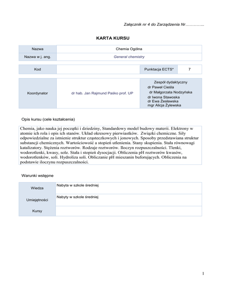 Załącznik nr 4 do Zarządzenia Nr………….. KARTA KURSU Nazwa Chemia Ogólna Nazwa w j. ang. General chemistry Kod Koordynator Punktacja ECTS* dr hab. Jan Rajmund Paśko prof. UP 7 Zespół dydaktyczny dr Paweł Cieśla dr Małgorzata Nodzyńska dr Iwona Stawoska dr Ewa Żesławska mgr Alicja Żylewska Opis kursu (cele kształcenia) Chemia, jako nauka jej początki i dziedziny, Standardowy model budowy materii. Elektrony w atomie ich rola i opis ich stanów. Układ okresowy pierwiastków. Związki chemiczne. Siły odpowiedzialne za istnienie struktur cząsteczkowych i jonowych. Sposoby przedstawiana struktur substancji chemicznych. Wartościowość a stopień utlenienia. Stany skupienia. Stała równowagi katalizatory. Stężenia roztworów. Rodzaje roztworów. Iloczyn rozpuszczalności. Tlenki, wodorotlenki, kwasy, sole. Stała i stopień dysocjacji. Obliczenia pH roztworów kwasów, wodorotlenków, soli. Hydroliza soli. Obliczanie pH mieszanin buforujących. Obliczenia na podstawie iloczynu rozpuszczalności. Warunki wstępne Wiedza Umiejętności Nabyta w szkole średniej Nabyty w szkole średniej Kursy 1 Efekty kształcenia Efekt kształcenia dla kursu Wiedza W01. Zna standardowy model budowy atomu z uwzględnieniem chemii kwantowej. W02. Zna podstawowe współczesne teorie kwasów i zasad. W03. Wyjaśnia okresowość właściwości fizykochemicznych. W04. Zna podstawowe prawa chemiczne. W05. Omawia najważniejsze właściwości, reaktywność związków nieorganicznych (tlenki, wodorotlenki, kwasy, sole). W06. Wykazuje podstawową wiedzę na temat procesów hydrolizy, rozpuszczania, dysocjacji, amfoteryczności. W07. Zna zasady nazewnictwa związków chemicznych W08. Zna podstawowe zasady bezpieczeństwa i higieny pracy w laboratorium chemicznym. Odniesienie do efektów kierunkowych K_W01 K_W01, K_W02 K_W01, K_W02 K_W01, K_W02 K_W01, K_W02, K_W08 K_W01, K_W08 K_W01 K_W01 K_W01, K_W02, K_W08 c Efekt kształcenia dla kursu Umiejętności W01. Zna standardowy model budowy atomu z uwzględnieniem chemii kwantowej. W02. Zna podstawowe współczesne teorie kwasów i zasad. W03. Wyjaśnia okresowość właściwości fizykochemicznych. W04. Zna podstawowe prawa chemiczne. W05. Omawia najważniejsze właściwości, reaktywność związków nieorganicznych (tlenki, wodorotlenki, kwasy, sole). W06. Wykazuje podstawową wiedzę na temat procesów hydrolizy, rozpuszczania, dysocjacji, amfoteryczności. W07. Zna zasady nazewnictwa związków chemicznych W08. Zna podstawowe zasady bezpieczeństwa i higieny pracy w laboratorium chemicznym.. U06. Potrafi planować i wykonywać proste badania doświadczalne, obserwacje zjawisk i procesów chemicznych oraz analizować ich wyniki. Efekt kształcenia dla kursu Kompetencje społeczne K01. Sprawnie organizuje wspólne wykonywanie zadań i pracę w grupie. K02. Postępuje z powierzonym sprzętem laboratoryjnym zgodnie z obowiązującymi procedurami. Odniesienie do efektów kierunkowych K_U01 K_U12 K_U05 K_U07 K_U13 K_U03, K_U07 Odniesienie do efektów kierunkowych K_K02 K_K12 2 Organizacja Forma zajęć Ćwiczenia w grupach Wykład (W) A Liczba godzin 20 K L 20 S P E 60 Opis metod prowadzenia zajęć Prezentacja multimedialna Wykład informacyjny Wykład konwersatoryjny Pogadanka przedstawiająca nowe wiadomości Dyskusja Metody praktyczne x x x x x x x x x x x x x x x x x x x x x x x x x Inne x x x x x Egzamin ustny Praca pisemna (esej) Referat Udział w dyskusji Projekt grupowy Projekt indywidualny Zajęcia terenowe Ćwiczenia w szkole Praca laboratoryjna x x x x x x x x x Egzamin pisemny W01 W02 W03 W04 W05 W06 W07 W08 W09 W10 U01 U02 U03 U04 U05 U06 K01 K02 Gry dydaktyczne E – learning Formy sprawdzania efektów kształcenia x X 3 Kryteria oceny W trakcie semestru 3 sprawdziany z zajęć laboratoryjnych, 2 z ćwiczeń audytoryjnych i egzamin z wykładu. Ocena końcowa obejmuje w równym stopniu wyniki wszystkich kolokwiów. Do zaliczenie zajęć laboratoryjnych wymagane jest oddanie poprawnych sprawozdań ze wszystkich ćwiczeń laboratoryjnych. Uwagi Treści merytoryczne (wykaz tematów) 1. 2. 3. 4. 5. 6. Budowa atomu, cząsteczka jon w oparciu o machanikę kwantową. Reaktywność i otrzymywanie związków nieorganicznych (tlenki, wodorotlenki, kwasy, sole). Konfiguracja elektronowa atomów i jonów i jej wpływ na wybrane właściwości pierwiastków. Podstawowe prawa chemiczne Zasady nomenklatury związków nieorganicznych. Opis przebiegu procesów chemicznych zgodnie z notacją chemiczną. Wykaz literatury podstawowej 1. A. Bielański, Podstawy Chemii Nieorganicznej, PWN Warszawa, 2008 2. J.R. Paśko, R. Sitko Ćwiczenia laboratoryjne z chemii ogólne i analitycznej, Wyd. Nauk WSP 1996 r. 3. J.R. Paśko, Obliczenia chemiczne, Wyd. Nauk WSP 1996 r. Cox, Krótkie Wykłady Chemia Nieorganiczna, PWN Warszawa, 2006 Wykaz literatury uzupełniającej 1. P.A. Cox, Krótkie Wykłady Chemia Nieorganiczna, PWN Warszawa, 2006 2. A.F.Wells, Strukturalna chemia nieorganiczna Warszawa WNT 1993, 3. J.D.Lee, Zwięzła chemia nieorganiczna Warszawa PWN 1994, 4. D.F. Shriver, P.W. Atkins, C.H. Langford, Inorganic Chemistry, Oxford University Press, Oxford, 1994 Bilans godzinowy zgodny z CNPS (Całkowity Nakład Pracy Studenta) Ilość godzin w kontakcie z prowadzącymi Ilość godzin pracy studenta Wykład 20 Konwersatorium, ćwiczenia, laboratorium itd. 80 Pozostałe godziny kontaktu studenta z prowadzącym 10 Lektura w ramach przygotowania do zajęć 20 4 bez kontaktu z prowadzącymi Przygotowanie krótkiej pracy pisemnej lub referatu po zapoznaniu się z niezbędną literaturą przedmiotu Napisanie sprawozdań z ćwiczeń laboratoryjnych 10 Przygotowanie projektu lub prezentacji na podany temat (praca w grupie) 10 Przygotowanie do egzaminu 40 Ogółem bilans czasu pracy Ilość punktów ECTS w zależności od przyjętego przelicznika 190 7 5