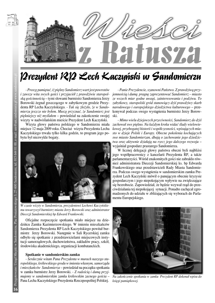Przygotowano: Urząd Miejski w Sandomierzu, Plac Poniatowskiego 3, 27-600 Sandomierz, tel. 015 644 01 00, e-mail: [email protected] www.sandomierz.pl 16 Prezydent RP Lech Kaczyński w Sandomierzu - Proszę pamiętać, iż piękny Sandomierz wart jest powrotów i zawsze wita swych gości i przyjaciół z prawdziwie staropolską gościnnością – tymi słowami burmistrz Sandomierza Jerzy Borowski żegnał goszczącego w zabytkowym grodzie Prezydenta RP Lecha Kaczyńskiego. - Tak się złożyło, że w Sandomierzu jeszcze nie byłem. Muszę przyznać, że Sandomierz jest piękniejszy niż myślałem – powiedział na zakończenie swojej wizyty w nadwiślańskim mieście Prezydent Lech Kaczyński. Wizyta głowy państwa polskiego w Sandomierzu miała miejsce 12 maja 2009 roku. Chociaż wizyta Prezydenta Lecha Kaczyńskiego trwała tylko kilka godzin, to program jego pobytu był niezwykle bogaty. - Panie Prezydencie, szanowni Państwo. Z prawdziwą przyjemnością i dumą pragnę zaprezentować Sandomierz – miasto ze wszech miar godne uwagi, zainteresowania i podziwu. To zabytkowy, staropolski gród stanowiący dziś prawdziwy skarb narodowego i europejskiego dziedzictwa kulturowego – przekonywał podczas swego wystąpienia burmistrz Jerzy Borowski. - Mimo wielu dziejowych przeciwności, Sandomierz do dziś zachował swe piękno. Na każdym kroku widać ślady wielowiekowej, przebogatej historii i współczesności, wpisujących miasto w dzieje Polski i Europy. Obecne pokolenia kochających swe miasto Sandomierzan, dbają o zachowanie jego dziedzictwa oraz aktywnie działają na rzecz jego dalszego rozwoju – wyjaśniał gospodarz prastarego Sandomierza. W licznej delegacji głowy państwa obecni byli najbliżsi jego współpracownicy z kancelarii Prezydenta RP, a także parlamentarzyści. Wśród znakomitych gości nie zabrakło również administratora Diecezji Sandomierskiej ks. bp Edwarda Frankowskiego oraz przedstawicieli Rady Miasta Sandomierza. Podczas swego wystąpienia w sandomierskim zamku Prezydent Lech Kaczyński mówił o panującym obecnie kryzysie gospodarczym i jego niepokojącym wpływie na zwiększające się bezrobocie. Zapowiedział, że będzie wzywał rząd do przeciwdziałania tej niepokojącej sytuacji. Ponadto zachęcał zgromadzonych do udziału w zbliżających się wyborach do Parlamentu Europejskiego. W czasie wizyty w Sandomierzu, prezydentowi Lechowi Kaczyńskiemu towarzyszył burmistrz miasta Jerzy Borowski oraz administrator Diecezji Sandomierskiej bp Edward Frankowski. Oficjalne rozpoczęcie spotkania miało miejsce na dziedzińcu Zamku Kazimierzowskiego. W imieniu mieszkańców Sandomierza Prezydenta RP Lech Kaczyńskiego powitał burmistrz Jerzy Borowski. Następnie w Sali Rycerskiej zamku odbyło się spotkanie z przedstawicielami miejscowych instytucji samorządowych, duchowieństwa, zakładów pracy, szkół, środowiska akademickiego, organizacji kombatanckich. Spotkanie w sandomierskim zamku - Serdecznie witam Pana Prezydenta w murach naszego staropolskiego, królewskiego grodu w imieniu własnym, samorządu i mieszkańców Sandomierza – powiedział na początku spotkania w zamku burmistrz Jerzy Borowski. - Z radością i dumą przyjmujemy w sandomierskim zamku królewskim zacnego gościa – Na zakończenie spotkania w zamku Prezydent RP dokonał wpisu do Pana Lecha Kaczyńskiego Prezydenta Rzeczpospolitej Polskiej. księgi pamiątkowej. Odznaczenia dla opozycjonistów Kolejnym punktem wizyty było wręczenie wysokich odznaczeń państwowych osobom, które przed 1989 rokiem, angażowały się w opozycji demokratycznej. Wśród odznaczonych znalazło się kilku działaczy z terenu Sandomierza. Na zakończenie spotkania w zamku Prezydent RP wpisał się w księdze pamiątkowej: „Z prawdziwą przyjemnością odwiedziłem Sandomierz prastary, polski gród. Piękno i niepowtarzalny, historyczny nastrój tego miasta sprawiły na mnie wielkie wrażenie. Gorąco pozdrawiam Sandomierz i wszystkich jego mieszkańców – wspaniałych ludzi, których tu spotkałem. Z uszanowaniem. Lech Kaczyński - Prezydent Rzeczpospolitej Polskiej”. Po spotkaniu w zamku Prezydent znalazł czas, aby zwiedzić katedrę oraz spotkać się z młodzieżą licealną z Collegium Gostomianum. Ostatnim punktem wizyty głowy państwa w Sandomierzu było spotkanie z mieszkańcami na Rynku Starego Miasta. Najważniejszą osobę w polskim państwie powitała Miejska Młodzieżowa Orkiestra Dęta. Po krótkim przemówieniu Prezydent Lech Kaczyński, w asyście sandomierskich harcerzy, złożył wieniec pod pamiątkową płytą na ścianie sandomierskiego ratusza. Zaraz potem wraz ze strażnikami miejskimi wieniec złożył także burmistrza Sandomierza Jerzy Borowski . Podczas uroczystego spotkania na sandomierskiej Starówce burmistrz Jerzy Borowski w asyście strażników miejskich złożył wieniec pod płytą upamiętniającą mieszkańców miasta, którzy zginęli w czasie wojny polsko – radzieckiej w 1920 roku. Zaproszenie do Sandomierza - Serdecznie dziękuję Panie Prezydencie za wizytę w Sandomierzu i spotkanie się z jego mieszkańcami. Pełen wdzięczności za odwiedziny naszego miasta i ciepłe słowa wypowiedziane pod jego adresem, w imieniu wszystkich Sandomierzan, pragnę przekazać Panu wedutę, autorstwa sandomierskiego artysty grafika Andrzeja Karwata, przedstawiającą widok prastarego Sandomierza – powiedział już na zakończenie wizyty Prezydenta RP burmistrz miasta Jerzy Borowski. - Proszę pamiętać, iż piękny Sandomierz wart jest powrotów i zawsze wita swych gości i przyjaciół z prawdziwie staropolską gościnnością. Gorąco dziękujemy Panie Prezydencie! – dodał na zakończenie wizyty Prezydenta w Sandomierzu burmistrz miasta Jerzy Borowski. Na zakończenie wizyty w Sandomierzu Prezydent Lech Kaczyński osobiście pożegnał zgromadzonych na Starówce mieszkańców miasta. Przygotowano: Urząd Miejski w Sandomierzu, Plac Poniatowskieg