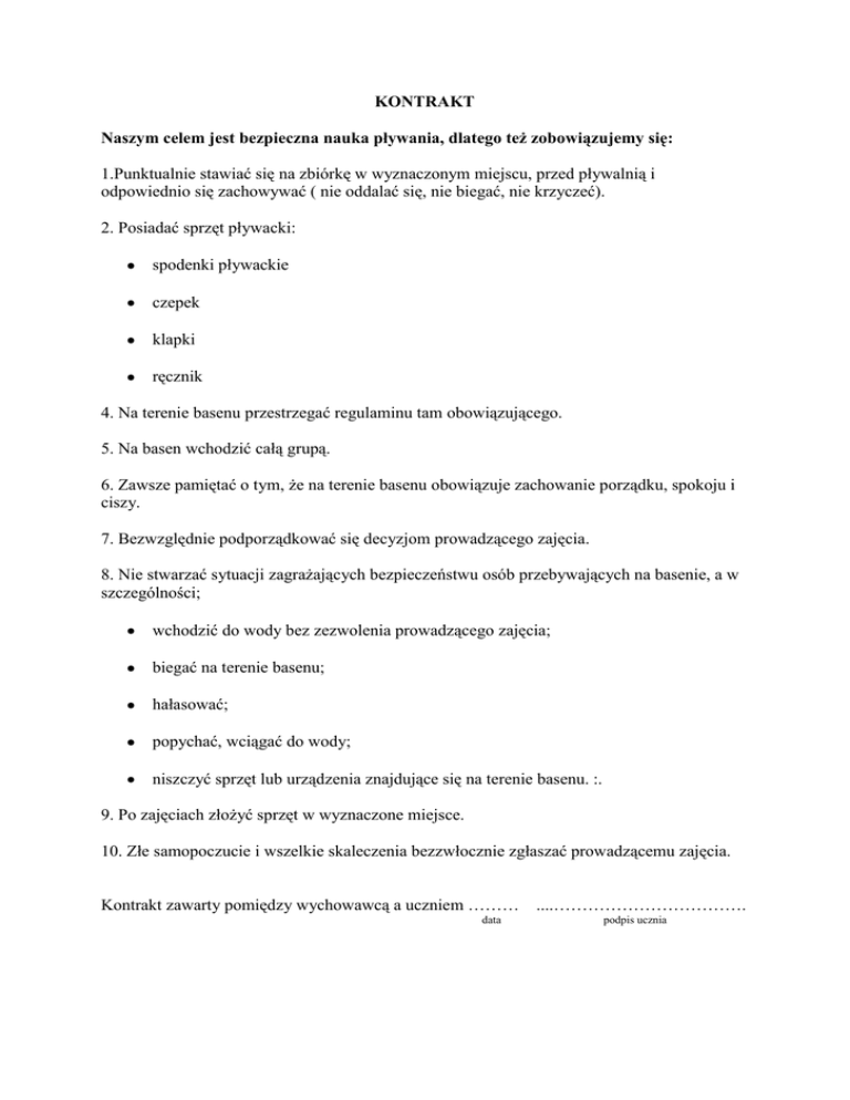 KONTRAKT Naszym celem jest bezpieczna nauka pływania, dlatego też zobowiązujemy się: 1.Punktualnie stawiać się na zbiórkę w wyznaczonym miejscu, przed pływalnią i odpowiednio się zachowywać ( nie oddalać się, nie biegać, nie krzyczeć). 2. Posiadać sprzęt pływacki: spodenki pływackie czepek klapki ręcznik 4. Na terenie basenu przestrzegać regulaminu tam obowiązującego. 5. Na basen wchodzić całą grupą. 6. Zawsze pamiętać o tym, że na terenie basenu obowiązuje zachowanie porządku, spokoju i ciszy. 7. Bezwzględnie podporządkować się decyzjom prowadzącego zajęcia. 8. Nie stwarzać sytuacji zagrażających bezpieczeństwu osób przebywających na basenie, a w szczególności; wchodzić do wody bez zezwolenia prowadzącego zajęcia; biegać na terenie basenu; hałasować; popychać, wciągać do wody; niszczyć sprzęt lub urządzenia znajdujące się na terenie basenu. :. 9. Po zajęciach złożyć sprzęt w wyznaczone miejsce. 10. Złe samopoczucie i wszelkie skaleczenia bezzwłocznie zgłaszać prowadzącemu zajęcia. Kontrakt zawarty pomiędzy wychowawcą a uczniem ……… data ....……………………………. podpis ucznia
