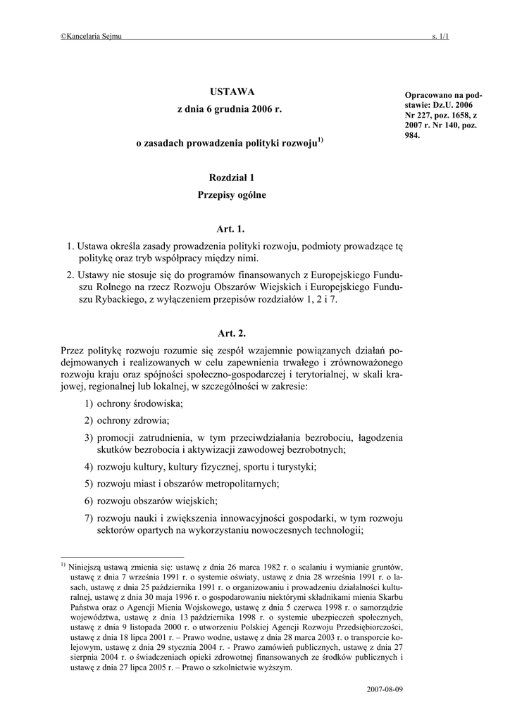 ©Kancelaria Sejmu s. 1/1 USTAWA Opracowano na podstawie: Dz.U. 2006 Nr 227, poz. 1658, z 2007 r. Nr 140, poz. 984. z dnia 6 grudnia 2006 r. o zasadach prowadzenia polityki rozwoju1) Rozdział 1 Przepisy ogólne Art. 1. 1. Ustawa określa zasady prowadzenia polityki rozwoju, podmioty prowadzące tę politykę oraz tryb współpracy między nimi. 2. Ustawy nie stosuje się do programów finansowanych z Europejskiego Funduszu Rolnego na rzecz Rozwoju Obszarów Wiejskich i Europejskiego Funduszu Rybackiego, z wyłączeniem przepisów rozdziałów 1, 2 i 7. Art. 2. Przez politykę rozwoju rozumie się zespół wzajemnie powiązanych działań podejmowanych i realizowanych w celu zapewnienia trwałego i zrównoważonego rozwoju kraju oraz spójności społeczno-gospodarczej i terytorialnej, w skali krajowej, regionalnej lub lokalnej, w szczególności w zakresie: 1) ochrony środowiska; 2) ochrony zdrowia; 3) promocji zatrudnienia, w tym przeciwdziałania bezrobociu, łagodzenia skutków bezrobocia i aktywizacji zawodowej bezrobotnych; 4) rozwoju kultury, kultury fizycznej, sportu i turystyki; 5) rozwoju miast i obszarów metropolitarnych; 6) rozwoju obszarów wiejskich; 7) rozwoju nauki i zwiększenia innowacyjności gospodarki, w tym rozwoju sektorów opartych na wykorzystaniu nowoczesnych technologii; 1) Niniejszą ustawą zmienia się: ustawę z dnia 26 marca 1982 r. o scalaniu i wymianie gruntów, ustawę z dnia 7 września 1991 r. o systemie oświaty, ustawę z dnia 28 września 1991 r. o lasach, ustawę z dnia 25 października 1991 r. o organizowaniu i prowadzeniu działalności kulturalnej, ustawę z dnia 30 maja 1996 r. o gospodarowaniu niektórymi składnikami mienia Skarbu Państwa oraz o Agencji Mienia Wojskowego, ustawę z dnia 5 czerwca 1998 r. o samorządzie województwa, ustawę z dnia 13 października 1998 r. o systemie ubezpieczeń społecznych, ustawę z dnia 9 listopada 2000 r. o utworzeniu Polskiej Agencji Rozwoju Przedsiębiorczości, ustawę z dnia 18 lipca 2001 r. – Prawo wodne, ustawę z dnia 28 marca 2003 r. o transporcie kolejowym, ustawę z dnia 29 stycznia 2004 r. - Prawo zamówień publicznych, ustawę z dnia 27 sierpnia 2004 r. o świadczeniach opieki zdrowotnej finansowanych ze środków publicznych i ustawę z dnia 27 lipca 2005 r. – Prawo o szkolnictwie wyższym. 2007-08-09 ©Kancelaria Sejmu s. 2/2 8) rozwoju zachowań prospołecznych wspólnot lokalnych oraz budowy i umacniania struktur społeczeństwa obywatelskiego; 9) rozwoju zasobów ludzkich, w tym podnoszenia poziomu wykształcenia społeczeństwa, kwalifikacji obywateli, jak również zapobiegania wykluczeniu społecznemu oraz łagodzeniu jego negatywnych skutków; 10) stymulowania powstawania nowych miejsc pracy; 11) tworzenia i modernizacji infrastruktury społecznej i technicznej; 12) wspierania i unowocześniania instytucji państwa; 13) wspierania rozwoju przedsiębiorczości; 14) wspierania wzrostu gospodarczego; 15) zwiększania konkurencyjności gospodarki. Art. 3. Politykę rozwoju prowadzą: 1) w skali kraju – Rada Ministrów; 2) w skali regionu – samorząd województwa; 3) w skali lokalnej – samorząd powiatowy i gminny. Art. 4. 1. Politykę rozwoju prowadzi się na podstawie strategii rozwoju. 2. Politykę rozwoju realizuje się, w szczególności, przy pomocy: 1) programów operacyjnych, służących osiąganiu celów, o których mowa w art. 2, przy wykorzystaniu środków publicznych; 2) strategii rozwoju kraju, strategii sektorowych oraz planów wykonawczych. 3. Polityka rozwoju może być prowadzona również na podstawie innych instrumentów prawnych i finansowych określonych w odrębnych przepisach. Art. 5. Użyte w ustawie określenia oznaczają: [1) beneficjent – osobę fizyczną, osobę prawną lub jednostkę organizacyjną nieposiadającą osobowości prawnej, której ustawa przyznaje zdolność prawną, realizującą projekty finansowane z budżetu państwa lub ze źródeł zagranicznych na podstawie umowy o dofinansowanie projektu;] <1) beneficjent – osobę fizyczną, osobę prawną lub jednostkę organizacyjną nieposiadającą osobowości prawnej, której ustawa przyznaje zdolność prawną, realizującą projekty finansowane z budżetu państwa lub ze źródeł zagranicznych na podstawie decyzji lub umowy o dofinansowanie projektu;> 2007-08-09 zmiany w art. 5 wchodzą w życie z dn. 18.08.2007 r. (Dz.U. z 2007 r. Nr 140, poz. 984) ©Kancelaria Sejmu s. 3/3 2) instytucja zarządzająca – właściwego ministra, ministra właściwego do spraw rozwoju regionalnego lub, w przypadku regionalnego programu operacyjnego, zarząd województwa, odpowiedzialnych za przygotowanie i realizację programu operacyjnego; [3) instytucja pośrednicząca – organ administracji publicznej lub inną jednostkę sektora finansów publicznych, której została powierzona, w drodze porozumienia zawartego z instytucją zarządzającą, część zadań związanych z realizacją programu operacyjnego;] <3) instytucja pośrednicząca – organ administracji publicznej lub inną jednostkę sektora finansów publicznych, której została powierzona, w drodze porozumienia zawartego z instytucją zarządzającą, część zadań związanych z realizacją programu operacyjnego; instytucja pośrednicząca pełni funkcje instytucji pośredniczącej w rozumieniu art. 2 pkt 6 rozporządzenia Rady (WE) nr 1083/2006 z dnia 11 lipca 2006 r. ustanawiającego przepisy ogólne dotyczące Europejskiego Funduszu Rozwoju Regionalnego, Europejskiego Funduszu Społecznego oraz Funduszu Spójności i uchylającego rozporządzenie (WE) nr 1260/1999 (Dz.Urz. UE L 210 z 31.07.2006, str. 25-78);> [4) instytucja wdrażająca – podmiot publiczny lub prywatny odpowiedzialny za realizację części lub całości priorytetów programu operacyjnego na podstawie odpowiednio porozumienia lub umowy o dofinansowanie realizacji powierzonych jej zadań;] <4) instytucja wdrażająca – podmiot publiczny lub prywatny, kt