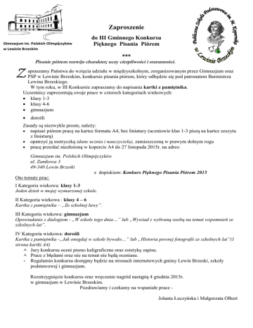Zaproszenie Gimnazjum im. Polskich Olimpijczyków w Lewinie Brzeskim do III Gminnego Konkursu Pięknego Pisania Piórem *** Pisanie piórem rozwija charakter; uczy cierpliwości i staranności. Z apraszamy Państwa do wzięcia udziału w międzyszkolnym, zorganizowanym przez Gimnazjum oraz PSP w Lewinie Brzeskim, konkursie pisania piórem, który odbędzie się pod patronatem Burmistrza Lewina Brzeskiego. W tym roku, w III Konkursie zapraszamy do napisania kartki z pamiętnika. Uczestnicy zaprezentują swoje prace w czterech kategoriach wiekowych: klasy 1-3 klasy 4-6 gimnazjum dorośli Zasady są niezwykle proste, należy: napisać piórem pracę na kartce formatu A4, bez liniatury (uczniowie klas 1-3 piszą na kartce zeszytu z liniaturą) opatrzyć ją metryczką (dane ucznia i nauczyciela), zamieszczoną w prawym dolnym rogu pracę przesłać niezłożoną w kopercie A4 do 27 listopada 2015r. na adres: Gimnazjum im. Polskich Olimpijczyków ul. Zamkowa 3 49-340 Lewin Brzeski z dopiskiem: Konkurs Pięknego Pisania Piórem 2015 Oto tematy prac: I Kategoria wiekowa: klasy 1-3 Jeden dzień w mojej wymarzonej szkole. II Kategoria wiekowa : klasy 4 – 6 Kartka z pamiętnika – „Ze szkolnej ławy”. III Kategoria wiekowa: gimnazjum Opowiadanie z dialogiem - „W szkole tego dnia…” lub „Wywiad z wybraną osobą na temat wspomnień ze szkolnych lat”. IV Kategoria wiekowa: dorośli Kartka z pamiętnika -„Jak onegdaj w szkole bywało…” lub „Historia pewnej fotografii ze szkolnych lat”(1 strona kartki A4) Jury konkursu oceni pismo kaligraficzne oraz estetykę zapisu. Prace z błędami oraz nie na temat nie będą oceniane. Regulamin konkursu dostępny będzie na stronach internetowych gminy Lewin Brzeski, szkoły podstawowej i gimnazjum. Rozstrzygnięcie konkursu oraz wręczenie nagród nastąpią 4 grudnia 2015r. w gimnazjum w Lewinie Brzeskim. Pozdrawiamy i czekamy na wspaniałe prace Jolanta Łuczyńska i Małgorzata Olbert