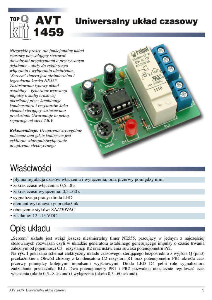 AVT 1459 Uniwersalny uk³ad czasowy Niezwykle prosty, ale funkcjonalny uk³ad czasowy pozwalaj¹cy sterowaæ dowolnymi urz¹dzeniami o przerywanym dzia³aniu – s³u¿y do cyklicznego w³¹czania i wy³¹czania obci¹¿enia. ‘Sercem’ timera jest nieœmiertelna i legendarna kostka NE555. Zastosowano typowy uk³ad astabilny – generator wytwarza impulsy o sta³ej czasowej okreœlonej przez kombinacje kondensatora i rezystorów. Jako element steruj¹cy zastosowano przekaŸnik. Gwarantuje to pe³n¹ separacjê od sieci 230V. Rekomendacje: Urz¹dzenie szczególnie polecane tam gdzie konieczne jest cykliczne w³¹czanie/wy³¹czanie urz¹dzenia elektrycznego W³aœciwoœci • p³ynna regulacja czasów w³¹czenia i wy³¹czenia, oraz przerwy pomiêdzy nimi • zakres czasu w³¹czenia: 0,5...8 s • zakres czasu wy³¹czenia: 0,5...60 s • sygnalizacja pracy: dioda LED • element wykonawczy: przekaŸnik • obci¹¿enie styków: 8A/230VAC • zasilanie: 12...15 VDC Opis uk³adu „Sercem” uk³adu jest wci¹¿ jeszcze nieœmiertelny timer NE555, pracuj¹cy w jednym z najczêœciej stosowanych rozwi¹zañ czyli w uk³adzie generatora astabilnego generuj¹cego impulsy o czasie trwania zale¿nym od pojemnoœci C3, rezystancji R2 oraz ustawienia suwaka potencjometru Pr2. Na rys. 1 pokazano schemat elektryczny uk³adu czasowego, steruj¹cego bezpoœrednio z wyjœcia Q (pin3) przekaŸnikiem. Obwód z³o¿ony z kondensatora C2 rezystora R1 oraz potencjometru PR1 okreœla czas przerwy pomiêdzy kolejnymi impulsami wyjœciowymi. Dioda LED D4 pe³ni rolê sygnalizatora zadzia³ania przekaŸnika RL1. Dwa potencjometry PR1 i PR2 pozwalaj¹ niezale¿nie regulowaæ czas w³¹czenia (oko³o 0,5...8 sekund) i wy³¹czenia (oko³o 0,5...60 sekund). AVT 1459 Uniwersalny uk³ad czasowy 1 PR1 50k D2 R1 1k CON1 D1 8 1N4148 1N4148 5 TRIG CVolt Q DIS GND 2 R VCC U1 4 THR ARK2 3 CON2 R2 1k 6 REL1 ARK3 R3 1k NE555 1 C2 100u RL1 7 C1 100n PR2 100k D4 LED D3 1N4148 C3 100u Rys. 1 Schemat elektryczny Monta¿ i uruchomienie Na rys. 2 pokazano rozmieszczenie elementów na p³ytce drukowanej. Monta¿ jest typowy, a uk³ad zmontowany ze sprawnych elementów nie wymaga ¿adnej regulacji i w³¹czeniu zasilania dzia³a natychmiast poprawnie. Uk³ad znajdzie szereg zastosowañ, nie tylko do sterowania migaj¹cymi ¿arówkami, ale te¿ w fotografii, modelarstwie i w ró¿nych automatycznych urz¹dzeniach. Urz¹dzenie mo¿e byæ zasilane napiêciem 12...15V z zasilacza, baterii lub akumulatora i pobiera nie wiêcej ni¿ 100mA pr¹du Rys. 2 Rozmieszczenie elementów na p³ytce drukowanej 2 AVT 1459 Uniwersalny uk³ad czasowy Wykaz elementów Rezystory R1 ... R3 :......................1kW PR1:..............................50kW PR2:..............................100kW Kondensatory C1: ................................100nF C2, C3: ..........................100mF/25 Pó³przewodniki U1: ................................NE555 D1...D3:.........................1N4148 D4: ................................LED Pozosta³e CON1 ............................ARK2 CON2 ............................ARK3 RL1 ...............................RM96P12 lub odpowiednik Zestaw powsta³ na podstawie projektu o tym samym tytule opublikowanego w Elektronice Praktycznej 12/07 www.ep.com.pl Oferta zestawów do samodzielnego monta¿u dostêpna jest na stronie internetowej www.sklep.avt.pl Producent: AVT-Korporacja sp. z o.o. tel.: (22) 257-84-50 ul. Leszczynowa 11 fax: (22) 257-84-55 03-197 Warszawa AVT 1459 Uniwersalny uk³ad czasowy Dzia³ pomocy technicznej: tel.:(22) 257-84-58 [email protected] 3 Notatki 4 AVT 1459 Uniwersalny uk³ad czasowy