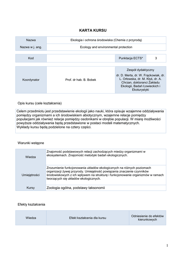 KARTA KURSU Nazwa Ekologia i ochrona środowiska (Chemia z przyrodą) Nazwa w j. ang. Ecology and environmental protection Kod Punktacja ECTS* 3 Zespół dydaktyczny Koordynator Prof. dr hab. B. Bobek dr. D. Merta, dr. W. Frąckowiak, dr. L. Orłowska, dr. M. Kłyś, dr. A. Chrzan, doktoranci Zakładu Ekologii, Badań Łowieckich i Ekoturystyki Opis kursu (cele kształcenia) Celem przedmiotu jest przedstawienie ekologii jako nauki, która opisuje wzajemne oddziaływania pomiędzy organizmami a ich środowiskiem abiotycznym, wzajemne relacje pomiędzy populacjami jak również relacje pomiędzy osobnikami w obrębie populacji. W miarę możliwości powyższe oddziaływania będą przedstawione w postaci modeli matematycznych. Wykłady kursu będą podzielone na cztery części. Warunki wstępne Wiedza Umiejętności Kursy Znajomość podstawowych relacji zachodzących miedzy organizmami w ekosystemach. Znajomość metodyki badań ekologicznych. Zrozumienie funkcjonowania układów ekologicznych na różnych poziomach organizacji żywej przyrody. Umiejętność powiązania znaczenie czynników środowiskowych z ich wpływem na strukturę i funkcjonowanie organizmów w ramach tworzących się układów ekologicznych. Zoologia ogólna, podstawy taksonomii Efekty kształcenia Wiedza Efekt kształcenia dla kursu Odniesienie do efektów kierunkowych 1 Wykłady: W01 ma wiedzę na temat diety zwierząt K_W23 W02 wymienia czynniki wpływające na poziom metabolizmu K_W23 W03 zna elementy budżetu energetycznego zwierząt K_W23 W04 wymienia wskaźniki bioróżnorodności K_W24, K_W26 W05 objaśnia eutrofizację rolnictwa K_W24 W06 definiuje fragmentację środowiska K_W24, K_W26 W07 wymienia czynniki zmniejszające negatywny wpływu infrastruktury drogowej na środowisko przyrodnicze K_W24, K_W26 W08 identyfikuje gatunki wskaźnikowe zanieczyszczeń środowiska (HSI) K_W24, K_W26 W09 zna biomonitoring zanieczyszczeń środowiska K_W24 W10 zna biologiczne podstawy zwalczania szkodników K_W26 W11 omawia zintegrowane wskaźniki waloryzacji środowiska przyrodniczego dla populacji zwierząt K_W29 Ćwiczenia: Umiejętności W01 Zna podstawowe pojęcia ekologiczne K_W23 W02 Ma wiedzę na temat oceny liczebności zwierzyny K_W12 W03 Wymienia podstawowe przystosowania organizmów do funkcjonowania w środowisku K_W23 W04 Wykazuje podstawową wiedzę na temat preferencji siedliskowych wybranych grup zwierząt K_W23 W05 Zna podstawowe techniki obliczeń zagęszczeń, i śmiertelności osobników K_W12 W06 Orientuje się jaki jest wpływu człowieka na kształtowanie ekosystemów lądowych i wodnych. K_W24 Efekt kształcenia dla kursu Odniesienie do efektów kierunkowych 2 Wykłady: U01 objaśnia strawność pokarmu przez zwierzęta K_U23 U02 dokonuje syntezy tabele życia i krzywych przeżywania K_U23 U03 analizuje modele regulacji liczebności populacji K_U20 U04 objaśnia czynniki kształtujące dynamikę liczebności K_U23 populacji (reprodukcja, śmiertelność, migracje, rola zmian klimatycznych w funkcjonowaniu populacji zwierząt i roślin) U05 dokonuje syntezy tabele życia i krzywych przeżywania K_U23 U06 analizuje poziom herbicydów i pestycydów K_U23, K_U24 Ćwiczenia: U01 stosuje podstawowe metody oceny liczebności zwierząt K_U23 U02 analizuje podstawowe zależności między organizmami w oparciu o tabele i wykresy K_U23 U03 umiejętność wyciągania odpowiednich wniosków podczas pracy z danymi K_U23 U04 charakteryzuje środowisko życia wybranych gatunków zwierząt oraz wielkość ich populacji K_U22 Efekt kształcenia dla kursu Odniesienie do efektów kierunkowych Wykłady: Kompetencje społeczne K01 efektywnie działa indywidualnie według wskazówek oraz wykazuje zdolność do poszerzania zdobytej wiedzy K_K11 K02 potrafi dokonać krytycznej analizy informacji z zakresu chemii środowiska funkcjonujących w życiu społecznym K_K08 Ćwiczenia: K01 organizuje efektywnie pracę w zespole K_K02 K02 jest świadomy stosowania zasad bioetyki K_K14 K03 rozumie konieczność ustawicznego uczenia się K_K05 3 Organizacja Ćwiczenia w grupach Wykład Forma zajęć (W) A Liczba godzin K L 10 S P E 30 Opis metod prowadzenia zajęć Wykłady: Metoda podająca: wykład w formie prezentacji multimedialnej. (Obejmują przedstawienie wzajemnych powiązań ekologii z chemią, przedstawiają wyniki badań ekologicznych, które obecnie są podstawą do działań związanych z szeroko pojęta ochrona środowiska przyrodniczego i chemizacją środowiska przyrodniczego.) Ćwiczenia: Metoda praktyczna: w trakcie zajęć student przeprowadza modelowe doświadczenia, samodzielnie rozwiązuje zadania z zakresu ekologii. (Obejmują podstawowe pojęcia ekologiczne, wiedzę na temat oceny liczebności zwierzyny drobnej i grubej, podstawowe przystosowania organizmów do funkcjonowania w środowisku. Wpływ człowieka na kształtowanie ekosystemów lądowych i wodnych.) Ćwiczenia: W01 W02 W03 W04 W05 W06 U01 U02 U03 U04 Inne Egzamin pisemny Egzamin ustny Praca pisemna (esej) Referat Udział w dyskusji Projekt grupowy Projekt indywidualny Praca laboratoryjna Zajęcia terenowe Ćwiczenia w szkole Gry dydaktyczne E – learning Formy sprawdzania efektów kształcenia X X X X X X X X X X 4 X K01 K02 K03 Wykłady: W01 W02 W03 W04 W05 W06 W07 W08 W09 W10 W11 U01 U02 U03 U04 U05 U06 K01 K02 X X X X X X X X X X X X X X X X X X X X X Forma zaliczenia: Kryteria oceny Ćwiczenia: kolokwium pisemne (jest podstawą przystąpienia do egzaminu). Wykłady: egzamin pisemny na koniec semestru. Uwagi Treści merytoryczne (wykaz tematów) Tematyka wykładów obejmie następujące zagadnienia: 1. 2. 3. 4. Ekofizjologia osobników Ekologia populacji Waloryzacja środowiska przyrodniczego Wykorzystanie ekologii do ochrony środowiska Tematyka ćwiczeń obejmie następujące zagadnienia: 1. 2. 3. 4. Adaptacje organizmów do różnych środowisk. Ocena liczebności zwierzyny grubej. Ocena liczebności zwierzyny drobnej. Preferencje siedlis