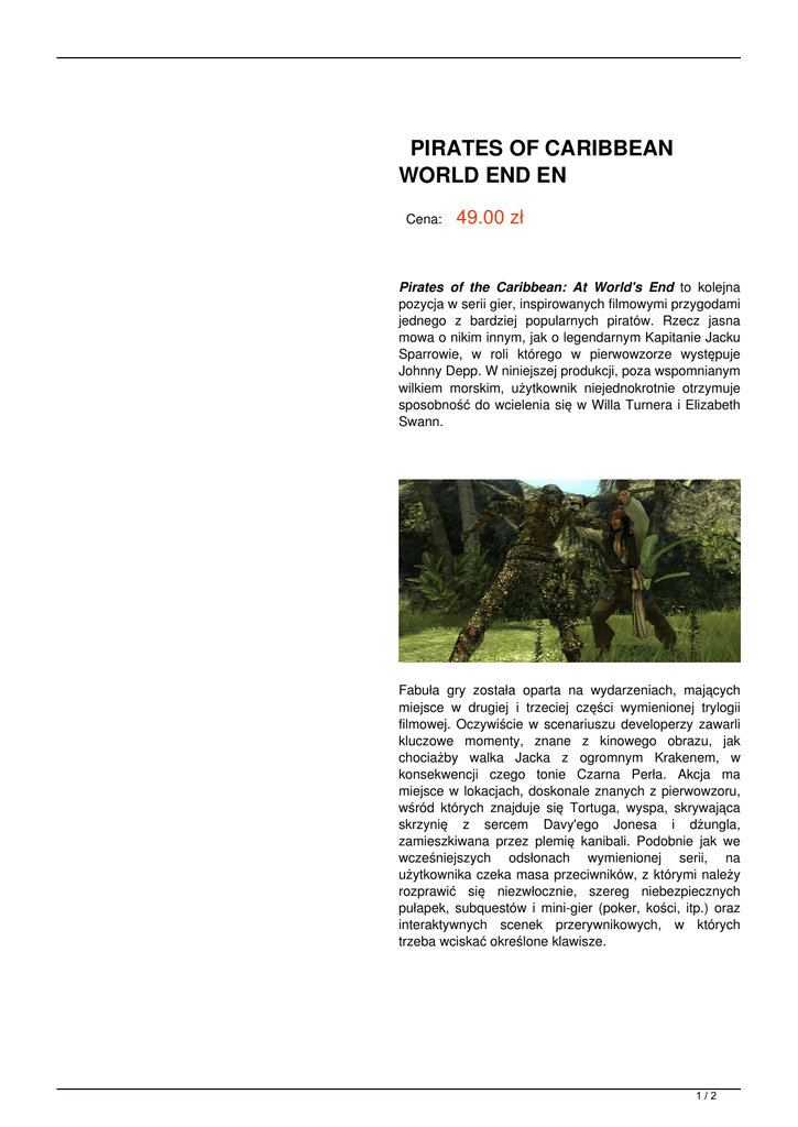 PIRATES OF CARIBBEAN WORLD END EN Cena: 49.00 zł Pirates of the Caribbean: At World's End to kolejna pozycja w serii gier, inspirowanych filmowymi przygodami jednego z bardziej popularnych piratów. Rzecz jasna mowa o nikim innym, jak o legendarnym Kapitanie Jacku Sparrowie, w roli którego w pierwowzorze występuje Johnny Depp. W niniejszej produkcji, poza wspomnianym wilkiem morskim, użytkownik niejednokrotnie otrzymuje sposobność do wcielenia się w Willa Turnera i Elizabeth Swann. Fabuła gry została oparta na wydarzeniach, mających miejsce w drugiej i trzeciej części wymienionej trylogii filmowej. Oczywiście w scenariuszu developerzy zawarli kluczowe momenty, znane z kinowego obrazu, jak chociażby walka Jacka z ogromnym Krakenem, w konsekwencji czego tonie Czarna Perła. Akcja ma miejsce w lokacjach, doskonale znanych z pierwowzoru, wśród których znajduje się Tortuga, wyspa, skrywająca skrzynię z sercem Davy'ego Jonesa i dżungla, zamieszkiwana przez plemię kanibali. Podobnie jak we wcześniejszych odsłonach wymienionej serii, na użytkownika czeka masa przeciwników, z którymi należy rozprawić się niezwłocznie, szereg niebezpiecznych pułapek, subquestów i mini-gier (poker, kości, itp.) oraz interaktywnych scenek przerywnikowych, w których trzeba wciskać określone klawisze. 1/2 Podczas rozgrywki, w pewnych, określonycn miejscach istnieje możliwość zmiany prowadzonego bohatera (Jack, Will, Elizabeth oraz kapitan Barbossa). Ponadto, można oblokować ukryte postacie grywalne, co niejednokrotnie doprowadza do zabawnych sytuacji (np. dwie takie same osoby na ekranie). Warto również wspomnieć, że protagoniści dysponują zróżnicowanymi umiejętnościami, atakami specjalnymi i ciosami wykończeniowymi. W celu wzmocnienia natarcia na przeciwnika powinno się posłużyć przedmiotami, znalezionymi w pobliżu miejsca starcia (np. pistolet albo bomby). Potyczkom towarzyszy ścieżka dźwiękowa, zaczerpnięta z filmowego pierwowzoru. Zobacz wideo: 2/2 Powered by TCPDF (www.tcpdf.org)