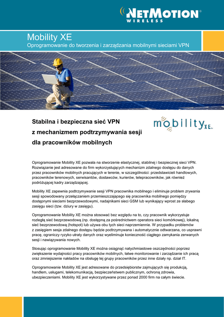 Mobility XE Oprogramowanie do tworzenia i zarządzania mobilnymi sieciami VPN Stabilna i bezpieczna sieć VPN z mechanizmem podtrzymywania sesji dla pracowników mobilnych Oprogramowanie Mobility XE pozwala na stworzenie elastycznej, stabilnej i bezpiecznej sieci VPN. Rozwiązanie jest adresowane do firm wykorzystujących mechanizm zdalnego dostępu do danych przez pracowników mobilnych pracujących w terenie, w szczególności: przedstawicieli handlowych, pracowników terenowych, serwisantów, dostawców, kurierów, telepracowników, jak również podróżującej kadry zarządzającej. Mobility XE zapewnia podtrzymywanie sesji VPN pracownika mobilnego i eliminuje problem zrywania sesji spowodowany przełączaniem przemieszczającego się pracownika mobilnego pomiędzy dostępnymi sieciami bezprzewodowymi, nadajnikami sieci GSM lub wynikający wprost ze słabego zasięgu sieci (tzw. dziury w zasięgu). Oprogramowanie Mobility XE można stosować bez względu na to, czy pracownik wykorzystuje rozległą sieć bezprzewodową (np. dostępną za pośrednictwem operatora sieci komórkowej), lokalną sieć bezprzewodową (hotspot) lub używa obu tych sieci naprzemiennie. W przypadku problemów z zasięgiem sesja zdalnego dostępu będzie podtrzymywana i automatycznie odtwarzana, co usprawni pracę, ograniczy ryzyko utraty danych oraz wyeliminuje konieczność ciągłego zamykania zerwanych sesji i nawiązywania nowych. Stosując oprogramowanie Mobility XE można osiągnąć natychmiastowe oszczędności poprzez zwiększenie wydajności pracy pracowników mobilnych, łatwe monitorowanie i zarządzanie ich pracą oraz zmniejszenie nakładów na obsługę tej grupy pracowników przez inne działy np. dział IT. Oprogramowanie Mobility XE jest adresowane do przedsiębiorstw zajmujących się produkcją, handlem, usługami, telekomunikacją, bezpieczeństwem publicznym, ochroną zdrowia, ubezpieczeniami. Mobility XE jest wykorzystywane przez ponad 2000 firm na całym świecie. Mobility XE Oprogramowanie do tworzenia i zarządzania mobilnymi sieciami VPN Architektura Mobility XE jest zintegrowanym i scentralizowanym rozwiązaniem mobilnej sieci VPN pracującym w architekturze klient/serwer. Oprogramowanie serwera Mobility XE jest instalowane wewnątrz sieci firmowej (za firewall-em) lub w strefie zdemilitaryzowanej (DMZ), a niewielki moduł klienta Mobility XE na urządzeniach mobilnych takich jak: laptopy, tablety, terminale mobilne lub telefony komórkowe. Łatwość wdrożenia Wdrożenie Mobility XE zajmuje kilka godzin i nie wymaga ingerencji w strukturę IT przedsiębiorstwa ani uzupełniania wykorzystywanych przez firmę systemów WMS, ERP czy CRM o dodatkowe moduły czy funkcje. W odróżnieniu od innych rozwiązań VPN, Mobility XE nie wymaga złożonej konfiguracji parametrów algorytmu szyfrowania VPN, czasów ważności kluczy czy okresu aktywności sesji. Mobilna sieć VPN oferowana przez Mobility XE jest siecią typu „zawsze włączona”, co czyni ją niezauważalną i eliminuje konieczność szkolenia użytkowników z zasad jej obsługi. Bezpieczeństwo Mobility XE, oprócz typowych dla sieci VPN mechanizmów szyfrowania danych, oferuje możliwość wykorzystania zdecydowanie mocniejszego algorytmu FIPS 140-2. Zapewnia również uwierzytelnianie użytkownika lub urządzenia mobilnego przy użyciu certyfikatów, serwera Radius, NTLM lub innych, dedykowanych rozwiązań. Mobility XE może również ograniczać dostęp do danych lub aplikacji zgodnie z zadanymi zasadami. Optymalizacja Mobility XE jest rozwiązaniem optymalizowanym pod kątem użycia w sieciach bezprzewodowych o niskiej szybkości działania. Wbudowane mechanizmy: kompresji danych, QoS i zarządzania pasmem pozwalają na aktywne i skuteczne administrowanie dostępem poszczególnych aplikacji do sieci bezprzewodowej w zależności od jej aktualnej przepustowości. Zarządzanie Dzięki scentralizowanej konsoli administracyjnej oprogramowanie Mobility XE jest łatwe w konfiguracji, utrzymaniu i zarządzaniu. Dostępny opcjonalnie moduł analityczny pozwala na analizę sposobu wykorzystania urządzeń mobilnych przez pracowników, monitorowanie pracy kanału VPN i wykorzystujących go aplikacji. Możliwe jest również zablokowanie dostępu do kanału VPN jeśli urządzenie nie spełni określonych wymagań np. wersji systemu operacyjnego, zainstalowanych poprawek lub oprogramowania antywirusowego. Aby dowiedzieć się więcej Więcej informacji o Mobility XE można znaleźć na stronach internetowych firmy CDS www.cds.pl oraz producenta oprogramowania www.netmotionwireless.com. Aby przetestować rozwiązanie Mobility XE prosimy o kontakt z naszym biurem. Oprogramowanie Mobility XE jest dostępne w Polsce za pośrednictwem CDS Sp. z o.o., partnera firmy NetMotion Wireless Inc. Firma CDS od ponad 15 lat specjalizuje się w rozwiązaniach mobilnych dla przemysłu, handlu i dystrybucji. CDS Sp. z o.o. ul. Fosa 25, 02-768 Warszawa tel.: 22 853 35 81, fax: 22 847 63 68 e-mail: [email protected], www.cds.pl