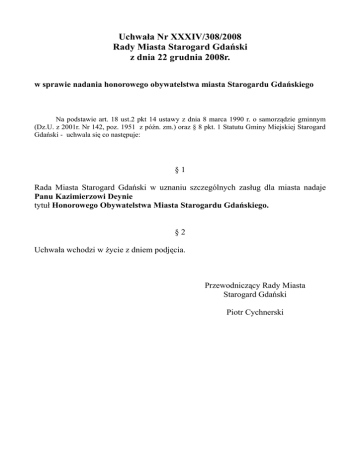 Uchwała Nr XXXIV/308/2008 Rady Miasta Starogard Gdański z dnia 22 grudnia 2008r. w sprawie nadania honorowego obywatelstwa miasta Starogardu Gdańskiego Na podstawie art. 18 ust.2 pkt 14 ustawy z dnia 8 marca 1990 r. o samorządzie gminnym (Dz.U. z 2001r. Nr 142, poz. 1951 z późn. zm.) oraz § 8 pkt. 1 Statutu Gminy Miejskiej Starogard Gdański - uchwala się co następuje: §1 Rada Miasta Starogard Gdański w uznaniu szczególnych zasług dla miasta nadaje Panu Kazimierzowi Deynie tytuł Honorowego Obywatelstwa Miasta Starogardu Gdańskiego. §2 Uchwała wchodzi w życie z dniem podjęcia. Przewodniczący Rady Miasta Starogard Gdański Piotr Cychnerski Uzasadnienie Kazimierz Deyna (1974-1989) był jednym z najlepszych piłkarzy w historii polskiej piłki nożnej. Zawodnik m.in. Włókniarza Starogard Gdański, Legii Warszawa, Manchester City, San Diego, Sockers. W 1974 roku uznany za trzeciego gracza mistrzostw świata i zdobywca Brązowej Piłki tygodnika „France Football”. Sześciokrotnie znajdował się w pierwszej dziesiątce najlepszych sportowców w plebiscycie „Przeglądu Sportowego”. Zwyciężył w klasyfikacji na najlepszego piłkarza 70-lecia, 75-lecia i 80-lecia PZPN. Z wnioskiem o nadanie Kazimierzowi Deynie tytułu Honorowego Obywatelstwa Miasta wystąpiła Komisja Kultury i Promocji Rady Miasta. W dniu 24.10.2008r. Kapituła Honorowego Obywatelstwa Miasta Starogard Gdański, rozparzyła powyższy wniosek i jednomyślnie zaopiniowała go pozytywnie. Przewodniczący Kapituły Honorowego Obywatelstwa Piotr Cychnerski