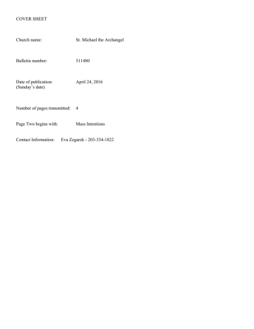 COVER SHEET Church name: St. Michael the Archangel Bulletin number: 511480 Date of publication: (Sunday’s date) April 24, 2016 Number of pages transmitted: 4 Page Two begins with: Mass Intentions Contact Information: Eva Zegarek - 203-334-1822 St. MICH@EL th_ @r]h[ng_l P[rish Conventual FRANCISCAN Friars, 310 PULASKI St. BRIDGEPORT, CT 06608 SUNDAY VIGIL MASS (Saturdays): 4:00pm (in English) Sundays: 7:00am & 11:00am (in Polish); 9:00am (in English) DAILY MASSES: Monday - Friday 7:00am (in Polish); 8:00am (in English) 6:30AM - 6:55AM - Eucharistic Adoration Saturdays 7:30am (in Polish) HOLY DAY of OBLIGATION: 8:00am & 12 noon (in English) 7:00am & 7:00pm (in Polish) Sacrament of Reconciliation: before every Holy Mass Sakrament Pojednania: przed każdą Mszą św. First FRIDAY - I. Piątek miesiąca: 7:00pm Holy MASS & Adoration First SATURDAY - I. Sobota: 8:00am - 12 noon Eucharistic Adoration RECTORY: 203-334-1822; FAX: 203-696-0078 www.SMAPARISH.com Conventual Franciscan Friars Fr. Michał Nowak OFM Conv. - pastor Fr. Stefan Morawski OFM Conv. - parochial vicar Fr. George Maslar OFM Conv. - in residence Office Hours: Kancelaria Parafialna: Monday to Friday Od poniedziałku do piątku 8:00 AM to 2:00 PM Od 8:00 rano do 2:00 po południu Rectory (203) 334-1822; e-mail: [email protected] Chairperson of Finance Council - Urszula Ochman DIRECTOR OF RELIGIOUS EDUCATION - ROXANNE AMIOT 203-572-2374 e-mail: [email protected] SACRAMENT OF RECONCILIATION SAKR. POJEDNANIA: before every Holy Mass / przed każdą Mszą św. BAPTISM - CHRZEST ŚWIĘTY: Arrangements must be made in advance. Pre-Baptismal instructions mandatory for Parents and God-Parents. MARRIAGE - SAKR. MAŁŻEŃSTWA: Arrangements must be made at least 8 months in advance. Pre-Cana Classes in the Diocese are mandatory. HOLY MASS INTENTIONS Sunday - Niedziela - April 24 7:00 † Julian i Jadwiga Orpik - córka z rodziną 9:00 † Deceased members of Lusniak and Ataman Franciszek and Aniela Lusniakl 11:00 For our Parishioners - za Parafian Thursday - Czwartek - April 28 7:00 † Jan i Helena Kiełbasa - siostra Weronika 8:00 † Wiesława and Andrzej Janucik Eugienia and Edward Okula Monday - Poniedziałek - April 25 7:00 † Richard Franes, Jr - babcia 8:00 † Anna Landock - daughter Friday - Piątek - April 29 7:00 † Anna Gołaszewska - ciocia 8:00 † John Marek - Marek family 7:00PM Msza Sw. Tuesday - Wtorek - April 26 7:00 † Zofia i Mieczysław Haraburda - syn z rodziną 8:00 † Stanisław, Janina, Stanisław Karczewscy córka i siostra Saturday - Sobota - April 30 7:30 † Czesław Kozioł - rodzina 4PM † Jozef & Teodora - family 5PM-8PM Dzień Skupienia Wendnesday - Środa - April 27 7:00 † Zmarli z rodziny Łapiński - rodzina Łapiński 8:00 † Veronica Wasinski - Maria, Andrzejej and Monica Mocalski 6:30PM Adoracja 7PM Msza Sw. Sunday - Niedziela - May 1 7:00 † Stanisław Wołpiuk - Alina Plona 9:00 † Michno, Socha, Bereza families - Francine 11:00 For our Parishioners - za Parafian The 2nd collection Maintenance and Repairs. First collection Thank you! next Sunday will be for from last Sunday was $2587. Thank you for donations of $200 in honor of Halina & Tony Okula 50th wedding anniversary from Barbara Stefanska, $200 in memory of Jean & Joseph Borkowski from Ann & Henry Rastelli, and $9.045 for bathroom remodeling. God bless you! Visit of the Relics of the Incorrupt Heart of St John Vianney May 3-5, 2016 St. Mary Church, 178 Greenwich Ave, Greenwich, CT ; (203) 869-9393 Information: stmarygreenwich.org Tue, May 3/ 5:30pm Procession and Reception of the Relic 7:30pm - Mass with Bishops Caggiano Wed, May 4/ 7:00am Church opens for Vocations of the Relic 7:30pm Latin Mass with rev. G. Rutler Thu, May 5/ 7:00am Church opens for Vocations of the Relic 9:00am Closing Mass Sacrament of Marriage. Neiman Arthur Ramjattan i Stephanie Joanna Kyc are planning to get the Sacrament of Marriage. If you know why to object to this, you should notify the Parish Office. Also, we ask for the prayer of the faithful for the engaged couple. . Druga kolekta w nastepną niedzielę będzie przeznaczona na naprawę obiektów parafialnych. Ofiara z 1-szej kolekty w ostatnią niedzielę wyniosła $2587. Bóg zapłać! Dziękujemy za donację $200 z okazji 50tej rocznicy slubu Haliny i Antoniego Okula od Barbary Stefanskiej, $200 ku pamięci Jean and Joseph Borkowski from Ann i Henry Rastelli, oraz za pieniądze na remont naszych łazienek w kosciele (do tej pory zebralismy łącznie $9.045 na ten cel). Bóg zapłać za wszystkie ofiary! Dzień Skupienia dla naszej Parafii odbędzie się w sobotę 30 kwietnia, w godzinach 5PM - 8PM. Gorąco wszystkich zapraszamy. Zapowiedzi przedmałżeńskie . Sakramentalny związek małżeński pragną zawrzeć: Neiman Arthur Ramjattan i Stephanie Joanna Kyc. Narzeczonych polecamy modlitwie wiernych, a kto zna przeszkody uniemożliwiające im zawarcie sakramentu małżeństwa powinien o tym powiadomić Biuro Parafiale. Zapowiedz druga. St. Paul in the First Letter to the Corinthians describes love in the first place and he mentions love is patient. It is very important to be patient in situations which you find yourself and to the people who surround you and to your feelings, emotions and also to God. God is enormously patient directly with me. In this way, shows me that He loves me. In the situations of my rebellion, my failures, laziness, my falls will not lose to the abyss of hell, but constantly, patiently in different ways trying to bring me to repentance. Even when I would give it a rest already. It is important for me to remember His patience before I accuse someone, punish or pass judgment. It is also important for me to be patient without complaining waiting for the moment when He shows me His love in a more tangible way, wonderfully satisfying my needs. In this way Jesus will know that I also love Him. Because after all, Love is Patient. Annual Catholic Apeeal Our Parish Goal for this yea