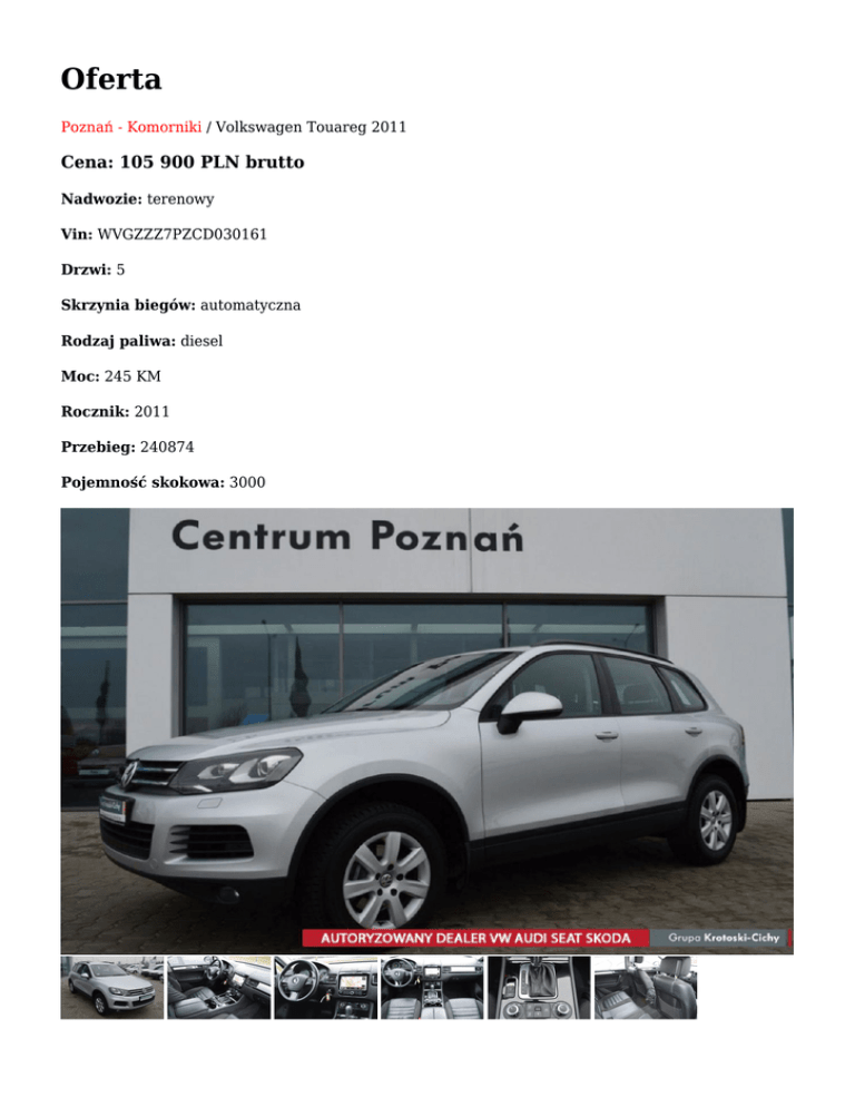 Oferta Poznań - Komorniki / Volkswagen Touareg 2011 Cena: 105 900 PLN brutto Nadwozie: terenowy Vin: WVGZZZ7PZCD030161 Drzwi: 5 Skrzynia biegów: automatyczna Rodzaj paliwa: diesel Moc: 245 KM Rocznik: 2011 Przebieg: 240874 Pojemność skokowa: 3000 Wyposażenie: abs, kontroli trakcji (asr), regulacja wysokosci fotela, dzielona tyłna kanapa, kierownica wielofunkcyjna, autoalarm, immobiliser, centralny zamek, elektryczne szyby przednie, elektryczne szyby tyłne, elektryczne lusterka, światła przeciwmgielne, czujniki parkowania - tył, komputer pokładowy, nawigacja satelitarna, podgrzewane fotele, regulowana kierownica, tempomat, wspomaganie kierownicy, felgi aluminiowe, przyciemniane szyby, relingi, regulowana wysokosc podwozia, system start-stop, automat. hamulec postojowy, bluetooth, blokada drzwi podczas jazdy, automatyczne światła, elektrochromatyczne lusterko wsteczne, podgrzewana tyłna szyba, podgrzewane lusterka boczne, regulowane zawieszenie, stabilizacja toru jazdy (esp), poduszki pow. kurtynowe - przód, poduszka pow. chroniaca kolana, poduszka pow. pasażera, poduszka pow. kierowcy, reflektory biksenony, czujniki parkowania - przód, elektrycznie ustawiane fotele, gniazdo sd, poduszki pow. boczne - przód, zestaw glosnomowiacy, światła do jazdy dziennej, skórzana kierownica Informacje dodatkowe: bezwypadkowy, serwisowany w aso, ksiażka serwisowa, możliwa zamiana, stan bardzo dobry Opis: Auto-Handel-Centrum Krotoski-Cichy Autoryzowany Dealer VW Audi Seat Skoda GWARANCJA POCHODZENIA MOŻLIWOŚĆ SPRAWDZENIA POJAZDU W AUTORYZOWANEJ STACJI OBSŁUGI Uwaga: Miejsce ekspozycji pojazdu - Grupa Krotoski - Cichy Salon Volkswagen ul. Głogowska/Wajsówny 7 (dawniej Kowalewicka 3C), 60-002 Poznań – Komorniki Osoba kontaktowa tel: Romualda Kroll 601 751 199 Maciej Oblizajek 697 700 055 Maciej Śmigielski 781 440 157 Tel.: +48 61 832 72 06 MOŻLIWA JAZDA PRÓBNA PO WCZEŚNIEJSZYM UZGODNIENIU TERMINU Kupiony w Polskim salonie VOLKSWAGEN Data 1 rejestracji 02-01-2012 r. Silnik 3.0 TDI 245 KM Automatyczna, 8-biegowa skrzynia Napęd 4x4 4Motion Najważniejsze elementy wyposażenia: ABS ASR Airbag 7 sztuk (2 przednie, 2 boczne, 2 kurtyny powietrzne, poduszka kolanowa kierowcy) Czujnik zmierzchu Czujniki parkowania z przodu i z tyłu z wizualizacją na ekranie radia ESP El. podnoszenie szyb, przód i tył Elektromechaniczny hamulec postojowy z funkcją Auto-Hold Fotele przednie sportowe, podgrzewane z elektryczną regulacją i pamięcią ustawień fotela kierowcy Immobilizer Instalacja do telefonu Kierownica wielofunkcyjna obszyta skórą Klimatyzacja automatyczna Climatronic - 4 strefowa Komputer pokładowy MFA Lakier metalik Lusterka elektrycznie regulowane i składane Lusterko wsteczne przyciemniające się automatycznie Oparcie tylnej kanapy z podłokietnikiem i otworem na długie przedmioty Podgrzewane dysze spryskiwaczy Przedni podłokietnik ze schowkiem Reflektory bi-ksenonowe z funkcją doświetlania zakrętów i światłami LED do jazdy dziennej Relingi dachowe Rolety przeciwsłoneczne dla tylnych szyb bocznych, ustawiane manualnie Schowek w desce rozdzielczej po stronie pasażera, podświetlany, zamykany z funkcją chłodzenia System nawigacji satelitarnej RNS 850 Szyba przednia – ogrzewana Światła przeciwmgielne Tapicerka skórzana Alcantara/Napa Tempomat Tylna kanapa składana, dzielona Wspomaganie układu kierowniczego, elektromechaniczne, progresywne - zależne od prędkości auta Zamek centralny z pilotem Podana cena brutto - wystawiamy fakturę VAT 23% Dla Firm możliwość odliczenia podatku VAT Oferujemy kompleksową obsługę sprzedaży ratalnej na bardzo dogodnych warunkach - w celu bliższego zapoznania się z aktualną ofertą finansowania prosimy o kontakt : Maciej Oblizajek 697-700-055 . Oferujemy ubezpieczenia samochodowe z wiodących na rynku ubezpieczalni - możliwość zakupu pakietu ubezpieczeniowego na miejscu. Oferujemy możliwość jazdy próbnej przed zakupem oraz usługę inspekcji pojazdu w autoryzowanym serwisie Skoda. Przyjmujemy również w rozliczeniu każdy pojazd. Godziny otwarcia: pon - pt 9.00 - 19.00 sob 9.00 - 14.00 Uwaga: Miejsce ekspozycji pojazdu - Grupa Krotoski - Cichy Salon Volkswagen ul. Głogowska/Wajsówny 7 (dawniej Kowalewicka), 60-002 Poznań - Komorniki Osoba kontaktowa tel: Romualda Kroll 601 751 199 Maciej Oblizajek 697 700 055 Maciej Śmigielski 781 440 157 tel.: +48 61 832 72 06 Ogłoszenie ma charakter informacyjny i stanowi zaproszenie do zawarcia umowy (art. 71 Kodeksu cywilnego); nie stanowi natomiast oferty handlowej w rozumieniu art. 66 § 1 Kodeksu cywilnego. W celu sprawdzenia zgodności oferty oraz uzyskania wszelkich informacji prosimy kontaktować się z handlowcem d.s. samochodów używanych. i541584888i Auto możesz zobaczyć: ul. Głogowska/Wajsówny 7 (dawniej Kowalewicka) 60-002 Poznań tel: 61 832 72 05 Romualda Kroll GSM: 601-751-199 e-mail: [email protected] Maciej Oblizajek GSM: 697-700-055 e-mail: [email protected] Maciej Śmigielski GSM: 781-440-157 e-mail: [email protected]