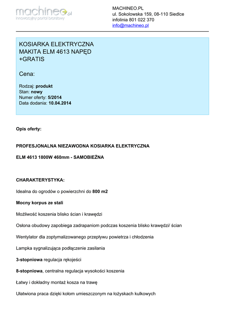 MACHINEO.PL ul. Sokolowska 159, 08-110 Siedlce infolinia 801 022 370 [email protected] KOSIARKA ELEKTRYCZNA MAKITA ELM 4613 NAPĘD +GRATIS Cena: Rodzaj: produkt Stan: nowy Numer oferty: 5/2014 Data dodania: 10.04.2014 Opis oferty: PROFESJONALNA NIEZAWODNA KOSIARKA ELEKTRYCZNA ELM 4613 1800W 460mm - SAMOBIEŻNA CHARAKTERYSTYKA: Idealna do ogrodów o powierzchni do 800 m2 Mocny korpus ze stali Możliwość koszenia blisko ścian i krawędzi Osłona obudowy zapobiega zadrapaniom podczas koszenia blisko krawędzi/ ścian Wentylator dla zoptymalizowanego przepływu powietrza i chłodzenia Lampka sygnalizująca podłączenie zasilania 3-stopniowa regulacja rękojeści 8-stopniowa, centralna regulacja wysokości koszenia Łatwy i dokładny montaż kosza na trawę Ułatwiona praca dzięki kołom umieszczonym na łożyskach kulkowych MACHINEO.PL ul. Sokolowska 159, 08-110 Siedlce infolinia 801 022 370 [email protected] 4 funkcje cięcia trawy: cięcie trawy bez kosza, cięcie trawy z koszem, zbieranie liści, opcja mulczowania Boczny wyrzut trawy NAPĘD SAMOBIEŻNY DANE TECHNICZNE: Moc znamionowa: 1800 W Szerokość cięcia: 46 cm Pozycja/wysokość cięcia: 8/20-75 mm Napęd: SAMOBIEŻNA (3.6 km/h) Pojemność kosza: 60 l Ciężar: 33 kg Firma oferująca: Hurtownia narzędzi REAKTOR Adres: ul. Leśna 20a 08-110 Siedlce tel.: 787 683 537 e-mail: [email protected]