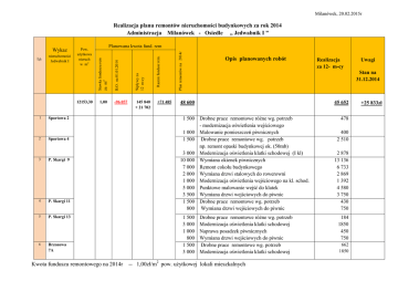 Milanówek, 20.02.2015r Realizacja planu remontów nieruchomości budynkowych za rok 2014 Administracja Milanówek - Osiedle „ Jedwabnik I ” 12153,30 1 1,00 -96 057 Sportowa 2 2 Sportowa 4 3 P. Skargi 9 4 P. Skargi 11 5 P. Skargi 13 6 Brzozowa 7A Kwota funduszu remontowego na 2014r 145 840 + 21 702 +71 485 Plan remontów na 2014r Razem fundusz rem. Wpływy za 12 m-cy B.O . na 01.01.2014 nieruchomości Jedwabnik I Planowana kwota fund. rem za m2 Lp. Pow. użytkowa nieruch w m2 Stawka funduszu rem Wykaz Opis planowanych robót Realizacja za 12- m-cy Uwagi Stan na 31.12.2014 48 600 45 652 1 500 Drobne prace remontowe różne wg. potrzeb - modernizacja oświetlenia wejściowego 1 000 Malowanie pomieszczeń piwnicznych 1 500 Drobne prace remontowe wg. potrzeb np. remont opaski budynkowej ok. (50mb) 3 000 Modernizacja oświetlenia klatki schodowej (I kl) 10 000 Wymiana okienek piwnicznych 7 000 Remont cokołu budynkowego 2 000 Wymiana drzwi stalowych do rowerowni 1 000 Modernizacja oświetlenia wejściowego na kl. schod. 5 000 Punktowe malowanie wejść do klatek 3 500 Wymiana drzwi wejściowych do piwnic 1 500 Drobne prace remontowe wg. potrzeb 800 Wymiana drzwi wejściowych do piwnic 1 500 3 000 1 000 800 1 500 3 000 Drobne prace remontowe różne wg. potrzeb Modernizacja oświetlenia klatki schodowej Naprawa posadzek piwnicznych Wymiana drzwi wejściowych do piwnic Drobne prace remontowe wg. potrzeb Modernizacja oświetlenia klatki schodowej -- 1,00zł/m2 pow. użytkowej lokali mieszkalnych 478 400 2 510 2 878 13 136 6 733 2 869 1 392 4 580 3 750 430 750 184 1850 450 750 662 1850 +25 833zł