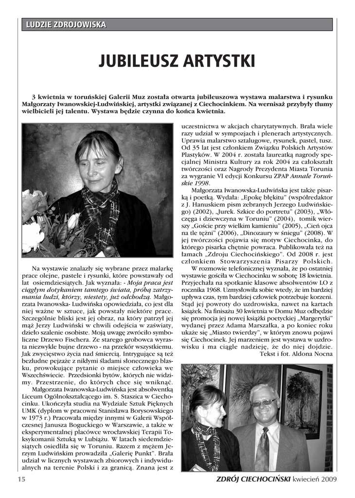 LUDZIE ZDROJOWISKA JUBILEUSZ ARTYSTKI 3 kwietnia w toruƒskiej Galerii Muz zosta∏a otwarta jubileuszowa wystawa malarstwa i rysunku Ma∏gorzaty Iwanowskiej-Ludwiƒskiej, artystki zwiàzanej z Ciechocinkiem. Na wernisa˝ przyby∏y t∏umy wielbicieli jej talentu. Wystawa b´dzie czynna do koƒca kwietnia. Na wystawie znalaz∏y si´ wybrane przez malark´ prace olejne, pastele i rysunki, które powstawa∏y od lat osiemdziesiàtych. Jak wyzna∏a: - Moja praca jest ciàg∏ym dotykaniem tamtego Êwiata, próbà zatrzymania ludzi, którzy, niestety, ju˝ odchodzà. Ma∏gorzata Iwanowska- Ludwiƒska opowiedzia∏a, co jest dla niej wa˝ne w sztuce, jak powsta∏y niektóre prace. Szczególnie bliski jest jej obraz, na który patrzy∏ jej mà˝ Jerzy Ludwiƒski w chwili odejÊcia w zaÊwiaty, dzie∏o szalenie osobiste. Mojà uwag´ zwróci∏o symboliczne Drzewo Fischera. Ze starego grobowca wyrasta niezwykle bujne drzewo - na przekór wszystkiemu. Jak zwyci´stwo ˝ycia nad Êmiercià. Intrygujàce sà te˝ bezludne pejza˝e z nik∏ymi Êladami s∏onecznego blasku, prowokujàce pytanie o miejsce cz∏owieka we WszechÊwiecie. Przedsionki bytów, których nie widzimy. Przestrzenie, do których chce si´ wniknàç. Ma∏gorzata Iwanowska-Ludwiƒska jest absolwentkà Liceum Ogólnokszta∏càcego im. S. Staszica w Ciechocinku. Ukoƒczy∏a studia na Wydziale Sztuk Pi´knych UMK (dyplom w pracowni Stanis∏awa Borysowskiego w 1973 r.) Pracowa∏a mi´dzy innymi w Galerii Wspó∏czesnej Janusza Boguckiego w Warszawie, a tak˝e w eksperymentalnej placówce wroc∏awskiej Terapii Toksykomanii Sztukà w Lubià˝u. W latach siedemdziesiàtych osiedli∏a si´ w Toruniu. Razem z m´˝em Jerzym Ludwiƒskim prowadzi∏a „Galeri´ Punkt”. Bra∏a udzia∏ w licznych wystawach zbiorowych i indywidualnych na terenie Polski i za granicà. Znana jest z 15 uczestnictwa w akcjach charytatywnych. Bra∏a wiele razy udzia∏ w sympozjach i plenerach artystycznych. Uprawia malarstwo sztalugowe, rysunek, pastel, tusz. Od 35 lat jest cz∏onkiem Zwiàzku Polskich Artystów Plastyków. W 2004 r. zosta∏a laureatkà nagrody specjalnej Ministra Kultury za rok 2004 za ca∏okszta∏t twórczoÊci oraz Nagrody Prezydenta Miasta Torunia za wygranie VI edycji Konkursu ZPAP Annale Toruƒskie 1998. Ma∏gorzata Iwanowska-Ludwiƒska jest tak˝e pisarkà i poetkà. Wyda∏a: „Epok´ b∏´kitu” (wspó∏redaktor z J. Hanuskiem pism zebranych Jerzego Ludwiƒskiego) (2002), „Jurek. Szkice do portretu” (2003), „W∏ócz´ga i dziewczyna w Toruniu” (2004), tomik wierszy „GoÊcie przy wielkim kamieniu” (2005), „Cieƒ ojca na tle t´˝ni” (2006), „Dinozaury w Êniegu” (2008). W jej twórczoÊci pojawia si´ motyw Ciechocinka, do którego pisarka ch´tnie powraca. Publikowa∏a te˝ na ∏amach „Zdroju Ciechociƒskiego”. Od 2008 r. jest cz∏onkiem Stowarzyszenia Pisarzy Polskich. W rozmowie telefonicznej wyzna∏a, ˝e po ostatniej wystawie goÊci∏a w Ciechocinku w sobot´ 18 kwietnia. Przyjecha∏a na spotkanie klasowe absolwentów LO z rocznika 1968. Uzmys∏owi∏a sobie wtedy, ˝e im bardziej up∏ywa czas, tym bardziej cz∏owiek potrzebuje korzeni. Stàd jej powroty do uzdrowiska, nawet na kartach ksià˝ek. Na finisa˝u 30 kwietnia w Domu Muz odb´dzie si´ promocja jej nowej ksià˝ki poetyckiej „Margerytki” wydanej przez Adama Marsza∏ka, a po koniec roku uka˝e si´ „Miasto twierdzy”, w którym znowu pojawi si´ Ciechocinek. Jej marzeniem jest wystawa w uzdrowisku i ma ciàgle nadziej´, ˝e do niej dojdzie. Tekst i fot. Aldona Nocna ZDRÓJ CIECHOCI¡SKI kwiecieƒ 2009