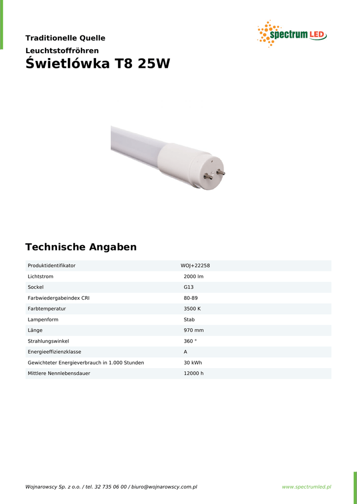 Traditionelle Quelle Leuchtstoffröhren Świetlówka T8 25W Technische Angaben Produktidentifikator WOJ+22258 Lichtstrom 2000 lm Sockel G13 Farbwiedergabeindex CRI 80-89 Farbtemperatur 3500 K Lampenform Stab Länge 970 mm Strahlungswinkel 360 ° Energieeffizienzklasse A Gewichteter Energieverbrauch in 1.000 Stunden 30 kWh Mittlere Nennlebensdauer 12000 h Wojnarowscy Sp. z o.o. / tel. 32 735 06 00 / [email protected] Powered by TCPDF (www.tcpdf.org) www.spectrumled.pl