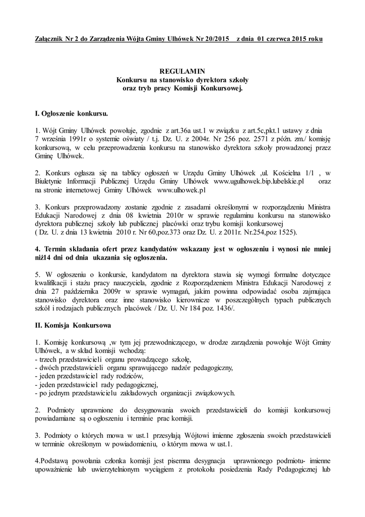 Załącznik Nr 2 do Zarządzenia Wójta Gminy Ulhówek Nr 20/2015 z dnia 01 czerwca 2015 roku REGULAMIN Konkursu na stanowisko dyrektora szkoły oraz tryb pracy Komisji Konkursowej. I. Ogłoszenie konkursu. 1. Wójt Gminy Ulhówek powołuje, zgodnie z art.36a ust.1 w związku z art.5c,pkt.1 ustawy z dnia 7 września 1991r o systemie oświaty / t.j. Dz. U. z 2004r. Nr 256 poz. 2571 z późn. zm./ komisję konkursową, w celu przeprowadzenia konkursu na stanowisko dyrektora szkoły prowadzonej przez Gminę Ulhówek. 2. Konkurs ogłasza się na tablicy ogłoszeń w Urzędu Gminy Ulhówek ,ul. Kościelna 1/1 , w Biuletynie Informacji Publicznej Urzędu Gminy Ulhówek www.ugulhowek.bip.lubelskie.pl oraz na stronie internetowej Gminy Ulhówek www.ulhowek.pl 3. Konkurs przeprowadzony zostanie zgodnie z zasadami określonymi w rozporządzeniu Ministra Edukacji Narodowej z dnia 08 kwietnia 2010r w sprawie regulaminu konkursu na stanowisko dyrektora publicznej szkoły lub publicznej placówki oraz trybu komisji konkursowej ( Dz. U. z dnia 13 kwietnia 2010 r. Nr 60,poz.373 oraz Dz. U. z 2011r. Nr.254,poz 1525). 4. Termin składania ofert przez kandydatów wskazany jest w ogłoszeniu i wynosi nie mniej niż14 dni od dnia ukazania się ogłoszenia. 5. W ogłoszeniu o konkursie, kandydatom na dyrektora stawia się wymogi formalne dotyczące kwalifikacji i stażu pracy nauczyciela, zgodnie z Rozporządzeniem Ministra Edukacji Narodowej z dnia 27 października 2009r w sprawie wymagań, jakim powinna odpowiadać osoba zajmująca stanowisko dyrektora oraz inne stanowisko kierownicze w poszczególnych typach publicznych szkół i rodzajach publicznych placówek / Dz. U. Nr 184 poz. 1436/. II. Komisja Konkursowa 1. Komisję konkursową ,w tym jej przewodniczącego, w drodze zarządzenia powołuje Wójt Gminy Ulhówek, a w skład komisji wchodzą: - trzech przedstawicieli organu prowadzącego szkołę, - dwóch przedstawicieli organu sprawującego nadzór pedagogiczny, - jeden przedstawiciel rady rodziców, - jeden przedstawiciel rady pedagogicznej, - po jednym przedstawicielu zakładowych organizacji związkowych. 2. Podmioty uprawnione do desygnowania swoich przedstawicieli do komisji konkursowej powiadamiane są o ogłoszeniu i terminie prac komisji. 3. Podmioty o których mowa w ust.1 przesyłają Wójtowi imienne zgłoszenia swoich przedstawicieli w terminie określonym w powiadomieniu, o którym mowa w ust.1. 4.Podstawą powołania członka komisji jest pisemna desygnacja uprawnionego podmiotu- imienne upoważnienie lub uwierzytelnionym wyciągiem z protokołu posiedzenia Rady Pedagogicznej lub Zebrania Rodziców. 5. Członkiem komisji nie może być osoba spokrewniona z którymkolwiek z kandydatów. 6. Posiedzenie komisji odbywa się nie później niż w ciągu 14 dni roboczych od upływu terminu składania ofert przez kandydatów, wskazanego w ogłoszeniu o konkursie. 7. Przewodniczący komisji ustala termin i miejsce pierwszego posiedzenia komisji, o czym powiadamia na piśmie członków komisji oraz kandydatów, nie później niż 7 dni przed terminem posiedzenia. 8. Prace komisji mogą być prowadzone, jeżeli w posiedzeniu bierze udział co najmniej 2/3 składu komisji. 9. Pracami komisji kieruje jej przewodniczący, który w szczególności – uzupełnia lub dokonuje zmiany komisji w przypadku, gdy podmioty o których mowa w ust.1 nie prześlą imiennych zgłoszeń swoich przedstawicieli w terminie określonym w ust.3 lub dokonują ich zmiany i na posiedzenie komisji zgłaszają się osoby nie ujęte w zarządzeniu określającym skład komisji a posiadające pisemne upoważnienie, o którym mowa w ust.4. 10. W kwestiach spornych występujących między członkami komisji przewodniczący zarządza jawne głosowanie, w którym w przypadku różnego podziału głosów rozstrzygający jest jego głos. 11. Konkurs odbywa się w dwóch etapach przeprowadzonych w jednym dniu. III. Tryb pracy Komisji Konkursowej A. ETAP PIERWSZY 1. Pierwszy etap przebiega bez udziału kandydatów. Członkowie komisji zapoznają się z dokumentami złożonymi przez kandydatów, orzekają czy kandydaci spełniają kryteria określone w przepisach ustawowych i ogłoszeniu o konkursie, sprawdzają warunki formalne i merytoryczne złożonych ofert. Komisja, na podstawie złożonej oferty, podejmuje decyzję o dopuszczeniu lub odmowie dopuszczenia kandydata do postępowania konkursowego. Decyzja zapada zwykłą większością głosów w głosowaniu jawnym. W przypadku równej liczby głosów, głos decydujący należy do przewodniczącego komisji. 2. Komisja podejmuje uchwałę o odmowie dopuszczenia kandydata do postępowania konkursowego, jeżeli : 1) oferta została złożona po terminie; 2) oferta nie zawiera wszystkich dokumentów wskazanych w ogłoszeniu konkursu; 3) z oferty wynika, że kandydat nie spełnia wymagań wskazanych w ogłoszeniu konkursu. 3. Po zakończeniu prac przewodniczący Komisji informuje ustnie kandydatów o dopuszczeniu albo odmowie dopuszczenia do postępowania konkursowego. 4. Kandydat, któremu odmówiono dopuszczenia do postępowania konkursowego, może w terminie 3 dni wystąpić z pisemnym wnioskiem o podanie przyczyn odmowy. Przewodniczący Komisji informuję kandydata na piśmie o przyczynach odmowy dopuszczenia do postępowania konkursowego w terminie 7 dni od dnia złożenia wniosku. B. ETAP DRUGI 1. Drugi etap to rozmowa z kandydatem na temat perspektyw funkcjonowania szkoły, własnej koncepcji funkcjonowania i rozwoju publicznej szkoły. Komisja przeprowadza rozmowy z kandydatami oddzielnie. Członkowie komisji mogą zadawać kandydatom pytania. Celem rozmów kwalifikacyjnych jest ocena merytoryczna kandydatów, ocena predyspozycji i umiejętności kandydatów gwarantujących prawidłowe prowadzenie szkoły. 2. Komisja wyłania kandydata na stanowisko dyrektora w głosowaniu tajnym. Każdy z członków komisji dysponuje jednym głosem. 3. Każdy członek komisji głosuje na przygoto