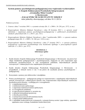 Przedszkole Integracyjne „Gromadka Misia Uszatka” w Skwierzynie System pomocy psychologiczno-pedagogicznej oraz wspierania wychowanków w Zespole Edukacyjnym Przedszkolu Integracyjnym „Gromadka Misia Uszatka” w Skwierzynie - ZAŁĄCZNIK NR 16 DO STATUTU SZKOŁY tekst jednolity obowiązujący od dnia 18.11.2013r. Podstawa prawna: 1. Ustawa z dnia 7 września 1991 r. o systemie oświaty (Dz. U. z 2004 r. Nr 256, poz. 2572, ze zm.). 2. Rozporządzenie Ministra Edukacji Narodowej z dnia 30 kwietnia 2013 r. w sprawie zasad udzielania i organizacji pomocy psychologiczno-pedagogicznej w publicznych przedszkolach, szkołach i placówkach (Dz. U. z 2013 r. poz. 532 ). 1. Rozporządzenie Ministra Edukacji Narodowej z dnia 7 października 2009 r. w sprawie nadzoru pedagogicznego (Dz. U. z 2009 r. Nr 168, poz. 1324 ze zm.). 3. Rozporządzenie Ministra Edukacji Narodowej z dnia 27 sierpnia 2012 r. w sprawie podstawy programowej wychowania przedszkolnego oraz kształcenia ogólnego w poszczególnych typach szkół (Dz. U. z 2012 r. poz. 977). ROZDZIAŁ I Informacje ogólne §1 1. Każde dziecko Zespołu Edukacyjnego Przedszkola Integracyjnego w Skwierzynie ma prawo być objęte działaniami pedagogicznymi i psychologicznymi, mającymi na celu rozpoznanie jego możliwości psychofizycznych, w tym szczególnych uzdolnień, indywidualnych potrzeb rozwojowych i edukacyjnych oraz zaspokojenia tych potrzeb. 2. Każde dziecko Zespołu Edukacyjnego Przedszkola Integracyjnego w Skwierzynie w przypadkach, o których mowa w ust. 4 ma prawo do uzyskania pomocy psychologiczno – pedagogicznej. 3. Korzystanie z pomocy jest dobrowolne i nieodpłatne. 4. Pomoc psychologiczno – pedagogiczna polega na rozpoznawaniu i zaspokajaniu indywidualnych potrzeb rozwojowych i edukacyjnych dziecka oraz rozpoznawaniu indywidualnych możliwości psychofizycznych dziecka , wynikających w szczególności: 1) z niepełnosprawności; 2) z niedostosowania społecznego; 3) z zagrożenia niedostosowaniem społecznym; 4) ze szczególnych uzdolnień; 5) ze specyficznych trudności w uczeniu się; 6) z zaburzeń komunikacji językowej; 7) z choroby przewlekłej; 8) z sytuacji kryzysowych lub traumatycznych; 9) z niepowodzeń edukacyjnych; 10) z zaniedbań środowiskowych związanych z sytuacją bytową ucznia i jego rodziny, sposobem spędzania czasu wolnego, kontaktami środowiskowymi; str. 1 z 13 Przedszkole Integracyjne „Gromadka Misia Uszatka” w Skwierzynie 11) z trudności adaptacyjnych związanych z różnicami kulturowymi lub ze zmianą środowiska edukacyjnego, w tym związanych z wcześniejszym kształceniem za granicą. 5. Pomoc psychologiczno – pedagogiczną organizuje dyrektor Zespołu Edukacyjnego. 6. Bezpośredni nadzór nad organizacją i świadczeniem pomocy psychologiczno – pedagogicznej sprawuje wicedyrektor ds. przedszkola, który pełni jednocześnie funkcję koordynatora w zakresie organizacji wszelkich sformalizowanych form pomocy. 7. Pomoc psychologiczno – pedagogiczna udzielana jest także rodzicom i nauczycielom. Polega ona na wspieraniu rodziców i nauczycieli w rozwiązywaniu problemów wychowawczych i dydaktycznych oraz rozwijaniu ich umiejętności wychowawczych w celu zwiększenia efektywności pomocy psychologiczno – pedagogicznej dla dzieci. 8. Pomocy psychologiczno – pedagogicznej w przedszkolu udzielają wszyscy nauczyciele zatrudnieni w przedszkolu oraz pedagog szkolny i logopeda. 9. Pomoc psychologiczno – pedagogicznej jest organizowana i udzielana we współpracy z: 1) rodzicami dziecka; 2) Poradnią Psychologiczno – Pedagogiczną w Skwierzynie; 3) instytucjami działającymi na rzecz rodziny - MOPS, MOPR, 4) organizacjami pozarządowymi – Caritas, „Dzieci Niczyje”; 5) Domem Dziecka w Skwierzynie. 10. Z inicjatywą o pomoc psychologiczno – pedagogiczną może wystąpić: 1) rodzic dziecka; 2) dyrektor ; 3) każdy nauczyciel prowadzący zajęcia z dzieckiem; 4) pielęgniarka szkolna; 5) poradnia; 6) pracownik socjalny; 7) asystent rodziny; 8) kurator sądowy. 11. Wnioski ustne przedkłada się wychowawcy oddziału. W przypadku wniosków z instytucji zewnętrznych wnioski lub prośby można kierować pisemnie lub drogą elektroniczną do sekretariatu szkoły lub biura w przedszkolu. W tym przypadku obieg dokumentów pozostaje zgodny z instrukcją kancelaryjną. ROZDZIAŁ II Formy pomocy psychologiczno – pedagogicznej §2 1. Pomoc psychologiczno – pedagogiczna w przedszkolu jest realizowana przez każdego nauczyciela w bieżącej pracy z dzieckiem. Polega ona w szczególności na: 1) dostosowaniu wymagań edukacyjnych do możliwości psychofizycznych dziecka i jego potrzeb; 2) indywidualizacji pracy na zajęciach obowiązkowych i dodatkowych; 3) dostosowanie warunków nauki do potrzeb psychofizycznych dziecka; str. 2 z 13 Przedszkole Integracyjne „Gromadka Misia Uszatka” w Skwierzynie 2. Pomoc psychologiczno – pedagogiczna świadczona jest również w formach zorganizowanych. Są to: 1) zajęcia rozwijające uzdolnienia adresaci zadania typ placówki podstawa udzielania prowadzący czas trwania jednostki zajęć liczba uczestników okres udzielania pp Dzieci szczególnie uzdolnione Rozwijanie zainteresowań i talentów dzieci Przedszkole Na wniosek wychowawcy lub innego nauczyciela, wniosek rodzica, opinii PP o szczególnych uzdolnieniach Nauczyciele i specjaliści posiadający kwalifikacje właściwe do rodzaju prowadzonych zajęć 15-30 minut maksimum 8 osób zgodnie z decyzją dyrektora 2) zajęcia logopedyczne adresaci Dzieci z zaburzeniami mowy, które powodują zaburzenia komunikacji językowej zadania Prowadzenie terapii logopedycznej typ placówki przedszkole podstawa udzielania Na wniosek wychowawcy lub innego nauczyciela, wniosek rodzica, opinii PP lub orzeczenia prowadzący Nauczyciele i specjaliści posiadający kwalifikacje w zakresie terapii logopedycznej czas trwania 15-30 minut, w uzasadnionych przypadkach dopuszcza się prowadzenie jednostki za