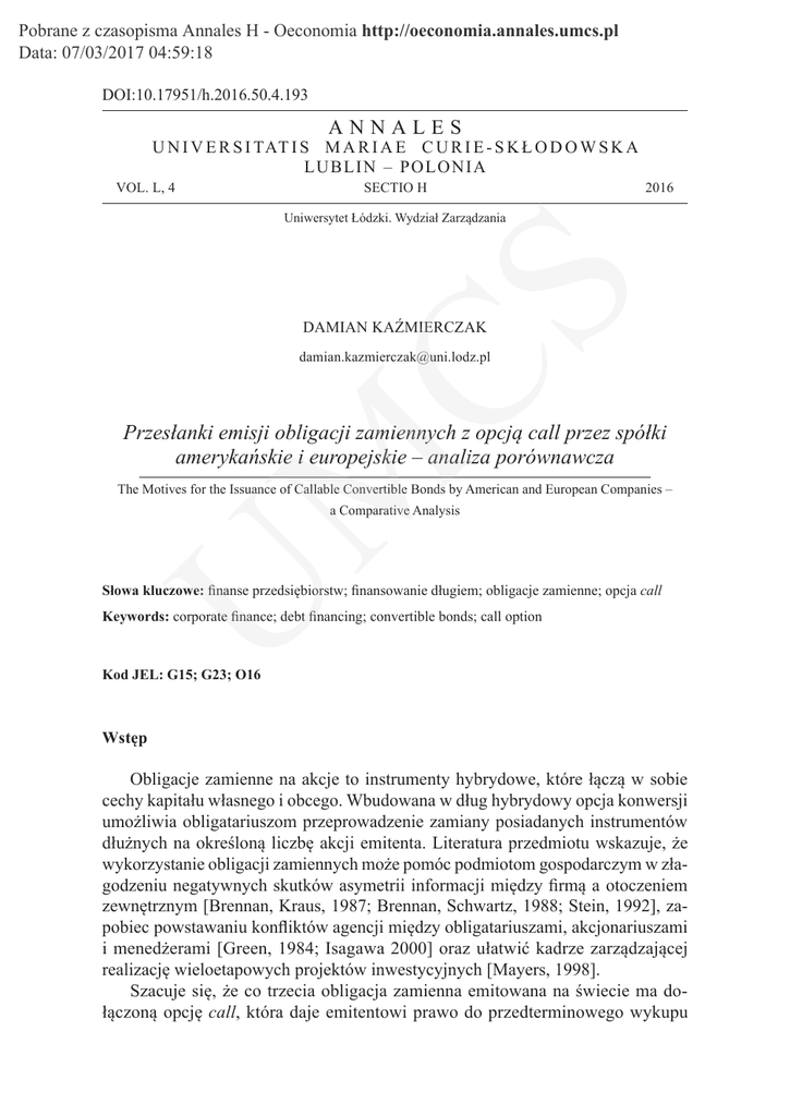 Pobrane z czasopisma Annales H - Oeconomia http://oeconomia.annales.umcs.pl Data: 07/03/2017 04:59:18 DOI:10.17951/h.2016.50.4.193 ANNALES U N I V E R S I TAT I S M A R I A E C U R I E - S K Ł O D O W S K A LU BLI N – P O L ONIA VOL. L, 4 SECTIO H 2016 CS Uniwersytet Łódzki. Wydział Zarządzania DAMIAN KAŹMIERCZAK [email protected] M Przesłanki emisji obligacji zamiennych z opcją call przez spółki amerykańskie i europejskie – analiza porównawcza The Motives for the Issuance of Callable Convertible Bonds by American and European Companies – U a Comparative Analysis Słowa kluczowe: finanse przedsiębiorstw; finansowanie długiem; obligacje zamienne; opcja call Keywords: corporate finance; debt financing; convertible bonds; call option Kod JEL: G15; G23; O16 Wstęp Obligacje zamienne na akcje to instrumenty hybrydowe, które łączą w sobie cechy kapitału własnego i obcego. Wbudowana w dług hybrydowy opcja konwersji umożliwia obligatariuszom przeprowadzenie zamiany posiadanych instrumentów dłużnych na określoną liczbę akcji emitenta. Literatura przedmiotu wskazuje, że wykorzystanie obligacji zamiennych może pomóc podmiotom gospodarczym w złagodzeniu negatywnych skutków asymetrii informacji między firmą a otoczeniem zewnętrznym [Brennan, Kraus, 1987; Brennan, Schwartz, 1988; Stein, 1992], zapobiec powstawaniu konfliktów agencji między obligatariuszami, akcjonariuszami i menedżerami [Green, 1984; Isagawa 2000] oraz ułatwić kadrze zarządzającej realizację wieloetapowych projektów inwestycyjnych [Mayers, 1998]. Szacuje się, że co trzecia obligacja zamienna emitowana na świecie ma dołączoną opcję call, która daje emitentowi prawo do przedterminowego wykupu Pobrane z czasopisma Annales H - Oeconomia http://oeconomia.annales.umcs.pl Data: 07/03/2017 04:59:18 194 DAMIAN KAŹMIERCZAK U M CS długu lub przedterminowego wymuszenia konwersji na obligatariuszach. Badacze przekonują, że dołączenie opcji call może, po pierwsze, zabezpieczyć spółkę przed trudnościami z wykupem obligacji w ustalonym terminie zapadalności [Nyborg, 1995; Ekkayokkaya, Gemmill, Koufopoulos, 2012]. Po drugie, może pozwolić jej na złagodzenie sporów agencyjnych między akcjonariuszami a zarządem na tle zbyt ekspansywnej polityki inwestycyjnej realizowanej przez kadrę menedżerską [Isagawa, 2000, 2002]. Po trzecie, może ułatwić menedżerom realizację projektów inwestycyjnych o niepewnej rentowności lub nieznanej dacie realizacji [Mayers, 1998, 2000; Korkeamaki, Moore, 2004; Jung, Sullivan, 2009]. Niniejszy artykuł koncentruje się na wyjaśnieniu roli, jaką pełni opcja call w dłużnym finansowaniu hybrydowym. Celem pracy jest ustalenie przesłanek dołączenia opcji call do obligacji zamiennych wyemitowanych przez spółki amerykańskie i europejskie oraz zweryfikowanie, czy motywy emisji tej formy długu hybrydowego różnią się w zależności od siedziby kraju emitenta. Można domniemywać, że pomimo odmiennych uwarunkowań ekonomicznych i prawnych między poszczególnymi rynkami, przedsiębiorstwa muszą stawiać czoła podobnym problemom bez względu na miejsce prowadzenia swojej działalności. Mogą one dotyczyć m.in. braku funduszy na realizację nowych inwestycji, niskiego poziomu rentowności i nadmiernego zadłużenia. Może zatem się okazać, że krytyka pod adresem badaczy, którzy analizują najbardziej dojrzały i płynny rynek dłużnych instrumentów hybrydowych (czyli rynek amerykański) i uogólniają swoje wnioski na inne rynki (np. europejskie), jest nieuzasadniona. Takie przypuszczenie wpłynęło na sformułowanie głównej hipotezy badawczej H: przesłanki emisji obligacji zamiennych z opcją call przez spółki amerykańskie nie różnią się od motywów emisji tych instrumentów przez przedsiębiorstwa europejskie. Próba badawcza objęła 299 emisji obligacji zamiennych z dołączoną opcją call, przeprowadzonych w latach 2004–2014 przez spółki produkcyjne i usługowe mające swoją siedzibę w Stanach Zjednoczonych, Francji, Niemczech, Wielkiej Brytanii i Holandii (248 emisji na rynku amerykańskim i 51 na rynku europejskim). Weryfikacja przyjętej hipotezy badawczej została przeprowadzona w oparciu o sześć parametrów emisji i 12 wskaźników opisujących ekonomiczno-finansową sytuację emitentów, z wykorzystaniem statystyk opisowych, testów istotności różnic i regresji logistycznej. W pierwszej części artykułu dokonano przeglądu literatury związanej z przesłankami emisji długu hybrydowego z wbudowaną opcją call. W części drugiej przedstawiono opis próby badawczej i metodologię badania empirycznego. Część trzecia zawiera wyniki przeprowadzonej analizy i dyskusję otrzymanych rezultatów. 1. Przegląd literatury Motywy emisji obligacji zamiennych z opcją call są przedmiotem zainteresowania badaczy od początku lat 90. XX w. Zdaniem J. Steina instrumenty te mogą pomóc spółkom w uniknięciu emisji niedowartościowanych akcji i umożliwić im podwyższenie Pobrane z czasopisma Annales H - Oeconomia http://oeconomia.annales.umcs.pl Data: 07/03/2017 04:59:18 PRZESŁANKI EMISJI OBLIGACJI ZAMIENNYCH Z OPCJĄ CALL PRZEZ SPÓŁKI AMERYKAŃSKIE… 195 U M CS kapitału własnego w późniejszym terminie, niejako „tylnymi drzwiami” (through the backdoor), w wyniku realizacji klauzuli call i przedterminowego wymuszenia konwersji na obligatariuszach [Stein, 1992]. Należy zwrócić uwagę, że konwersję długu na akcje będą w stanie wymusić wyłącznie przedsiębiorstwa znajdujące się w relatywnie dobrej sytuacji finansowej, ponieważ tylko w ich przypadku można przypuszczać, że wbudowana w dług hybrydowy opcja konwersji będzie „w cenie” i inwestorzy zdecydują się na zamianę posiadanych instrumentów dłużnych na udziały spółki. Na tej podstawie J. Stein przekonuje, że emisja obligacji zamiennych może stanowić dla rynku pozytywny sygnał odnośnie przyszłej kondycji 