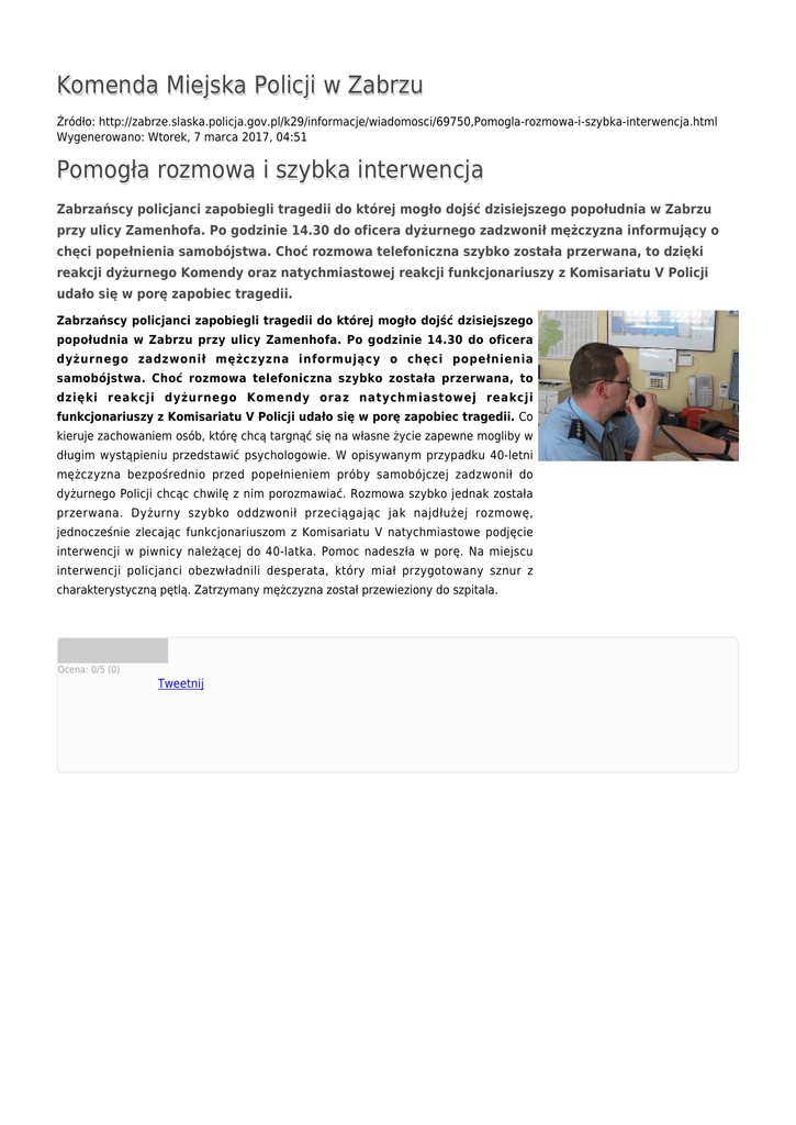 Komenda Miejska Policji w Zabrzu Źródło: http://zabrze.slaska.policja.gov.pl/k29/informacje/wiadomosci/69750,Pomogla-rozmowa-i-szybka-interwencja.html Wygenerowano: Wtorek, 7 marca 2017, 04:51 Pomogła rozmowa i szybka interwencja Zabrzańscy policjanci zapobiegli tragedii do której mogło dojść dzisiejszego popołudnia w Zabrzu przy ulicy Zamenhofa. Po godzinie 14.30 do oficera dyżurnego zadzwonił mężczyzna informujący o chęci popełnienia samobójstwa. Choć rozmowa telefoniczna szybko została przerwana, to dzięki reakcji dyżurnego Komendy oraz natychmiastowej reakcji funkcjonariuszy z Komisariatu V Policji udało się w porę zapobiec tragedii. Zabrzańscy policjanci zapobiegli tragedii do której mogło dojść dzisiejszego popołudnia w Zabrzu przy ulicy Zamenhofa. Po godzinie 14.30 do oficera dyżurnego zadzwonił mężczyzna informujący o chęci popełnienia samobójstwa. Choć rozmowa telefoniczna szybko została przerwana, to dzięki reakcji dyżurnego Komendy oraz natychmiastowej reakcji funkcjonariuszy z Komisariatu V Policji udało się w porę zapobiec tragedii. Co kieruje zachowaniem osób, którę chcą targnąć się na własne życie zapewne mogliby w długim wystąpieniu przedstawić psychologowie. W opisywanym przypadku 40-letni mężczyzna bezpośrednio przed popełnieniem próby samobójczej zadzwonił do dyżurnego Policji chcąc chwilę z nim porozmawiać. Rozmowa szybko jednak została przerwana. Dyżurny szybko oddzwonił przeciągając jak najdłużej rozmowę, jednocześnie zlecając funkcjonariuszom z Komisariatu V natychmiastowe podjęcie interwencji w piwnicy należącej do 40-latka. Pomoc nadeszła w porę. Na miejscu interwencji policjanci obezwładnili desperata, który miał przygotowany sznur z charakterystyczną pętlą. Zatrzymany mężczyzna został przewieziony do szpitala. Ocena: 0/5 (0) Tweetnij