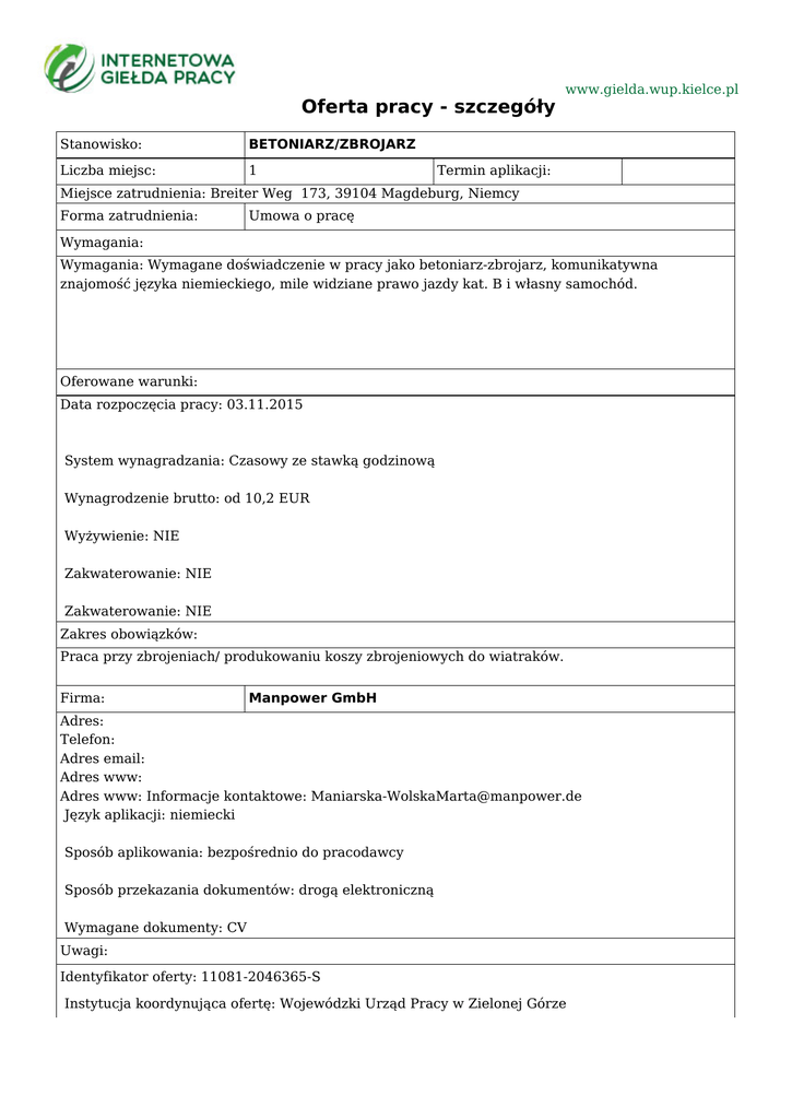 Oferta pracy - szczegóły Stanowisko: BETONIARZ/ZBROJARZ Liczba miejsc: 1 www.gielda.wup.kielce.pl Termin aplikacji: Miejsce zatrudnienia: Breiter Weg 173, 39104 Magdeburg, Niemcy Forma zatrudnienia: Umowa o pracę Wymagania: Wymagania: Wymagane doświadczenie w pracy jako betoniarz-zbrojarz, komunikatywna znajomość języka niemieckiego, mile widziane prawo jazdy kat. B i własny samochód. Oferowane warunki: Data rozpoczęcia pracy: 03.11.2015 System wynagradzania: Czasowy ze stawką godzinową Wynagrodzenie brutto: od 10,2 EUR Wyżywienie: NIE Zakwaterowanie: NIE Zakwaterowanie: NIE Zakres obowiązków: Praca przy zbrojeniach/ produkowaniu koszy zbrojeniowych do wiatraków. Firma: Manpower GmbH Adres: Telefon: Adres email: Adres www: Adres www: Informacje kontaktowe: [email protected] Język aplikacji: niemiecki Sposób aplikowania: bezpośrednio do pracodawcy Sposób przekazania dokumentów: drogą elektroniczną Wymagane dokumenty: CV Uwagi: Identyfikator oferty: 11081-2046365-S Instytucja koordynująca ofertę: Wojewódzki Urząd Pracy w Zielonej Górze Urząd Pracy dokłada wszelkich starań, aby oferty pracy będące w zasobach urzędu, były rzetelne i wiarygodne. Ponieważ wszystkie oferty pracy pochodzą od osób trzecich Urząd Pracy zastrzega, że odpowiedzialność za ewentualne rozbieżności pomiędzy warunkami pracy zaprezentowanymi w niniejszej ofercie a warunkami zaproponowanymi przez potencjalnego pracodawcę ponosi pracodawca.