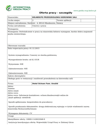 Oferta pracy - szczegóły www.gielda.wup.kielce.pl Stanowisko: KELNER/PO PRZESZKOLENIU KIEROWNIK SALI Liczba miejsc: 2 Termin aplikacji: Miejsce zatrudnienia: Marktstr. 4, 89143 Blaubeuren, Niemcy Forma zatrudnienia: Umowa o pracę Wymagania: Wymagania: Doświadczenie w pracy na stanowisku kelnera wymagane, bardzo dobra znajomość języka niemieckiego, Oferowane warunki: Data rozpoczęcia pracy: 01.12.2015 System wynagradzania: Czasowy ze stawką godzinową Wynagrodzenie brutto: od 8,5 EUR Wyżywienie: NIE Zakwaterowanie: NIE Zakwaterowanie: NIE Zakres obowiązków: Obsługa gości w restauracji ( możliwość przeszkolenia na kierownika sali) Firma: Hotel Ochsen Fam. Unsöld Adres: Telefon: Adres email: Adres www: Adres www: Informacje kontaktowe: [email protected] Język aplikacji: niemiecki Sposób aplikowania: bezpośrednio do pracodawcy Sposób przekazania dokumentów: drogą elektroniczną wpisując w tytule wiadomości nazwę stanowiska Restaurantfachmann Wymagane dokumenty: CV Uwagi: Identyfikator oferty: 10000-1143622048-S Instytucja koordynująca ofertę: Wojewódzki Urząd Pracy w Zielonej Górze Urząd Pracy dokłada wszelkich starań, aby oferty pracy będące w zasobach urzędu, były rzetelne i wiarygodne. Ponieważ wszystkie oferty pracy pochodzą od osób trzecich Urząd Pracy zastrzega, że odpowiedzialność za ewentualne rozbieżności pomiędzy warunkami pracy zaprezentowanymi w niniejszej ofercie a warunkami zaproponowanymi przez potencjalnego pracodawcę ponosi pracodawca.