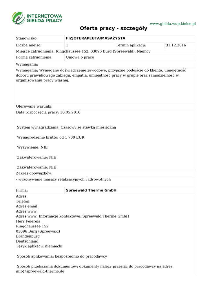 Oferta pracy - szczegóły Stanowisko: FIZJOTERAPEUTA/MASAŻYSTA Liczba miejsc: 1 www.gielda.wup.kielce.pl Termin aplikacji: 31.12.2016 Miejsce zatrudnienia: Ringchaussee 152, 03096 Burg (Spreewald), Niemcy Forma zatrudnienia: Umowa o pracę Wymagania: Wymagania: Wymagane doświadczenie zawodowe, przyjazne podejście do klienta, umiejętność doboru prawidłowego zabiegu, empatia, umiejętność pracy w grupie oraz samodzielność w organizowaniu pracy własnej. Oferowane warunki: Data rozpoczęcia pracy: 30.05.2016 System wynagradzania: Czasowy ze stawką miesięczną Wynagrodzenie brutto: od 1 700 EUR Wyżywienie: NIE Zakwaterowanie: NIE Zakwaterowanie: NIE Zakres obowiązków: - wykonywanie masaży relaksacyjnych i zdrowotnych Firma: Spreewald Therme GmbH Adres: Telefon: Adres email: Adres www: Adres www: Informacje kontaktowe: Spreewald Therme GmbH Herr Feiereis Ringchaussee 152 03096 Burg (Spreewald) Brandenburg Deutschland Język aplikacji: niemiecki Sposób aplikowania: bezpośrednio do pracodawcy Sposób przekazania dokumentów: dokumenty należy przesłać do pracodawcy na adres: [email protected] lub pocztą tradycyjną Spreewald Therme GmbH Herr Feiereis Ringchaussee 152 03096 Burg (Spreewald) Brandenburg Deutschland Wymagane dokumenty: CV ze zdjęciem i danymi kontaktowymi, referencje (jeśli są) Uwagi: Identyfikator oferty: 10000-1135904535-S Instytucja koordynująca ofertę: Wojewódzki Urząd Pracy w Zielonej Górze Urząd Pracy dokłada wszelkich starań, aby oferty pracy będące w zasobach urzędu, były rzetelne i wiarygodne. Ponieważ wszystkie oferty pracy pochodzą od osób trzecich Urząd Pracy zastrzega, że odpowiedzialność za ewentualne rozbieżności pomiędzy warunkami pracy zaprezentowanymi w niniejszej ofercie a warunkami zaproponowanymi przez potencjalnego pracodawcę ponosi pracodawca.