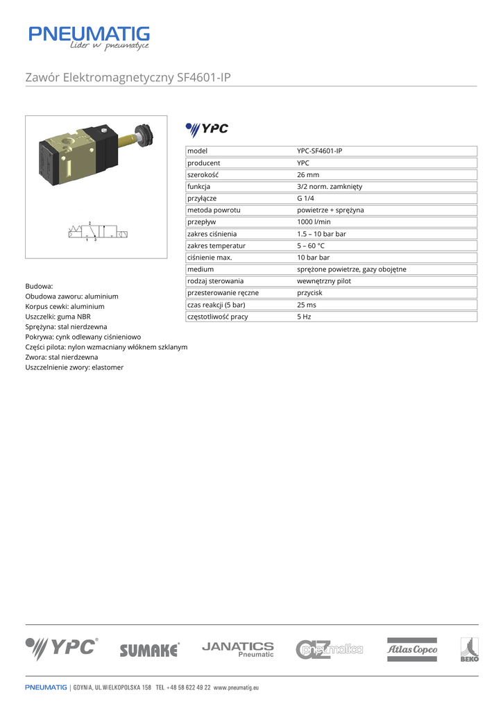 Zawór Elektromagnetyczny SF4601-IP model YPC-SF4601-IP producent YPC szerokość 26 mm funkcja 3/2 norm. zamknięty przyłącze G 1/4″ metoda powrotu powietrze + sprężyna przepływ 1000 l/min zakres ciśnienia 1.5 – 10 bar bar zakres temperatur 5 – 60 °C ciśnienie max. 10 bar bar medium sprężone powietrze, gazy obojętne rodzaj sterowania wewnętrzny pilot Budowa: przesterowanie ręczne Obudowa zaworu: aluminium czas reakcji (5 bar) Korpus cewki: aluminium Uszczelki: guma NBR częstotliwość pracy Sprężyna: stal nierdzewna Pokrywa: cynk odlewany ciśnieniowo Części pilota: nylon wzmacniany włóknem szklanym Zwora: stal nierdzewna Uszczelnienie zwory: elastomer przycisk 25 ms 5 Hz