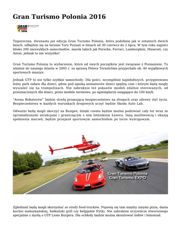 Gran Turismo Polonia 2016 Tegoroczna, dwunasta już edycja Gran Turismo Polonia, która podobnie jak w ostatnich dwóch latach, odbędzie się na terenie Toru Poznań w dniach od 30 czerwca do 2 lipca. W tym roku zagości blisko 200 niezwykłych samochodów, marek takich jak Porsche, Ferrari, Lamborghini, Maserati, czy Aston, jednak to nie wszystko! Gran Turismo Polonia to wydarzenie, które od swych początków jest związane z Poznaniem. To właśnie do naszego miasta w 2005 r. za sprawą Petera Ternströma przyjechało ok. 40 wyjątkowych sportowych maszyn. Jednak GTP to nie tylko szybkie samochody. Dla gości, szczególnie najmłodszych, przygotowano leśny park zabaw dla dzieci, gdzie pod opieką animatorów dzieci spędzą czas i którym będą mogły wyszaleć się na trampolinach. Nie zabraknie też pokazów modeli zdalnie sterowanych, od przeznaczonych dla dzieci, przez modele terenowe, po egzemplarze osiągające do 100 km/h. "Arena Bohaterów" będzie strefą promującą bezpieczeństwo na drogach oraz zdrowy styl życia. Bezpieczeństwa w każdych warunkach drogowych uczyć będzie Skoda Auto Lab. Odważni będą mogli skoczyć na Bungee, dzięki czemu będzie można podziwiać cały tor wraz ze zgromadzonymi atrakcjami i graniczącym z nim lotniskiem Ławica. Inną możliwością i okazją spełnienia marzeń, będzie przejazd sportowym samochodem po torze wyścigowym. Zgłodniali będą mogli skorzystać ze strefy food-trucków. Pojawią się tam między innymi pizza, dania kuchni meksykańskiej, bałkański grill czy belgijskie frytki. Nie zabraknie oczywiście stworzonego specjalnie z myślą o GTP Lions Burgera. Dla ochłody będzie można skosztować lodów i lemoniad. Na graczy, czekać będzie namiot gier. W nim, na specjalnie przygotowanych symulatorach, uczestnicy rozgrywek będą mogli przejechać się jednym z samochodów po trasie Toru Poznań. Z pewnością obowiązkowymi punktami do odwiedzenia dla motomaniaków, będzie wystawa aż 30 Fordów Mustangów. Z kolei fani motoryzacyjnych klasyków, usatysfakcjonują wystawy niepowtarzalnych pojazdów zabytkowych, spośród których najstarszym będzie liczący sobie 93 lata model. Na tegorocznym Grand Turismo Polonia dobrze będą się czuli nawet rowerzyści. Przygotowano dla nich ścieżki rowerowe prowadzące na tor oraz bezpłatny parkingi dla rowerów. Na miejscu obecny będzie także serwis rowerowi firmy Shimano, którego specjaliści zadbają o stan każdego z powierzonych im rowerów. Z myślą o amatorach dwóch kółek, którzy jeszcze nie posiadają swojego jednośladu, na Tor Poznań sprowadzona zostanie także stacja rowerów miejskich. Uzupełnieniem będzie wystawa zabytkowych rowerów i motorowerów. Dodatkowym ułatwieniem będą bezpłatne autobusy, które będą kursować z Dworca Głównego w Poznaniu. Więcej informacji na stronie >> www.granturismopolonia.pl