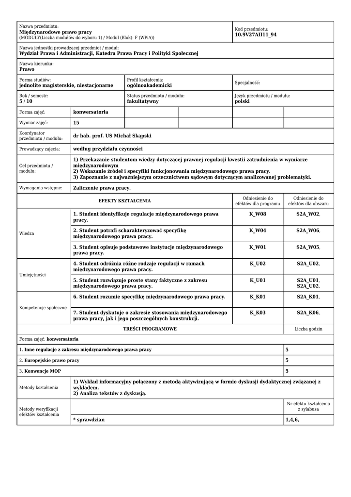 Nazwa przedmiotu: Kod przedmiotu: Międzynarodowe prawo pracy (MODUŁY(Liczba modułów do wyboru 1) / Moduł (Blok): F (WPiA)) 10.9V27AII11_94 Nazwa jednostki prowadzącej przedmiot / moduł: Wydział Prawa i Administracji, Katedra Prawa Pracy i Polityki Społecznej Nazwa kierunku: Prawo Forma studiów: Profil kształcenia: jednolite magisterskie, niestacjonarne ogólnoakademicki Rok / semestr: 5 / 10 Status przedmiotu / modułu: Język przedmiotu / modułu: fakultatywny polski Specjalność: Forma zajęć: konwersatoria Wymiar zajęć: 15 Koordynator przedmiotu / modułu: dr hab. prof. US Michał Skąpski Prowadzący zajęcia: według przydziału czynności Cel przedmiotu / modułu: 1) Przekazanie studentom wiedzy dotyczącej prawnej regulacji kwestii zatrudnienia w wymiarze międzynarodowym 2) Wskazanie źródeł i specyfiki funkcjonowania międzynarodowego prawa pracy. 3) Zapoznanie z najważniejszym orzecznictwem sądowym dotyczącym analizowanej problematyki. Wymagania wstępne: Zaliczenie prawa pracy. Odniesienie do efektów dla programu Odniesienie do efektów dla obszaru 1. Student identyfikuje regulacje międzynarodowego prawa pracy. K_W08 S2A_W02, 2. Student potrafi scharakteryzować specyfikę międzynarodowego prawa pracy. K_W04 S2A_W06, 3. Student opisuje podstawowe instytucje międzynarodowego prawa pracy. K_W01 S2A_W05, 4. Student odróżnia różne rodzaje regulacji w ramach międzynarodowego prawa pracy. K_U02 S2A_U02, 5. Student rozwiązuje proste stany faktyczne z zakresu międzynarodowego prawa pracy. K_U01 S2A_U01, S2A_U02, 6. Student rozumie specyfikę międzynarodowego prawa pracy. K_K01 S2A_K01, 7. Student dyskutuje o zakresie stosowania międzynarodowego prawa pracy, jak i jego poszczególnych konstrukcji. K_K03 S2A_K06, EFEKTY KSZTAŁCENIA Wiedza Umiejętności Kompetencje społeczne TREŚCI PROGRAMOWE Liczba godzin Forma zajęć: konwersatoria 1. Inne regulacje z zakresu międzynarodowego prawa pracy 5 2. Europejskie prawo pracy 5 3. Konwencje MOP 5 Metody kształcenia Metody weryfikacji efektów kształcenia 1) Wykład informacyjny połączony z metodą aktywizującą w formie dyskusji dydaktycznej związanej z wykładem. 2) Analiza tekstów z dyskusją. Nr efektu kształcenia z sylabusa * sprawdzian 1,4,6, Forma i warunki zaliczenia Zaliczenie z oceną w formie pisemnego sprawdzianu. Zaliczenie pisemne (pytania opisowe z zakresu zajęć i literatury podstawowej). 3 Pytania teoretyczne. Za każde pytanie maksymalnie 10 punktów. 30-28 - bdb 27-25 - db pl 24-22 - db 21-19 - dst pl 18-16 - dst Ocena z przedmiotu stanowi 100% oceny z zaliczenia pisemnego w formie sprawdzianu. Literatura podstawowa Świątkowski A.M. (2008): Międzynarodowe Prawo Pracy. Tom I. Międzynarodowe Publiczne Prawo Prahttp://www.us.esylabusy.pl/theme/szablon1/gfx/textln.gifcy. C.H. BECK 1600 Świątkowski A.M. (2010): Międzynarodowe Prawo Pracy. Tom II. Międzynarodowe Prywatne Prawo Pracy. C.H. BECK 885 Florek L. (2010): Europejskie Prawo pracy. Lexis Nexis 268 Literatura uzupełniająca Mitrus L. (2006): Wpływ regulacji wspólnotowych na polskie prawo pracy. Zakamycze 455 NAKŁAD PRACY STUDENTA: Liczba godzin Zajęcia dydaktyczne 15 Udział w konsultacjach 10 Zdawanie egzaminu lub/i zaliczenia 2 Przygotowanie się do zajęć 10 Studiowanie literatury 38 Przygotowanie projektu / eseju / itp. 10 Przygotowanie się do egzaminu lub/i zaliczenia 15 ŁĄCZNY nakład pracy studenta w godz. 100 Liczba punktów ECTS 4