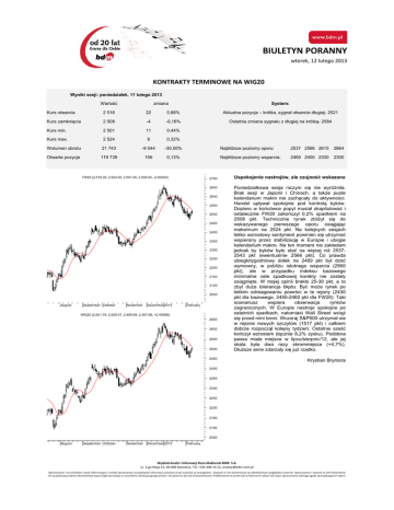 BIULETYN PORANNY wtorek, 12 lutego 2013 KONTRAKTY TERMINOWE NA WIG20 Wyniki sesji: poniedziałek, 11 lutego 2013 Wartość zmiana System: Kurs otwarcia 2 516 22 0,88% Aktualna pozycja – krótka, sygnał otwarcia długiej- 2521 Kurs zamknięcia 2 508 -4 -0,16% Ostatnia zmiana sygnału z długiej na krótką- 2584 Kurs min. 2 501 11 0,44% Kurs max. 2 524 8 0,32% Wolumen obrotu 21 743 -9 544 -30,50% Otwarte pozycje 119 739 156 0,13% Najbliższe poziomy oporu: 2537 2566 2615 2664 Najbliższe poziomy wsparcia: 2460 2400 2330 2300 FW20 (2,516.00, 2,524.00, 2,501.00, 2,508.00, -4.00000) Uspokojenie nastrojów, ale czujność wskazana 2700 2650 2600 2550 2500 2450 2400 2350 2300 2250 2200 2150 2100 2050 August September October November December 2013 February WIG20 (2,501.76, 2,508.47, 2,489.69, 2,497.88, +2.45996) 2650 2600 2550 2500 2450 Poniedziałkowa sesja niczym się nie wyróżniła. Brak sesji w Japonii i Chinach, a także puste kalendarium makro nie zachęcały do aktywności. Handel upływał spokojnie pod kontrolą byków. Dopiero w końcówce popyt musiał skapitulować i ostatecznie FW20 zakończył 0,2% spadkiem na 2508 pkt. Technicznie rynek zbliżył się do wskazywanego pierwszego oporu osiągając maksimum na 2524 pkt. Na kolejnych sesjach lekko wzrostowy sentyment powinien się utrzymać wspierany przez stabilizację w Europie i ubogie kalendarium makro. Na ten moment nie zakładam jednak by byków było stać na więcej niż 25372543 pkt (ewentualnie 2566 pkt). Co prawda ubiegłotygodniowy dołek na 2469 pkt był dość wymowny, w pobliżu istotnego wsparcia (2560 pkt), ale w przypadku indeksu bazowego minimalne cele spadkowej korekty nie zostały osiągnięte. W mojej opinii brakło 25-30 pkt, a to zbyt duża tolerancja błędu. Być może rynek po lekkim odreagowaniu powróci w te rejony (2430 pkt dla bazowego, 2450-2460 pkt dla FW20). Taki scenariusz wspiera obserwacja rynków zagranicznych. W Europie nastroje spokojne po ostatnich spadkach, natomiast Wall Street wciąż się przed nimi broni. Wczoraj S&P500 utrzymał sie w rejonie nowych szczytów (1517 pkt) i całkiem dobrze rozpoczął kolejny tydzień. Ostatnie sześć kończył wzrostem (łącznie 8,2% zysku). Podobna passa miała miejsce w lipcu/sierpniu'12, ale jej skala była dwa razy skromniejsza (+4,7%). Dłuższe serie zdarzały się już rzadko. Krystian Brymora 2400 2350 2300 2250 2200 2150 2100 2050 August September October November December 2013 February Wydział Analiz i Informacji Dom Maklerski BDM S.A. ul. 3‐go Maja 23, 40‐096 Katowice, Tel.: 032 208 14 12, [email protected] Opracowanie ma charakter czysto informacyjny i zostało opracowany na podstawie informacji uznanych przez autorów za wiarygodne . Zawarte w nim komentarze są subiektywnymi poglądami autorów. Opracowanie i zawarte w nim komentarze nie są podstawą żadnej rekomendacji kupna bądź sprzedaży w rozumieniu obowiązującego prawa i nie powinny być tak interpretowane. Publikowanie w prasie lub w Internecie całości lub części opracowania wymaga zgody sporządzających raport. BIULETYN PORANNY wtorek, 12 lutego 2013 RYNEK AKCJI Wyniki sesji: poniedziałek, 11 lutego 2013 52 tygodnie Indeks Kurs otwarcia Kurs zamknięcia Zmiana [%] Kurs min. Kurs max. Zakres wahań Wartość obrotów [mln PLN] Kurs max. Kurs min. WIG20 2 634,2 2 009,3 2 501,76 2 497,88 0,10% 2 489,69 2 508,47 18,8 391,9 sWIG80 11 280,6 8 975,7 11 022,38 10 947,75 -0,35% 10 912,16 11 040,89 128,7 16,9 38,2 mWIG40 2 648,7 2 145,0 2 591,26 2 593,63 0,24% 2 587,69 2 606,71 19,0 WIG PL 48 505,5 36 478,4 47 158,56 46 988,04 0,12% 46 988,04 47 158,56 170,5 - WIG 48 222,7 36 483,4 46 851,89 46 786,74 0,10% 46 676,00 46 971,98 296,0 462,3 Spółka Cena [PLN] Mkt Cap [mln PLN] 43,40 BANK HANDLOWY BOGDANKA BORYSZEW zmiana % zmiana % względem WIG20 dzienna 1M 3M 6M dzienna 1M 3M 6M 3 602 -0,2% -5,7% 7,6% -4,4% -0,3% -3,3% 0,7% -12,4% 92,10 12 034 -0,1% -5,5% 0,4% 5,9% -0,2% -3,2% -6,5% -2,1% 134,50 4 575 -0,3% -1,5% 10,4% 8,5% -0,4% 0,9% 3,5% 0,5% 0,48 1 083 -5,9% -15,8% -9,4% -5,9% -6,0% -13,4% -16,4% -13,9% BRE 331,00 13 949 1,3% 4,6% 12,2% 3,6% 1,2% 7,0% 5,2% -4,4% GTC 8,42 2 689 -1,4% -10,0% 7,0% 36,0% -1,5% -7,7% 0,0% 28,0% JSW 93,90 11 025 0,5% -0,5% 10,9% 2,1% 0,4% 1,8% 3,9% -5,9% KERNEL 66,00 5 259 0,8% 5,2% 4,3% -9,6% 0,7% 7,5% -2,6% -17,6% KGHM 189,00 37 800 -0,5% -0,9% 13,6% 45,9% -0,6% 1,4% 6,6% 38,0% LOTOS 37,78 4 907 1,3% -1,7% 14,3% 39,8% 1,2% 0,6% 7,3% 31,8% PEKAO 159,00 41 733 -0,1% -3,9% 4,1% 2,6% -0,2% -1,6% -2,9% -5,4% PGE 17,35 32 440 0,9% -9,9% -1,7% -13,6% 0,8% -7,6% -8,7% -21,5% PGNIG 5,51 32 509 0,9% 3,4% 29,3% 28,7% 0,8% 5,7% 22,4% 20,7% PKNORLEN 49,15 21 022 0,8% 0,9% 16,2% 23,8% 0,7% 3,3% 9,2% 15,8% PKOBP 35,35 44 188 -0,6% -1,6% -0,3% 2,8% -0,7% 0,8% -7,3% -5,2% PZU 410,00 35 404 0,4% -0,3% 6,2% 11,4% 0,3% 2,0% -0,8% 3,5% 5,22 6 907 1,6% -3,0% -6,8% -6,3% 1,5% -0,6% -13,8% -14,3% ASSECOPOL SYNTHOS TAURON 4,49 7 869 0,4% -6,8% 4,7% -7,2% 0,3% -4,5% -2,3% -15,2% TPSA 11,64 15 547 -0,5% -8,7% -3,6% -30,1% -0,6% -6,4% -10,6% -38,1% TVN 9,07 3 119 1,9% -5,8% 34,8% 12,5% 1,8% -3,5% 27,8% 4,5% Komentarz po sesji Komentarz przed sesją: Rozczarowująca postawa popytu Szefowie BC mają głos Po pokazie relatywnej siły przez WIG20 w czwartek i piątek oraz po przejściu przez opór 2494 punktów należało spodziewać się pozytywnego rozpoczęcia nowego giełdowego tygodnia na naszym parkiecie. Tak też się stało, lecz styl handlu akcjami największych spółek był dziś zdecydowanie rozczarowujący. Nie chodzi tylko o to, że w maksymalnym punkcie sesji wzrost WIG20 wyniósł zaledwie 0,5%. Głównym problemem były obroty. Wartość handlu największymi spółkami była dziś śmiesznie niska i świadczy o braku mocnego kapitału chcącego gonić indeks po wielu spadkowych tygodniach od początku roku. Rynek sprawia wrażenie, jakby odbicie z końcówki tygodnia i relatywna siła w stosunku do innych giełd były jedynie funkcją wyczerpania si