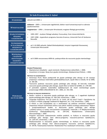 Dr hab.Przemysław E. Gębal STANOWISKO WYKSZTAŁCENIE adiunkt (od 2008 r.) doktorat – 2005 r.; Uniwersytet Jagiellooski; doktor nauk humanistycznych w zakresie językoznawstwa magisterium – 1996 r.; Uniwersytet Wrocławski; magister filologii germaoskiej STAŻE/STYPENDIA • 1995-1997 - studium filologii włoskiej i francuskiej, Freie Universität Berlin KRAJOWE I ZAGRANICZNE • 1997-1998 - stypendium programu Socrates Erasmus, Université Paris III Sorbonne Nouvelle • od 1.10.2005 adiunkt, Zakład Glottodydaktyki, Instytut Lingwistyki Stosowanej, Uniwersytet Warszawski ZATRUDNIENIE W PLACÓWKACH KRAJOWYCH I ZAGRANICZNYCH WSPÓŁPRACA Z WAŻNYMI INSTYTUCJAMI NAUKOWODYDAKTYCZNYMI • od X 2008 rzeczoznawca MEN ds. podręczników do nauczania języka niemieckiego KSIĄŻKI/ PODRĘCZNIKI: Repetytorium leksykalne - język niemiecki, Wydawnictwo LektorKlett, r. 2006. Zusammen in Europa. Nowy kurs języka niemieckiego, Wydawnictwo Poltext, r. 2004. ARTYKUŁY W CZASOPISMACH: Generacja PLUS. Nowe podręczniki do języka polskiego jako obcego na tle rozwoju preparacji i ewaluacji materiałów glottodydaktycznych, Języki Obce w Szkole, Nr 6/ 2006, str. 88-106. Tworzenie podstaw nauczania języka polskiego jako obcego. W kierunku metodyki nauczania języka polskiego jako obcego, Języki Obce w Szkole Nr 6/2006, str. 278-283. O potrzebie wydania materiałów dydaktycznych do nauki niemieckiego języka prawniczego ORBIS LINGUARUM Nr 29 r. 2005, str. 431-440. PUBLIKACJE DO 31 XII 2006 ARTYKUŁY W PRACACH ZBIOROWYCH: Realia i kultura w nauczaniu języka polskiego jako obcego, w: Z zagadnieo dydaktyki języka polskiego jako obcego, str. 205-242, Universitas, r. 2006. Language Proficiency Test for Level A1, w: Cześd, jak się masz? Częśd I: Spotykamy się w Polsce. A Polish Language Textbook for Beginners, str. 1-16, Universitas, r. 2005. O Polsce w Unii Europejskiej czy o zachowaniu się podczas ceremonii religijnych? Znajomości których elementów kultury oraz jakich realiów oczekują cudzoziemcy? Raport z przeprowadzonych badao, w: Nauczanie języka polskiego jako obcego i polskiej kultury w nowej rzeczywistości europejskiej. materiały z VI Międzynarodowej Konferencji Glottodydaktycznej, str. 234-243, Wydawnictwa Uniwersytetu Warszawskiego, r. 2005 Program nauczania cudzoziemców realiów polskich, w: Kultura w nauczaniu języka polskiego jako obcego. Stan obecny-programy nauczania-pomoce dydaktyczne, str. 129-147, Universitas, r. 2004 Realioznawstwo w nauczaniu języka niemieckiego, w: Kultura w nauczaniu języka polskiego jako obcego. Stan obecny-programy nauczania -pomoce dydaktyczne, str. 69-94, Towarzystwo Autorów i Wydawców Prac naukowych Universitas, r. 2004 INNE: Niemiecki - Niezbędnik leksykalny (CD-ROM), w: Duży słownik szkolny niemiecko-polski i polsko-niemiecki PONS, str. 1-1, Wydawnictwo LektorKlett, r. 2006 KSIĄŻKI Dydaktyka kultury polskiej w kształceniu językowym cudzoziemców. Podejście porównawcze, Universitas, Kraków 2010. Ku wielokulturowej szkole w Polsce. Pakiet edukacyjny z programem nauczania języka polskiego jako drugiego dla I,II i III etapu kształcenia (w szkołach m.st. Warszawy) Miasto Stołeczne Warszawa, 2010. PUBLIKACJE 2007 – 2012 PODRĘCZNIKI: Repetytorium leksykalne ekonomiczne. Fachsprache Wirtschaft, Wydawnictwo LektorKlett, r. 2007. Od słowa do słowa toczy się rozmowa. Repetytorium leksykalne z języka polskiego jako obcego dla poziomów B1 i B2, Universitas, Kraków 2009. Prima A1. Język niemiecki dla gimnazjum. Klasa 1. Podręcznik, Wydawnictwo BC.edu, Warszawa 2009 (opracowanie wersji polskiej). Prima A1. Język niemiecki dla gimnazjum. Klasa 1. Poradnik metodyczny, Wydawnictwo BC.edu, Warszawa 2009 (opracowanie wersji polskiej). Prima A1. Język niemiecki dla gimnazjum. Klasa 1. Zeszyt dwiczeo, Wydawnictwo BC.edu, Warszawa 2009 (opracowanie wersji polskiej). Prima A2. Język niemiecki dla gimnazjum. Klasa 2. Podręcznik, Wydawnictwo BC.edu, Warszawa 2010 (opracowanie wersji polskiej). Prima A2. Język niemiecki dla gimnazjum. Klasa 2. Poradnik metodyczny, Wydawnictwo BC.edu, Warszawa 2010 (opracowanie wersji polskiej). Prima A2. Język niemiecki dla gimnazjum. Klasa 2. Zeszyt dwiczeo, Wydawnictwo BC.edu, Warszawa 2010 (opracowanie wersji polskiej). Prima A2. Język niemiecki dla gimnazjum. Klasa 3. Podręcznik, Wydawnictwo BC.edu, Warszawa 2011 (opracowanie wersji polskiej). Prima A2. Język niemiecki dla gimnazjum. Klasa 3. Zeszyt dwiczeo, Wydawnictwo BC.edu, Warszawa 2011 (opracowanie wersji polskiej). ARTYKUŁY W CZASOPISMACH: Genial, aktuell und im Team. Przegląd podręczników do nauki języka niemieckiego w gimnazjum, Języki Obce w Szkole Nr 3 r. 2008, s. 187-195 O kształceniu lektorów / nauczycieli języka polskiego jako obcego, Języki Obce w Szkole Nr 1/2008 r. 2008, s. 78-83. Zagrajmy w Domino z nowym kursem języka niemieckiego dla klas I-III szkoły podstawowej, Języki Obce w Szkole Nr 5 r. 2007, str. 203-205. Wczesnoszkolne nauczanie języka niemieckiego w oparciu o serię KIKUS, w: Hallo Deutschlehrer! Zeitschrift des Polnischen Deutschlehrerverbandes, nr 29, Warszawa 2009, s. 37-39. Ku wielokulturowej szkole w Polsce. Pakiet edukacyjny z programem nauczania języka polskiego jako drugiego dla I, II i III etapu edukacyjnego (w szkołach m. st. Warszawy) Języki Obce w Szkole nr 3 r. 2010, s. 68-71. Koncepcja D-A-CH-L w erze dydaktyki DaFnE (Deutsch als Fremdsprache nach Englisch) HALLO DEUTSCHLEHRER! ZEITSCHRIFT DES POLNISCHEN DEUTSCHLEHRERVERBANDES nr 31 r. 2010, s. 32-35. ARTYKUŁY W PRACACH ZBIOROWYCH I TOMACH POKONFERENCYJNYCH: Europejski, polski i warszawski wymiar polityki językowej. Głos w dyskusji w: Deutsche Sprache in Polen nach 1989. Geschichte-Bildung-Praxis, Wszechnica Polska Szkoła Wyższa TWP w Warszawie, r. 2008, s. 111-115. Materiały do nauki języka niemieckiego. Przegląd najczęściej wykorzystywanych podręczników, w: Deutsche Sprache in Polen nach 1989. Geschichte-Bildung-Praxis