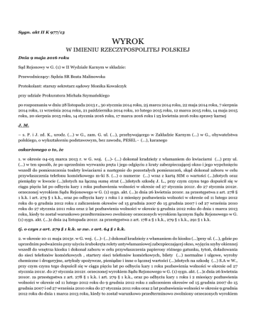 Sygn. akt II K 977/13 WYROK W IMIENIU RZECZYPOSPOLITEJ POLSKIEJ Dnia 9 maja 2016 roku Sąd Rejonowy w G. (1) w II Wydziale Karnym w składzie: Przewodniczący: Sędzia SR Beata Malinowska Protokolant: starszy sekretarz sądowy Monika Kowalczyk przy udziale Prokuratora Michała Szymańskiego po rozpoznaniu w dniu 28 listopada 2013 r., 30 stycznia 2014 roku, 25 marca 2014 roku, 22 maja 2014 roku, 7 sierpnia 2014 roku, 11 września 2014 roku, 21 października 2014 roku, 10 lutego 2015 roku, 12 marca 2015 roku, 14 maja 2015 roku, 20 sierpnia 2015 roku, 14 stycznia 2016 roku, 17 marca 2016 roku i 25 kwietnia 2016 roku sprawy karnej J. M. – s. P. i J. zd. K., urodz. (...) w G., zam. G. ul. (...), przebywającego w Zakładzie Karnym (...) w G., obywatelstwa polskiego, o wykształceniu podstawowym, bez zawodu, PESEL - (...), karanego oskarżonego o to, że 1. w okresie 04-05 marca 2013 r. w G. woj. (...)- (...) dokonał kradzieży z włamaniem do kwiaciarni (...) przy ul. (...) w ten sposób, że po uprzednim wyrwaniu pręta i jego odgięciu z kraty zabezpieczającej okno i jego wypchnięciu wszedł do pomieszczenia toalety kwiaciarni a następnie do pozostałych pomieszczeń, skąd dokonał zaboru w celu przywłaszczenia telefonu komórkowego m-ki S. (...) o numerze (...) wraz z kartą SIM o wartości (...)złotych oraz pieniędzy w kwocie (...)złotych na łączną sumę strat (...)złotych szkodę J. L., przy czym czynu tego dopuścił się w ciągu pięciu lat po odbyciu kary 1 roku pozbawienia wolności w okresie od 27 stycznia 2011r. do 27 stycznia 2012r. orzeczonej wyrokiem Sądu Rejonowego w G. (1) sygn. akt. (...)z dnia 26 kwietnia 2010r. za przestępstwa z art. 278 § 1 k.k. i art. 279 § 1 k.k., oraz po odbyciu kary 1 roku i 2 miesięcy pozbawienia wolności w okresie od 11 lutego 2012 roku do 9 grudnia 2012 roku z zaliczeniem okresów od 15 grudnia 2007 do 15 grudnia 2007 i od 27 września 2010 roku do 27 stycznia 2011 roku oraz 2 lat pozbawienia wolności w okresie 9 grudnia 2012 roku do dnia 1 marca 2013 roku, kiedy to został warunkowo przedterminowo zwolniony orzeczonych wyrokiem łącznym Sądu Rejonowego w G. (1) sygn. akt. (...)z dnia 24 listopada 2011r. za przestępstwa z art. 178 a § 1 k.k., 279 § 1 k.k., 291 § 1 k.k. tj. o czyn z art. 279 § 1 k.k. w zw. z art. 64 § 1 k.k. 2. w okresie 10-11 maja 2013r. w G. woj. (...)- (...) dokonał kradzieży z włamaniem do kiosku (...)przy ul. (...), gdzie po uprzednim podważeniu przy użyciu śrubokręta rolety antywłamaniowej zabezpieczającej okno, wyjęciu szyby okiennej wszedł do wnętrza kiosku i dokonał zaboru w celu przywłaszczenia papierosy różnego gatunku, tytoń, doładowania do sieci telefonów komórkowych , startery sieci telefonów komórkowych, bilety (...) normalne i ulgowe, wyroby chemiczne i drogeryjne, artykuły spożywcze, pieniądze i inne o łącznej wartości (...)złotych na szkodę (...) S.A w W., przy czym czynu tego dopuścił się w ciągu pięciu lat po odbyciu kary 1 roku pozbawienia wolności w okresie od 27 stycznia 2011r. do 27 stycznia 2012r. orzeczonej wyrokiem Sądu Rejonowego w G. (1) sygn. akt. (...)z dnia 26 kwietnia 2010r. za przestępstwa z art. 278 § 1 k.k. i art. 279 § 1 k.k., oraz po odbyciu kary 1 roku i 2 miesięcy pozbawienia wolności w okresie od 11 lutego 2012 roku do 9 grudnia 2012 roku z zaliczeniem okresów od 15 grudnia 2007 do 15 grudnia 2007 i od 27 września 2010 roku do 27 stycznia 2011 roku oraz 2 lat pozbawienia wolności w okresie 9 grudnia 2012 roku do dnia 1 marca 2013 roku, kiedy to został warunkowo przedterminowo zwolniony orzeczonych wyrokiem łącznym Sądu Rejonowego w G. (1) sygn. akt. (...)z dnia 24 listopada 2011r. za przestępstwa z art. 178 a § 1 k.k., 279 § 1 k.k., 291 § 1 k.k. tj. o czyn z art. 279 § 1 k.k. w zw. z art. 64 § 1 k.k. 3. w okresie 26/27 lipca 2013r. w G. woj. (...)- (...) dokonał kradzieży z włamaniem do garażu na terenie działki przy ul. (...), skąd po wyłamaniu zamka i odgięciu bocznych drzwi wejściowych, ze środka zabrał karabinek pneumatyczny typu wiatrówka, wkrętarkę akumulatorową m-ki E., miedziane kable rozruchowe z klemami, radioodtwarzacz samochodowy, CB radio m-ki P. i antenę od CB radia i łącznej wartości (...) złotych na szkodę M. i K. Ł., przy czym czynu tego dopuścił się w ciągu pięciu lat po odbyciu kary 1 roku pozbawienia wolności w okresie od 27 stycznia 2011r. do 27 stycznia 2012r. orzeczonej wyrokiem Sądu Rejonowego w G. (1) sygn. akt. (...)z dnia 26 kwietnia 2010r. za przestępstwa z art. 278 § 1 k.k. i art. 279 § 1 k.k., oraz po odbyciu kary 1 roku i 2 miesięcy pozbawienia wolności w okresie od 11 lutego 2012 roku do 9 grudnia 2012 roku z zaliczeniem okresów od 15 grudnia 2007 do 15 grudnia 2007 i od 27 września 2010 roku do 27 stycznia 2011 roku oraz 2 lat pozbawienia wolności w okresie 9 grudnia 2012 roku do dnia 1 marca 2013 roku, kiedy to został warunkowo przedterminowo zwolniony orzeczonych wyrokiem łącznym Sądu Rejonowego w G. (1) sygn. akt. (...)z dnia 24 listopada 2011r. za przestępstwa z art. 178 a § 1 k.k., 279 § 1 k.k., 291 § 1 k.k. tj. o czyn z art. 279 § 1 k.k. w zw. z art. 64 § 1 k.k. 4. w okresie 26/27 lipca 2013r. w G. woj. (...)- (...) dokonał zaboru w celu przywłaszczenia z niezabezpieczonej przyczepy kempingowej na działce rekreacyjnej pryz ul. (...) wiertarkę elektryczną m-ki B. oraz koc o wartości łącznej (...) złotych na szkodę M. i K. Ł., przy czym czynu tego dopuścił się w ciągu pięciu lat po odbyciu kary 1 roku pozbawienia wolności w okresie od 27 stycznia 2011r. do 27 stycznia 2012r. orzeczonej wyrokiem Sądu Rejonowego w G. (1) sygn. akt. (...)z dnia 26 kwietnia 2010r. za przestępstwa z art. 278 § 1 k.k. i art. 279 § 1 k.k., oraz po odbyciu kary 1 roku i 2 miesięcy pozbawienia wolności w okresie od 11 lutego 2012 roku do 9 grudnia 2012 roku z zaliczeniem okresów od 15 grudnia 2007 do 15 grudnia 2007 i od 27 wrze