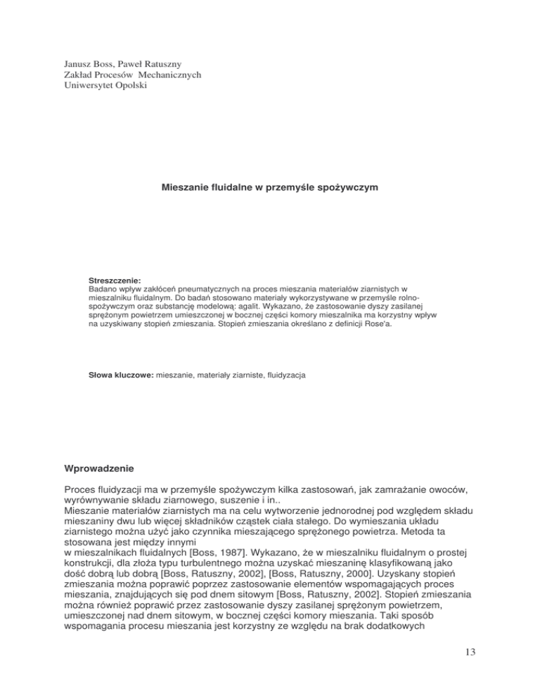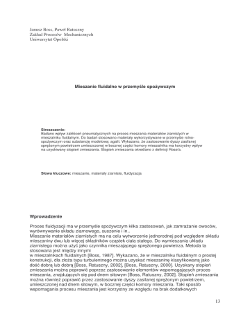 Janusz Boss, Paweł Ratuszny Zakład Procesów Mechanicznych Uniwersytet Opolski Mieszanie fluidalne w przemy le spo ywczym Streszczenie: Badano wpływ zakłóce pneumatycznych na proces mieszania materiałów ziarnistych w mieszalniku fluidalnym. Do bada stosowano materiały wykorzystywane w przemy le rolnospo ywczym oraz substancj modelow : agalit. Wykazano, e zastosowanie dyszy zasilanej spr onym powietrzem umieszczonej w bocznej cz ci komory mieszalnika ma korzystny wpływ na uzyskiwany stopie zmieszania. Stopie zmieszania okre lano z definicji Rose'a. Słowa kluczowe: mieszanie, materiały ziarniste, fluidyzacja Wprowadzenie Proces fluidyzacji ma w przemy le spo ywczym kilka zastosowa , jak zamra anie owoców, wyrównywanie składu ziarnowego, suszenie i in.. Mieszanie materiałów ziarnistych ma na celu wytworzenie jednorodnej pod wzgl dem składu mieszaniny dwu lub wi cej składników cz stek ciała stałego. Do wymieszania układu ziarnistego mo na u y jako czynnika mieszaj cego spr onego powietrza. Metoda ta stosowana jest mi dzy innymi w mieszalnikach fluidalnych [Boss, 1987]. Wykazano, e w mieszalniku fluidalnym o prostej konstrukcji, dla zło a typu turbulentnego mo na uzyska mieszanin klasyfikowan jako do dobr lub dobr [Boss, Ratuszny, 2002], [Boss, Ratuszny, 2000]. Uzyskany stopie zmieszania mo na poprawi poprzez zastosowanie elementów wspomagaj cych proces mieszania, znajduj cych si pod dnem sitowym [Boss, Ratuszny, 2002]. Stopie zmieszania mo na równie poprawi przez zastosowanie dyszy zasilanej spr onym powietrzem, umieszczonej nad dnem sitowym, w bocznej cz ci komory mieszania. Taki sposób wspomagania procesu mieszania jest korzystny ze wzgl du na brak dodatkowych 13 elementów maj cych kontakt z materiałem ziarnistym, co zmniejsza zjawisko erozji. Cz do wiadczalna Celem prowadzonych bada było okre lenie stopnia zmieszania w aparacie ze zło em fluidalnym typu turbulentnego, wyposa onym w dysz umieszczon nad dnem sitowym, w bocznej cz ci komory mieszania. Zastosowanie dyszy miało na celu wywołanie bocznego ruchu ziaren, a przez to popraw stopnia zmieszania. Do wprowadzenia materiału ziarnistego w stan fluidalny wykorzystano wentylator. Dysza o rednicy 1,5 mm zasilana była spr onym powietrzem o ci nieniu 220 kPa. Do bada wykorzystano kanał o przekroju prostok tnym (50x300 mm). W dolnej cz ci kanału zastosowano dno sitowe wykonane z siatki o oczkach 0,5 mm. Powietrze wprowadzano od dołu poprzez zespół siatek rozpraszaj cych, który zapewnił jednakow pr dko gazu w całym przekroju aparatu. W celu oceny procesu mieszania aparat podzielono na 10 jednakowych segmentów o wymiarach 50x30 mm specjaln kaset , wprowadzan od góry po zako czeniu procesu mieszania. Schemat stanowiska badawczego przedstawia rys. 1. Rys. 1. Schemat stanowiska badawczego Fig. 1. Diagram of an experimental setup Schemat instalacji u ywanej do bada : 1 - wylot powietrza, 2 - termometr, 3 - ruchoma kaseta dziel ca komor mieszania na segmenty, 4 - komora mieszania, 5 podajnik trasera, 6 - dno sitowe, 7 - annemometr elektroniczny, 8 - zegar steruj cy zasuw , 9 - zasuwa odcinaj ca dopływ powietrza, 10 - wentylator, 11 - silnik pr du stałego, 12 - układ regulacji obrotów silnika, 13 – wlot spr onego powietrza (dysza), 14 - wlot powietrza Próby prowadzono dla zło a typu turbulentnego. Traser wprowadzano podajnikiem umieszczonym w bocznej cz ci mieszalnika po osi gni ciu przez faz rozpraszaj c stanu fluidalnego. Po zako czeniu mieszania oddzielano traser od fazy rozpraszaj cej za pomoc 14 sit i obie fazy wa ono, a nast pnie okre lano udział xi trasera w ka dym segmencie. Stopie zmieszania okre lano z zale no ci Rose’a [Rose, 1959] σ σ0 (1) ( xi − p) 2 (2) M = 1− gdzie n σ= i =1 n oraz (3) σ 0 = p (1 − p) Badania prowadzono dla trzech układów niejednorodnych, których wła ciwo ci zestawiono w tabeli 1. 1200 1250 0,95 2,2 soja 5,5 pszenica 4,5 1200 1400 1,04 1,2 agalit agalit 2400 2400 1,05 2,2 5,5 2,5 g sto kg/m3 , stosunek rednic fazy rozpraszaj c ej i trasera Układ nr 1: faza rozpraszaj ca: traser: Układ nr 2: faza rozpraszaj ca: traser: Układ nr 3: faza rozpraszaj ca: traser: rednia rednica ziaren, mm soja 5,5 gorczyca 2,5 materiał stosunek g sto ci fazy rozpraszaj c ej i trasera Tabela 1. Wła ciwo ci układów ziaren u ytych do bada Table 1. Properties of grain system used for testing We wszystkich próbach udział trasera wynosił p=0,1. Badania prowadzono w mieszalniku nie wyposa onym w dysz wspomagaj c proces mieszania, a nast pnie po jej zastosowaniu. Traser podawano w skrajnym segmencie, oznaczonym numerem 1. Wszystkie badania prowadzono dla czasu mieszania t = 20 sekund. Jest to czas, po którym mieszanina osi ga stan równowagowy [Boss, Ratuszny, 2002]. Otrzymane wyniki zestawiono w tabeli 2. Dla układu ziarnistego nr 3 przeprowadzono badania dla ró nych czasów mieszania, co pozwoliło na sporz dzenie wykresu stopnia zmieszania w zale no ci od czasu mieszania (rys. 2). 15 1 stopie zmieszania wg Rose'a 0,9 0,8 0,7 0,6 0,5 0,4 bez dyszy z dysz 0,3 0,2 0,1 0 0 10 20 30 40 50 60 70 czas m ieszania, s Rys. 2. Stopie zmieszania w zale no ci od czasu mieszania Fig. 2. Mixing ratio in a function of time Tabela 2. Wpływ zastosowania dyszy wspomagaj cej proces mieszania w mieszalniku fluidalnym, czas mieszania t=20 s. Table 2. The effect of the nozzle supporting the process of mixing in a fluidal mixer, mixing time t=20 s. układ ziarnisty agalit- agalit soja – gorczyca soja – pszenica Stopie zmieszania wg Rose’a bez wspomagania po zastosowaniu dyszy wspomagaj cej 0,87 0,95 0,89 0,94 0,82 0,92 Jak wynika z danych zestawionych w tabeli, uzyskano znaczn popraw stopnia zmieszania. Najwi ksza poprawa nast piła dla układu nr 1 zło onego z ziaren agalitu o ró nych rednicach. 16 Wnioski Przeprowadzone badania wykazały konieczno zastosowania elementu wspomagaj cego proces mieszania w mieszalniku ze zło em fluidalnym, poniewa osi gany stopie zmieszania w miesza