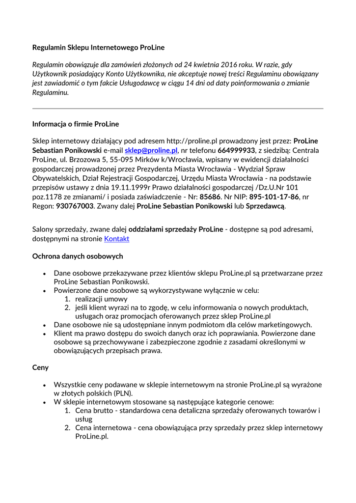 Regulamin Sklepu Internetowego ProLine Regulamin obowiązuje