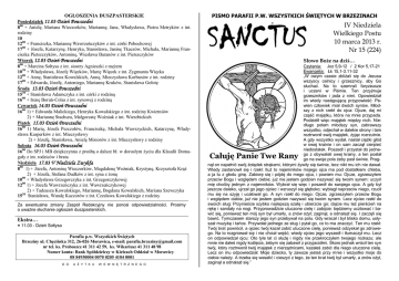 OGŁOSZENIA DUSZPASTERSKIE Poniedziałek 11.03 Dzień Powszedni 800 + Anielę, Mariana Wieczorków, Mariannę, Jana, Władysława, Piotra Metryków z int. rodziny 10 1200 + Franciszka, Mariannę Wawrzeńczyków z int. córki Pobochowej 1700 + Józefa, Katarzynę, Henryka, Stanisława, Janinę Tkaczów, Michała, Mariannę Franciszka Pietszczyków, Antoninę, Wiesława Baranów z int. Pietszczyków Wtorek 12.03 Dzień Powszedni 800 + Marcina Sołtysa z int. siostry Agnieszki z mężem 1030 + Władysława, Józefę Więcków, Marię Więcek z int. Zygmunta Więcka 1200 + Annę, Stanisława Kowalskich, Annę, Mieczysława Korbanów z int. rodziny 1700 + Edwarda, Józefę, Antoniego, Mariannę Kruków, Stanisława Gołotę Środa 13.03 Dzień Powszedni 1530 + Stanisława Adamczyka z int. córki z rodziną 1600 + Irenę Boruń-Colas z int. synowej z rodziną Czwartek 14.03 Dzień Powszedni 1600 1) + Edwarda Malickiego, Henryka Kowalskiego z int. rodziny Kwietniów 2) + Mariannę Stachura, Małgorzatę Woźniak z int. Wierzbickich Piątek 15.03 Dzień Powszedni 1600 1) Marię, Józefa Pszczołów, Franciszkę, Michała Wawrzyckich, Katarzynę, Władysława Kasperków z int. Mieczysławy 2) + Józefę, Stanisława, Anielę Misiorów z int. Mieczysławy z rodziny Sobota 16.03 Dzień Powszedni 1600 Do SPJ i MB dziękczynna z prośbą o dalsze bł. w dorosłym życiu dla Klaudii Domagały z int. rodziców i brata Niedziela 17.03 V Niedziela Zwykła 800 1) + Józefa, Antoninę Wieczorków, Magdalenę Woźniak, Krystynę, Krzysztofa Krąż 2) + Józefa, Stefana Dudków z int. syna z żoną 1000 + Władysława Grzegorczyka z int. Grzegorczykowej 1200 1) + Józefa Wawrzeńczyka z int. Wawrzeńczykowej 2) + Tadeusza Kowalskiego, Mariannę, Bogdana Kowalskich, Mariana Szewczyka 1530 Stanisława, Wandę Kaczorów z int. Czesława Kowalskiego z rodziny Za ewentualne zmiany Zespół Redakcyjny nie ponosi odpowiedzialności. Prosimy o uważne słuchanie ogłoszeń duszpasterskich. Ekstra… × 11.03 - Dzień Sołtysa Parafia p.w. Wszystkich Świętych Brzeziny ul. Chęcińska 312, 26-026 Morawica, e-mail: [email protected] nr tel. ks. Proboszcz 41 311 42 59, ks. Wikariusz 41 311 48 98 Numer konta: Bank Spółdzielczy w Kielcach Oddział w Morawicy 08 84930004 0070 0205 4104 0001 D O U Ż Y T K U W E W N Ę T R Z N E G O PISMO PARAFII P.W. WSZYSTKICH ŚWIĘTYCH W BRZEZINACH SANCTUS IV Niedziela Wielkiego Postu 10 marca 2013 r. Nr 15 (224) Słowo Boże na dziś… Czytania: Joz 5,9-12 / 2 Kor 5,17-21 Ewangelia: Łk 15,1-3.11-32 „W owym czasie zbliżali się do Jezusa wszyscy celnicy i grzesznicy, aby Go słuchać. Na to szemrali faryzeusze i uczeni w Piśmie. Ten przyjmuje grzeszników i jada z nimi. Opowiedział im wtedy następującą przypowieść: Pewien człowiek miał dwóch synów. Młodszy z nich rzekł do ojca: Ojcze, daj mi część majątku, która na mnie przypada. Podzielił więc majątek między nich. Niedługo potem młodszy syn, zabrawszy wszystko, odjechał w dalekie strony i tam roztrwonił swój majątek, żyjąc rozrzutnie. A gdy wszystko wydał, nastał ciężki głód w owej krainie i on sam zaczął cierpieć niedostatek. Poszedł i przystał do jednego z obywateli owej krainy, a ten posłał go na swoje pola żeby pasł świnie. Pragnął on napełnić swój żołądek strąkami, którymi żywiły się świnie, lecz nikt mu ich nie dawał. Wtedy zastanowił się i rzekł: Iluż to najemników mojego ojca ma pod dostatkiem chleba, a ja tu z głodu ginę. Zabiorę się i pójdę do mego ojca, i powiem mu: Ojcze, zgrzeszyłem przeciw Bogu i względem ciebie; już nie jestem godzien nazywać się twoim synem: uczyń mię choćby jednym z najemników. Wybrał się więc i poszedł do swojego ojca. A gdy był jeszcze daleko, ujrzał go jego ojciec i wzruszył się głęboko; wybiegł naprzeciw niego, rzucił mu się na szyję i ucałował go. A syn rzekł do niego: Ojcze, zgrzeszyłem przeciw Bogu i względem ciebie, już nie jestem godzien nazywać się twoim synem. Lecz ojciec rzekł do swoich sług: Przynieście szybko najlepszą szatę i ubierzcie go; dajcie mu też pierścień na rękę i sandały na nogi. Przyprowadźcie utuczone cielę i zabijcie: będziemy ucztować i bawić się, ponieważ ten mój syn był umarły, a znów ożył; zaginął, a odnalazł się. I zaczęli się bawić. Tymczasem starszy jego syn przebywał na polu. Gdy wracał i był blisko domu, usłyszał muzykę i tańce. Przywołał jednego ze sług i pytał go, co to ma znaczyć. Ten mu rzekł: Twój brat powrócił, a ojciec twój kazał zabić utuczone cielę, ponieważ odzyskał go zdrowego. Na to rozgniewał się i nie chciał wejść; wtedy ojciec jego wyszedł i tłumaczył mu. Lecz on odpowiedzał ojcu: Oto tyle lat ci służę i nigdy nie przekroczyłem twojego rozkazu; ale mnie nie dałeś nigdy koźlęcia, żebym się zabawił z przyjaciółmi. Skoro jednak wrócił ten syn twój, który roztrwonił twój majątek z nierządnicami, kazałeś zabić dla niego utuczone cielę. Lecz on mu odpowiedział: Moje dziecko, ty zawsze jesteś przy mnie i wszystko moje do ciebie należy. A trzeba się weselić i cieszyć z tego, że ten brat twój był umarły, a znów ożył, zaginął a odnalazł się.” Całuję Panie Twe Rany A w parafii… Boży człowiek… - św. Alojzy Orione (12 marca) ▪ Dziś w naszej parafii rozpoczynają się rekolekcje wielkopostne. Potrwają do 12 marca. Ćwiczenia rekolekcyjne poprowadzi ojciec franciszkanin z Chęcin. Pomódlmy się do Ducha Świętego o dobre owoce tych dni. ▪ 24 marca 2013 r. w naszym kościele odbędzie się VI Konkurs Palm Wielkanocnych organizowany przez Redakcję Pisma SANCTUS. Zachęcamy wszystkich do własnoręcznego przygotowywania palm. Na zwycięzców czekają nagrody. Konkurs zostanie rozstrzygnięty po mszy świętej o godz. 10.00. Alojzy urodził się 23 czerwca 1872 r. jako syn kamieniarza w Pontecurone, w pobliżu Tortony (Włochy). Wstąpił