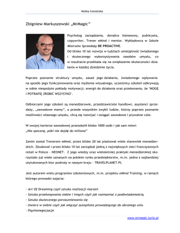 Notka trenerska Zbigniew Markuszewski „MrMagic” Psycholog zarządzania, doradca biznesowy, publicysta, copywriter, Trener eMind i mentor. Wykładowca w Szkole Mistrzów Sprzedaży BE PROACTIVE. Od blisko 10 lat rozwija w ludziach umiejętność świadomego i skutecznego wykorzystywania zasobów umysłu, co w rezultacie przekłada się na zwiększenie skuteczności działania w każdej dziedzinie życia. Poprzez poznanie struktury umysłu, zasad jego działania, świadomego wpływania na sposób jego funkcjonowania oraz myślenia wizualnego, uczestnicy szkoleń odkrywają w sobie niespożyte pokłady motywacji, energii do działania oraz przekonania, że "MOGĘ i POTRAFIĘ ZROBIĆ WSZYSTKO". Odbiorcami jego szkoleń są menedżerowie, przedstawiciele handlowi, asystenci sprzedaży, „zawodowe mamy”, a przede wszystkim zwykli ludzie, którzy poprzez poznanie możliwości własnego umysłu, chcą się rozwijać i osiągać zawodowe i prywatne cele. W swojej karierze zawodowej przeszkolił blisko 1000 osób i jak sam mówi: „Nie spocznę, póki nie dojdę do miliona” Zanim został Trenerem eMind, przez blisko 20 lat piastował wiele stanowisk menedżerskich. Zbudował i przez blisko 10 lat zarządzał jedną z największych sieci franczyzowych retail w Polsce - NEONET. Z jego wiedzy oraz wieloletniej praktyki menedżerskiej skorzystało już wiele uznanych na polskim rynku przedsiębiorstw, m.in. jedno z najbardziej utytułowanych biur podroży w naszym kraju - TRAVELPLANET.PL Jest autorem wielu programów szkoleniowych, m.in. projektu eMind Training, w ramach którego prowadzi zajęcia: - Art Of Dreaming czyli sztuka realizacji marzeń - Sztuka przekonywania siebie i innych czyli jak rozmawiać z podświadomością - Sztuka skutecznego porozumiewania się - Uwierz w siebie czyli jak włączyć autopilota prowadzącego do obranego celu - Psychonegocjacje www.mrmagic.turio.pl Notka trenerska - Neurosprzedaż i Neuromarketing - Neurocopywriting - NLP Business Sales System - W 100 dni do celu W wolnych chwilach oddaje się swojej pasji życiowej, pisząc poradniki w formie ebooków. Jest autorem takich pozycji, jak: „Jak nadawać na tych samych falach”, „Algorytm Dobrobytu”, „eMail Manipulator czyli sztuka perswazji i wywierania wpływu poprzez pocztę email”, „Praktyczny poradnik zarabiania pieniędzy i spełniania marzeń” oraz „Hipnotyczny Copywriting czyli jak napisać tekst, który zachwyci, sprzeda, a ludzie będą go czytać z zapartym tchem” Na łamach gazety Manager MLM, udziela się także jako publicysta, pisząc artykuły związane z zarządzaniem oraz sztuką osiągania celów biznesowych i prywatnych. Absolwent Wyższej Szkoły Zarządzania „Edukacja” we Wrocławiu, którą ukończył z tytułem Mgr Psychologii Zarządzania. Prywatnie muzyk. www.mrmagic.turio.pl