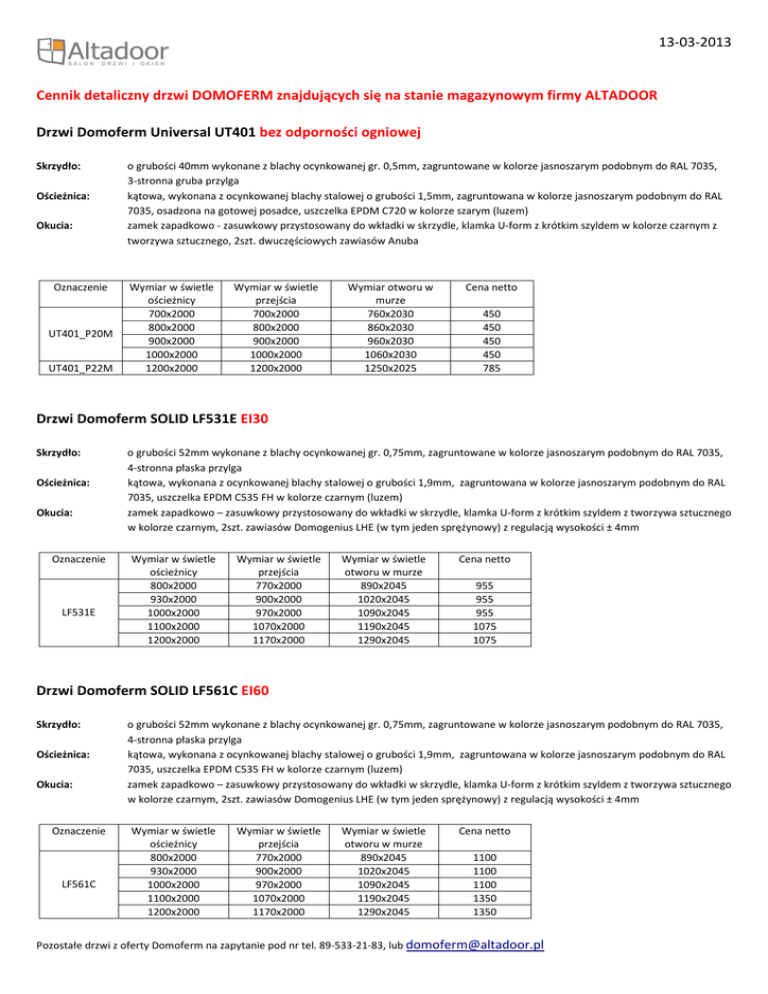 13-03-2013 Cennik detaliczny drzwi DOMOFERM znajdujących się na stanie magazynowym firmy ALTADOOR Drzwi Domoferm Universal UT401 bez odporności ogniowej Skrzydło: Ościeżnica: Okucia: Oznaczenie UT401_P20M UT401_P22M o grubości 40mm wykonane z blachy ocynkowanej gr. 0,5mm, zagruntowane w kolorze jasnoszarym podobnym do RAL 7035, 3-stronna gruba przylga kątowa, wykonana z ocynkowanej blachy stalowej o grubości 1,5mm, zagruntowana w kolorze jasnoszarym podobnym do RAL 7035, osadzona na gotowej posadce, uszczelka EPDM C720 w kolorze szarym (luzem) zamek zapadkowo - zasuwkowy przystosowany do wkładki w skrzydle, klamka U-form z krótkim szyldem w kolorze czarnym z tworzywa sztucznego, 2szt. dwuczęściowych zawiasów Anuba Wymiar w świetle ościeżnicy 700x2000 800x2000 900x2000 1000x2000 1200x2000 Wymiar w świetle przejścia 700x2000 800x2000 900x2000 1000x2000 1200x2000 Wymiar otworu w murze 760x2030 860x2030 960x2030 1060x2030 1250x2025 Cena netto 450 450 450 450 785 Drzwi Domoferm SOLID LF531E EI30 Skrzydło: Ościeżnica: Okucia: Oznaczenie LF531E o grubości 52mm wykonane z blachy ocynkowanej gr. 0,75mm, zagruntowane w kolorze jasnoszarym podobnym do RAL 7035, 4-stronna płaska przylga kątowa, wykonana z ocynkowanej blachy stalowej o grubości 1,9mm, zagruntowana w kolorze jasnoszarym podobnym do RAL 7035, uszczelka EPDM C535 FH w kolorze czarnym (luzem) zamek zapadkowo – zasuwkowy przystosowany do wkładki w skrzydle, klamka U-form z krótkim szyldem z tworzywa sztucznego w kolorze czarnym, 2szt. zawiasów Domogenius LHE (w tym jeden sprężynowy) z regulacją wysokości ± 4mm Wymiar w świetle ościeżnicy 800x2000 930x2000 1000x2000 1100x2000 1200x2000 Wymiar w świetle przejścia 770x2000 900x2000 970x2000 1070x2000 1170x2000 Wymiar w świetle otworu w murze 890x2045 1020x2045 1090x2045 1190x2045 1290x2045 Cena netto 955 955 955 1075 1075 Drzwi Domoferm SOLID LF561C EI60 Skrzydło: Ościeżnica: Okucia: Oznaczenie LF561C o grubości 52mm wykonane z blachy ocynkowanej gr. 0,75mm, zagruntowane w kolorze jasnoszarym podobnym do RAL 7035, 4-stronna płaska przylga kątowa, wykonana z ocynkowanej blachy stalowej o grubości 1,9mm, zagruntowana w kolorze jasnoszarym podobnym do RAL 7035, uszczelka EPDM C535 FH w kolorze czarnym (luzem) zamek zapadkowo – zasuwkowy przystosowany do wkładki w skrzydle, klamka U-form z krótkim szyldem z tworzywa sztucznego w kolorze czarnym, 2szt. zawiasów Domogenius LHE (w tym jeden sprężynowy) z regulacją wysokości ± 4mm Wymiar w świetle ościeżnicy 800x2000 930x2000 1000x2000 1100x2000 1200x2000 Wymiar w świetle przejścia 770x2000 900x2000 970x2000 1070x2000 1170x2000 Wymiar w świetle otworu w murze 890x2045 1020x2045 1090x2045 1190x2045 1290x2045 Cena netto 1100 1100 1100 1350 1350 Pozostałe drzwi z oferty Domoferm na zapytanie pod nr tel. 89-533-21-83, lub [email protected]