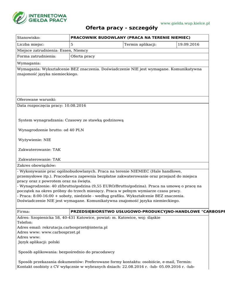 Oferta pracy - szczegóły www.gielda.wup.kielce.pl Stanowisko: PRACOWNIK BUDOWLANY (PRACA NA TERENIE NIEMIEC) Liczba miejsc: 5 Termin aplikacji: 19.09.2016 Miejsce zatrudnienia: Essen, Niemcy Forma zatrudnienia: Oferta pracy Wymagania: Wymagania: Wykształcenie BEZ znaczenia. Doświadczenie NIE jest wymagane. Komunikatywna znajomość języka niemieckiego. Oferowane warunki: Data rozpoczęcia pracy: 10.08.2016 System wynagradzania: Czasowy ze stawką godzinową Wynagrodzenie brutto: od 40 PLN Wyżywienie: NIE Zakwaterowanie: TAK Zakwaterowanie: TAK Zakres obowiązków: - Wykonywanie prac ogólnobudowlanych. Praca na terenie NIEMIEC (Hale handlowe, przemysłowe itp.). Pracodawca zapewnia bezpłatne zakwaterowanie oraz przejazd do miejsca pracy oraz z powrotem oraz na święta. - Wynagrodzenie: 40 zł/brutto/godzina (9,55 EURO/Brutto/godzina). Praca na umowę o pracę na początek na okres próbny do trzech miesięcy. Praca w pełnym wymiarze czasu pracy. - Praca: 8:00-16:00 + soboty, niedziele - według grafiku. Wykształcenie BEZ znaczenia. Doświadczenie NIE jest wymagane. Komunikatywna znajomość języka niemieckiego. Firma: PRZEDSIĘBIORSTWO USŁUGOWO-PRODUKCYJNO-HANDLOWE "CARBOSPR Adres: Szopienicka 58, 40-431 Katowice, powiat: m. Katowice, woj: śląskie Telefon: Adres email: [email protected] Adres www: www.carbosprzet.pl Adres www: Język aplikacji: polski Sposób aplikowania: bezpośrednio do pracodawcy Sposób przekazania dokumentów: Preferowane formy kontaktu: osobiście, e-mail, Termin: Kontakt osobisty z CV wyłącznie w wybranych dniach: 22.08.2016 r. -lub- 05.09.2016 r. -lub- 19.09.2016 r. w godzinach: 9:00-10:00 lub e-mail, Godziny : 9:00-10:00 - KONIECZNIE ZABRAĆ CV !!! Wymagane dokumenty: - Kontakt osobisty z CV wyłącznie w wybranych dniach: 22.08.2016 r. -lub- 05.09.2016 r. -lub- 19.09.2016 r. w godzinach: 9:00-10:00 (ul. Szopienicka 58, 40-431 Katowice) - Kontakt również e-mail: [email protected] (przesłać CV) Uwagi: Identyfikator oferty: StPr/16/3442 Instytucja koordynująca ofertę: Powiatowy Urząd Pracy w Katowicach Urząd Pracy dokłada wszelkich starań, aby oferty pracy będące w zasobach urzędu, były rzetelne i wiarygodne. Ponieważ wszystkie oferty pracy pochodzą od osób trzecich Urząd Pracy zastrzega, że odpowiedzialność za ewentualne rozbieżności pomiędzy warunkami pracy zaprezentowanymi w niniejszej ofercie a warunkami zaproponowanymi przez potencjalnego pracodawcę ponosi pracodawca.