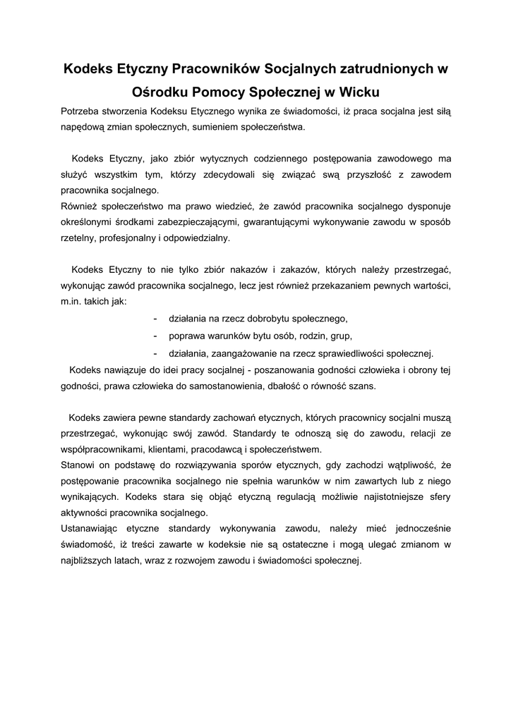 Kodeks Etyczny Pracowników Socjalnych zatrudnionych w Ośrodku Pomocy Społecznej w Wicku Potrzeba stworzenia Kodeksu Etycznego wynika ze świadomości, iż praca socjalna jest siłą napędową zmian społecznych, sumieniem społeczeństwa. Kodeks Etyczny, jako zbiór wytycznych codziennego postępowania zawodowego ma służyć wszystkim tym, którzy zdecydowali się związać swą przyszłość z zawodem pracownika socjalnego. Również społeczeństwo ma prawo wiedzieć, że zawód pracownika socjalnego dysponuje określonymi środkami zabezpieczającymi, gwarantującymi wykonywanie zawodu w sposób rzetelny, profesjonalny i odpowiedzialny. Kodeks Etyczny to nie tylko zbiór nakazów i zakazów, których należy przestrzegać, wykonując zawód pracownika socjalnego, lecz jest również przekazaniem pewnych wartości, m.in. takich jak: działania na rzecz dobrobytu społecznego, poprawa warunków bytu osób, rodzin, grup, działania, zaangażowanie na rzecz sprawiedliwości społecznej. Kodeks nawiązuje do idei pracy socjalnej poszanowania godności człowieka i obrony tej godności, prawa człowieka do samostanowienia, dbałość o równość szans. Kodeks zawiera pewne standardy zachowań etycznych, których pracownicy socjalni muszą przestrzegać, wykonując swój zawód. Standardy te odnoszą się do zawodu, relacji ze współpracownikami, klientami, pracodawcą i społeczeństwem. Stanowi on podstawę do rozwiązywania sporów etycznych, gdy zachodzi wątpliwość, że postępowanie pracownika socjalnego nie spełnia warunków w nim zawartych lub z niego wynikających. Kodeks stara się objąć etyczną regulacją możliwie najistotniejsze sfery aktywności pracownika socjalnego. Ustanawiając etyczne standardy wykonywania zawodu, należy mieć jednocześnie świadomość, iż treści zawarte w kodeksie nie są ostateczne i mogą ulegać zmianom w najbliższych latach, wraz z rozwojem zawodu i świadomości społecznej. Dział I Ogólna postawa i sposób postępowania pracownika socjalnego. 1. Pracownika socjalnego powinno cechować wysokie morale zawodowe i osobiste; 2. Obowiązkiem pracownika socjalnego jest posiadanie i doskonalenie kwalifikacji zawodowych; 3. Pracownik socjalny powinien wykorzystywać w swej pracy zawodowej wiedzę, umiejętności i wartości leżące u podstaw pracy socjalnej; 4. Pracownik socjalny zobowiązany jest kierować się w działalności zawodowej zasadą dobra klienta; 5. Pracownik socjalny zobowiązany jest przeciwstawiać się praktykom niehumanitarnym lub dyskryminującym osobę czy grupę osób; 6. Pracownik socjalny powinien ponosić ostateczną odpowiedzialność za jakość i zakres świadczeń, do których się zobowiązuje, które zleca lub wykonuje; 7. Pracownik socjalny nie może wykorzystywać kontaktów służbowych dla własnych korzyści; 8. Pracownik socjalny powinien przestrzegać zasady, że podstawowym jego obowiązkiem zawodowym jest pomoc w rozwiązywaniu trudności życiowych klienta. Dział II Odpowiedzialność etyczna pracownika socjalnego wobec klienta. 1. Pracownik socjalny zobowiązany jest do poszanowania godności klienta i jego prawa do samostanowienia; 2. Pracownik socjalny jest zobowiązany do równego traktowania klientów bez względu na wiek, płeć, stan cywilny, orientację seksualną, narodowość, wyznanie przekonania polityczne, stan zdrowia, rasę, kolor skóry oraz inne preferencje i cechy osobiste; 3. Pracownik socjalny powinien uznać zasadę spolegliwej opiekuńczości za podstawową regułę określającą kontakty z klientem; 4. Pracownik socjalny zobowiązany jest wykazać zaangażowanie na rzecz pomocy klientowi w rozwiązywaniu jego trudności życiowych oraz wykorzystać w tym celu swoją wiedzę, umiejętności zawodowe i kompetencje; 5. Pracownik socjalny powinien stosownie do możliwości klienta wzmacniać jego wysiłki na rzecz życiowego usamodzielnienia; 6. Pracownik socjalny zobowiązany jest do udzielenie klientowi pełnej informacji na temat dostępnych świadczeń; 7. Pracownik socjalny powinien udzielić klientowi precyzyjnej informacji na temat uprawnień do świadczeń i wynikających stąd zobowiązań. 8. Pracownik socjalny winien zasięgnąć konsultacji współpracowników i zwierzchników w przypadku, gdy leży to w żywotnym interesie klienta; 9. Pracownik socjalny za zgodą klienta ma prawo zaprzestać świadczenia pomocy, gdy wyczerpane zostały przewidziane prawem świadczenia lub gdy takie świadczenia nie są już potrzebne; 10. Pracownik socjalny ma prawo do zmiany formy udzielanej pomocy w przypadku stwierdzenia wykorzystania świadczeń niezgodnie z przeznaczeniem; 11. Pracownik socjalny zobowiązany jest do zachowania w tajemnicy informacji uzyskanych od klienta w toku czynności zawodowych; 12. Pracownik socjalny ma prawo bez zgody klienta przekazywać poufne informacje wyłącznie wówczas, gdy przemawiają za tym ważne względy zawodowe. Dział III Odpowiedzialność etyczna pracownika socjalnego wobec współpracowników. 1. W swych kontaktach ze współpracownikami pracownik socjalny powinien: respektować wiedzę i doświadczenie; przestrzegać zasady lojalności zawodowej; w ocenach współpracowników kierować się obiektywizmem; w przypadku współpracowników naruszających zasady niniejszego kodeksu zająć krytyczne stanowisko w odpowiednim miejscu i czasie; 2. Pracownik socjalny powinien współpracować z innymi pracownikami socjalnymi w celu wykonywania obowiązków zawodowych; 3. Pracownik socjalny winien rozstrzygać konflikty ze współpracownikami bez uszczerbku dla klienta. Dział IV Odpowiedzialność etyczna pracownika socjalnego wobec pracodawcy. 1. Pracownik socjalny powinien przestrzegać zobowiązań podjętych wobec instytucji zatrudniającej; 2. Pracownik socjalny powinien dążyć do usprawnienia funkcjonowania macierzystej instytucji i poprawy efektywności świadczeń; 3. Pracownik socjalny powinien w sposób racjonalny dysponować 
