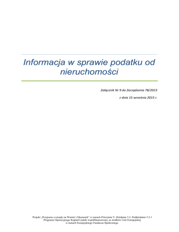 Informacja w sprawie podatku od nieruchomości Załącznik Nr 9 do Zarządzenia 78/2015 z dnia 15 września 2015 r. Projekt „Przyjazne e-urzędy na Warmii i Mazurach” w ramach Priorytetu V, Działanie 5.2, Poddziałanie 5.2.1 Programu Operacyjnego Kapitał Ludzki współfinansowany ze środków Unii Europejskiej w ramach Europejskiego Funduszu Społecznego Spis treści Użyte pojęcia i skróty.......................................................................................................................3 Wprowadzenie.................................................................................................................................3 Obsługa informacji w sprawie podatku od nieruchomości..............................................................3 Informacje, kogo dotyczy procedura...............................................................................................4 Wymagane dokumenty do realizacji procedury...............................................................................4 Miejsce składania dokumentów.......................................................................................................4 Opłaty..............................................................................................................................................4 Tryb odwoławczy.............................................................................................................................5 Podstawa prawna............................................................................................................................5 Załączniki.........................................................................................................................................5 Projekt „Przyjazne e-urzędy na Warmii i Mazurach” w ramach Priorytetu V, Działanie 5.2, Poddziałanie 5.2.1 Programu Operacyjnego Kapitał Ludzki współfinansowany ze środków Unii Europejskiej w ramach Europejskiego Funduszu Społecznego 2 Użyte pojęcia i skróty Definicje użytych pojęć zawiera ustawa z dnia 29 sierpnia 1997 r. – Ordynacja podatkowa oraz ustawa z dnia 12 stycznia 1991 r. o podatkach i opłatach lokalnych. Wprowadzenie Informację w sprawie podatku od nieruchomości składa się w terminie 14 dni od zaistnienia okoliczności mających wpływ na powstanie, bądź wygaśnięcie obowiązku podatkowego lub zaistnienia zdarzeń mających wpływ na wysokość podatku, organowi podatkowemu, właściwemu ze względu na miejsce położenia nieruchomości. Formą realizacji sprawy jest określenie wysokości zobowiązania podatkowego i wydanie decyzji określającej wysokość zobowiązania podatkowego. Obsługa informacji w sprawie podatku od nieruchomości Role: Podatnik podatku od nieruchomości – właściciel / współwłaściciel nieruchomości lub obiektów budowlanych lub użytkownik / współużytkownik wieczysty gruntów lub posiadacz / współposiadacz nieruchomości lub ich części albo obiektów budowlanych lub ich części. Wójt Gminy Kętrzyn - organ właściwy ze względu na położenie nieruchomości, do którego składana jest informacja. Przebieg procedury: KROK 1. Złożenie informacji wraz z ewentualnymi załącznikami. Podatnik składa informację w sprawie podatku od nieruchomości wraz z ewentualnymi załącznikami. Organem właściwym, do którego składana jest informacja jest Wójt Gminy Kętrzyn. Informacja może być składana za pomocą środków komunikacji elektronicznej. Uczestnicy: Podatnik podatku od nieruchomości. KROK 2. Weryfikacja formalna i merytoryczna informacji i załączników. Organ właściwy dokonuje sprawdzenia kompletności dokumentów i poprawności danych zawartych w złożonej informacji. W przypadku stwierdzonych braków formalnych lub niepoprawności danych organ wzywa pisemnie lub za pomocą środków komunikacji elektronicznej podatnika do uzupełnienia braków formalnych i/lub złożenia wyjaśnień lub uzupełnienia dokumentów w nieprzekraczalnym terminie 7 dni, od daty otrzymania wezwania na złożenie wyjaśnień lub uzupełnienie braków. W przypadku nie usunięcia braków lub nieprawidłowości w złożonych dokumentach w wyznaczonym w wezwaniu terminie, organ właściwy przygotowuje i wysyła do podatnika zawiadomienie o wszczęciu postępowania podatkowego. Złożenie przez podatnika wyjaśnień w terminie wskazanym w wezwaniu i akceptacja ich przez organ wykonawczy powoduje wydanie decyzji o umorzeniu postępowania. Projekt „Przyjazne e-urzędy na Warmii i Mazurach” w ramach Priorytetu V, Działanie 5.2, Poddziałanie 5.2.1 Programu Operacyjnego Kapitał Ludzki współfinansowany ze środków Unii Europejskiej w ramach Europejskiego Funduszu Społecznego 3 Uczestnicy: Wójt Gminy Kętrzyn. KROK 3. Wydanie decyzji określającej wysokość zobowiązania podatkowego. Organ właściwy wydaje decyzję określającą wysokość zobowiązania podatkowego. Decyzja może być doręczona za pomocą środków komunikacji elektronicznej. Uczestnicy: Wójt Gminy Kętrzyn. Informacje, kogo dotyczy procedura Procedura dotyczy osób fizycznych będących właścicielami nieruchomości lub obiektów budowlanych, posiadaczami samoistnymi nieruchomości lub obiektów budowlanych, użytkownikami wieczystymi gruntów, posiadaczami nieruchomości lub ich części albo obiektów budowlanych lub ich części, stanowiących własność Skarbu Państwa lub jednostki samorządu terytorialnego. Wymagane dokumenty do realizacji procedury 1. 2. 3. 4. 5. 6. 7. 8. Informacja w sprawie podatku od nieruchomości – IN-1. Dane o nieruchomościach i obiektach budowlanych – ZN-1/A, Dane o zwolnieniach i ulgach podatkowych w podatku od nieruchomości – ZN-1/B. Dokumenty potwierdzające powstanie obowiązku podatkowego, np. akt notarialny, umowa kupna-sprzedaży, umowa dzierżawy itp. Wykaz współwłaścicieli, współposiadaczy, współużytkowników. Dokumenty potwierdzające zmianę podstawy opoda