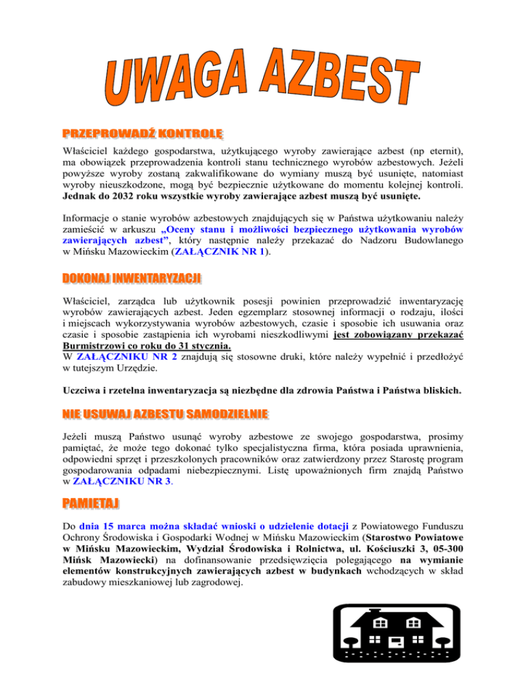 Właściciel kaŜdego gospodarstwa, uŜytkującego wyroby zawierające azbest (np eternit), ma obowiązek przeprowadzenia kontroli stanu technicznego wyrobów azbestowych. JeŜeli powyŜsze wyroby zostaną zakwalifikowane do wymiany muszą być usunięte, natomiast wyroby nieuszkodzone, mogą być bezpiecznie uŜytkowane do momentu kolejnej kontroli. Jednak do 2032 roku wszystkie wyroby zawierające azbest muszą być usunięte. Informacje o stanie wyrobów azbestowych znajdujących się w Państwa uŜytkowaniu naleŜy zamieścić w arkuszu „Oceny stanu i moŜliwości bezpiecznego uŜytkowania wyrobów zawierających azbest”, który następnie naleŜy przekazać do Nadzoru Budowlanego w Mińsku Mazowieckim (ZAŁĄCZNIK NR 1). Właściciel, zarządca lub uŜytkownik posesji powinien przeprowadzić inwentaryzację wyrobów zawierających azbest. Jeden egzemplarz stosownej informacji o rodzaju, ilości i miejscach wykorzystywania wyrobów azbestowych, czasie i sposobie ich usuwania oraz czasie i sposobie zastąpienia ich wyrobami nieszkodliwymi jest zobowiązany przekazać Burmistrzowi co roku do 31 stycznia. W ZAŁĄCZNIKU NR 2 znajdują się stosowne druki, które naleŜy wypełnić i przedłoŜyć w tutejszym Urzędzie. Uczciwa i rzetelna inwentaryzacja są niezbędne dla zdrowia Państwa i Państwa bliskich. JeŜeli muszą Państwo usunąć wyroby azbestowe ze swojego gospodarstwa, prosimy pamiętać, Ŝe moŜe tego dokonać tylko specjalistyczna firma, która posiada uprawnienia, odpowiedni sprzęt i przeszkolonych pracowników oraz zatwierdzony przez Starostę program gospodarowania odpadami niebezpiecznymi. Listę upowaŜnionych firm znajdą Państwo w ZAŁĄCZNIKU NR 3. Do dnia 15 marca moŜna składać wnioski o udzielenie dotacji z Powiatowego Funduszu Ochrony Środowiska i Gospodarki Wodnej w Mińsku Mazowieckim (Starostwo Powiatowe w Mińsku Mazowieckim, Wydział Środowiska i Rolnictwa, ul. Kościuszki 3, 05-300 Mińsk Mazowiecki) na dofinansowanie przedsięwzięcia polegającego na wymianie elementów konstrukcyjnych zawierających azbest w budynkach wchodzących w skład zabudowy mieszkaniowej lub zagrodowej. ZAŁĄCZNIK NR 1 OCENA stanu i moŜliwości bezpiecznego uŜytkowania wyrobów zawierających azbest Miejsce/ obiekt/ urządzenie budowlane /instalacja przemysłowa: ............................................................... Adres miejsca/ obiektu/ urządzenia budowlanego/ instalacji przemysłowej: ............................................................... Pomieszczenie: ................................................ Rodzaj/nazwa wyrobu 1) ........................................ Ilość wyrobów (m2, tony) 2) ................................... Grupa / Nr I. 1. 2. 3. 4. II. 5. 6. III. 7. 8. 9. IV. 10. 11. 12. V. 13. 14. 15. 16. 17. 18. 19. VI. 20. 21. 22. 23. VII. 24. 25. 26. Wyrób - rodzaj Sposób zastosowania azbestu Powierzchnia pokryta masą natryskową z azbestem (torkret) Tynk zawierający azbest Lekkie płyty izolacyjne z azbestem (cięŜar obj. < 1.000 kg/m3) Pozostałe wyroby z azbestem Rodzaj azbestu Azbest chryzotylowy Inny azbest (np. krokidolit) Struktura powierzchni wyrobu z azbestem Rozluźniona (naruszona) struktura włókien Mocna struktura włókien, lecz bez albo z niewystarczającą powłoką farby zewnętrznej Pomalowana i nieuszkodzona powłoka zewnętrzna Stan zewnętrzny wyrobu z azbestem DuŜe uszkodzenia Małe uszkodzenia Brak MoŜliwość uszkodzenia powierzchni wyrobu z azbestem Wyrób jest przedmiotem jakichś prac Wyrób przez bezpośrednią dostępność naraŜony na uszkodzenia (do wysokości 2 m) Wyrób naraŜony na uszkodzenia mechaniczne Wyrób naraŜony na wstrząsy i drgania Wyrób naraŜony na działanie czynników atmosferycznych (na zewnątrz obiektu) Wyrób znajduje się w zasięgu silnych ruchów powietrza Wyrób nie jest naraŜony na wpływy zewnętrzne Wykorzystanie pomieszczenia Regularnie przez dzieci, młodzieŜ lub sportowców Trwałe lub częste przebywanie w pomieszczeniach innych osób Czasowo wykorzystywane pomieszczenie Rzadko wykorzystywane pomieszczenie Usytuowanie wyrobu Bezpośrednio w pomieszczeniu Za zawieszonym, nieszczelnym sufitem lub innym pokryciem W systemie wywietrzania pomieszczenia (kanały Ocena Przyjęta punktacja 30 30 25 10 5 15 30 10 0 30 10 0 15 10 10 10 10 10 0 35 30 20 10 30 25 25 3) 4) 27. wentylacyjne) Za zawieszonym szczelnym sufitem lub innym pokryciem, ponad pyłoszczelną powierzchnią lub poza szczelnym kanałem wentylacyjnym 10 Suma punktów oceny ................... Stopień pilności I (wymiana lub naprawa wymagana 65 i więcej punktów bezzwłocznie) Stopień pilności II (ponowna ocena wymagana w czasie powyŜej 35 do 60 do 1 roku) punktów Stopień pilności III (ponowna ocena w terminie do 5 lat) do 35 punktów UWAGA: podkreślić naleŜy tylko jedną pozycję w grupie, jeśli wystąpi więcej niŜ jedna, podkreślić naleŜy najwyŜszą punktację. Zsumować ilość punktów, ustalić ocenę końcową i stopień pilności. ............................. ......................... Oceniający nazwisko i imię Właściciel / Zarządca ......................... Adres data .............. 1) Według klasyfikacji wyrobów przyjętych w sprawozdaniu rocznym - załącznik nr 2 do rozporządzenia Ministra Gospodarki, Pracy i Polityki Społecznej z dnia 23 października 2003r. w sprawie wymagań w zakresie wykorzystywania i przemieszczania azbestu oraz wykorzystywania i oczyszczania instalacji lub urządzeń, w których był lub jest wykorzystywany azbest (Dz. U. Nr 192, poz. 1876). 2) Zgodnie z inwentaryzacją i sprawozdaniem rocznym - § 7 wymienionego w odnośniku 1 rozporządzenia. 3) DuŜe uszkodzenia - widoczne pęknięcia lub ubytki na powierzchni równej lub większej niŜ 3 % powierzchni wyrobu. 4) Małe uszkodzenia - brak widocznych pęknięć, a ubytki na powierzchni mniejszej niŜ 3 % powierzchni wyrobu. ZAŁĄCZNIK Nr 2 WZÓR INFORMACJA O WYROBACH ZAWIERAJĄCYCH 