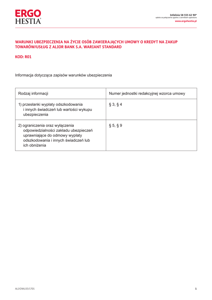 Infolinia 58 555 62 90* opłata za połączenie zgodna z cennikiem operatora www.ergohestia.pl WARUNKI UBEZPIECZENIA NA ŻYCIE OSÓB ZAWIERAJĄCYCH UMOWY O KREDYT NA ZAKUP TOWARÓW/USŁUG Z ALIOR BANK S.A. WARIANT STANDARD KOD: R01 Informacja dotycząca zapisów warunków ubezpieczenia Rodzaj informacji Numer jednostki redakcyjnej wzorca umowy 1) przesłanki wypłaty odszkodowania i innych świadczeń lub wartości wykupu ubezpieczenia § 3, § 4 2) ograniczenia oraz wyłączenia odpowiedzialności zakładu ubezpieczeń uprawniające do odmowy wypłaty odszkodowania i innych świadczeń lub ich obniżenia § 5, § 9 ALI/OWU35/1701 1 Infolinia 58 555 62 90* opłata za połączenie zgodna z cennikiem operatora www.ergohestia.pl POSTANOWIENIA OGÓLNE §1 Niniejsze warunki ubezpieczenia (dalej zwane „warunkami ubezpieczenia”) regulują zasady, zakres i warunki udzielania przez Ubezpieczyciela ochrony ubezpieczeniowej, dotyczące zgonu Ubezpieczonego. Ponadto znajdują się tu regulacje dotyczące czasu trwania tej ochrony (jej początku i zakończenia, w tym odstąpienia i rezygnacji z ubezpieczenia), zasady ustalania wysokości i płatności składki ubezpieczeniowej, wysokość świadczeń oraz zasady ich wypłaty, ograniczenia lub wyłączenia odpowiedzialności Ubezpieczyciela, powinności i obowiązki Ubezpieczającego lub Ubezpieczonego, zasady składania i rozpatrywania reklamacji. §2 Terminom użytym w niniejszych warunkach ubezpieczenia nadano następujące znaczenia: 1) deklaracja zgody - oświadczenie Klienta Alior Banku o zgodzie na objęcie ubezpieczeniem, składane Ubezpieczającemu przy zawieraniu umowy kredytu w następujący sposób: a)pisemnie, b) za pomocą środków porozumiewania się na odległość - wyłącznie w związku z zawarciem umowy o kredyt w kwocie nie wyższej niż 20.000 zł (słownie: dwadzieścia tysięcy złotych); złożenie deklaracji zgody jest warunkiem niezbędnym dla objęcia Klienta Alior Banku ochroną ubezpieczeniową; operatorem środków porozumiewania się na odległość jest Alior Bank; 2) harmonogram spłat - dokument określający terminy płatności wszystkich rat przewidzianych umową o kredyt, wysokości tych rat i poziom zadłużenia Klienta Alior Banku w ramach umowy o kredyt po spłacie każdej z rat; 3) karencja - okres, w którym Ubezpieczyciel nie ponosi odpowiedzialności lub odpowiedzialność Ubezpieczyciela jest ograniczona, uwzględniany w wyliczeniu wysokości składki ubezpieczeniowej, występujący w zakresie i w sytuacjach wskazanych w warunkach ubezpieczenia; 4) Klient Alior Banku/Kredytobiorca - osoba fizyczna korzystająca z usług Alior Banku, która zawarła z Alior Bankiem umowę o kredyt; 5) kredyt - kredyt/pożyczka na zakup towarów/usług w kwocie nie wyższej niż 40.000 zł (słownie: czterdzieści tysięcy złotych), udzielany na okres nie dłuższy niż 60 miesięcy, w ramach umowy o kredyt, określającej wysokość oraz warunki spłaty kredytu, zawartej pisemnie lub za pomocą środków porozumiewania się na odległość; 6) nieszczęśliwy wypadek - nagłe, niezależne od woli Ubezpieczonego i gwałtowne zdarzenie wywołane przyczyną zewnętrzną, będące bezpośrednią i wyłączną przyczyną zaistnienia zdarzenia ubezpieczeniowego; odpowiedzialność Ubezpieczyciela dotyczy wyłącznie zdarzeń będących następstwem nieszczęśliwego wypadku zaistniałego w okresie świadczenia ochrony ubezpieczeniowej; 7) pierwotny harmonogram spłat - harmonogram spłat obowiązujący jako pierwszy w umowie o kredyt; 8) rata - rata kapitałowo-odsetkowa kredytu przypadająca do spłaty w terminie płatności określonym w harmonogramie spłat; 9) saldo zadłużenia - saldo zadłużenia na rachunku umowy o kredyt (kapitał pozostający do spłaty); 10) środki porozumiewania się na odległość - środki umożliwiające komunikację bez jednoczesnej fizycznej obecności stron, w szczególności telefon, poczta elektroniczna, drukowany lub elektroniczny formularz zamówienia; 11) Ubezpieczający/Alior Bank - Alior Bank Spółka Akcyjna z siedzibą w Warszawie przy ul. Łopuszańskiej 38D; 12) ubezpieczenie/ochrona ubezpieczeniowa - odpowiedzialność Ubezpieczyciela względem Ubezpieczonego polegająca na zobowiązaniu do zapłaty określonego w warunkach ubezpieczenia świadczenia w razie zajścia zdarzenia ubezpieczeniowego, z zastrzeżeniem wyłączeń odpowiedzialności wskazanych w § 9 warunków ubezpieczenia; 13) Ubezpieczony - Klient Alior Banku/Kredytobiorca objęty ochroną ubezpieczeniową w ramach umowy ubezpieczenia; 14) Ubezpieczyciel - Sopockie Towarzystwo Ubezpieczeń na Życie ERGO Hestia Spółka Akcyjna z siedzibą w Sopocie przy ul. Hestii 1, 81-731 Sopot, wpisane do Rejestru Przedsiębiorców Krajowego Rejestru Sądowego prowadzonego przez Sąd Rejonowy Gdańsk-Północ w Gdańsku, VIII Wydział Gospodarczy Krajowego Rejestru Sądowego, pod numerem KRS 0000024807, wysokość kapitału zakładowego, który został opłacony w całości: 64.000.000 zł, NIP 585-12-45-589, ALI/OWU35/1701 2 Infolinia 58 555 62 90* opłata za połączenie zgodna z cennikiem operatora www.ergohestia.pl wykonujące działalność ubezpieczeniową za zezwoleniem Komisji Nadzoru Finansowego w Warszawie, Plac Powstańców Warszawy 1, 00-950 Warszawa; 15) Uposażony - podmiot wskazany przez Ubezpieczającego, za uprzednią zgodą Ubezpieczonego, uprawniony do otrzymania świadczenia ubezpieczeniowego z tytułu zgonu Ubezpieczonego; 16) umowa o kredyt - Umowa o kredyt na zakup towarów/usług zawierana przez Klienta Alior Banku/Kredytobiorcę z Alior Bankiem; 17) umowa ubezpieczenia - Umowa ubezpieczenia na życie osób zawierających umowy o kredyt na zakup towarów/usług z Alior Bank S.A. Nr PSR-ARLP zawarta pomiędzy Ubezpieczającym a Ubezpieczycielem; 18) wiek - liczba ukończonych pełnych lat życia; 19) zdarzenie ubezpieczeniowe - zgon Ubezpieczonego. PRZEDMIOT I ZAKRES UBEZPIECZENIA §3 1. Przedmiotem ube