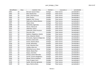 pon1_biologia_J_Tokar identyfikator 1D01 1D02 1D03 1D04 1D05 1D06 1D07 1D08 1D09 1D10 1D11 1D12 1D13 1D14 1D15 1D16 1D17 1D18 1D19 1D20 1D21 1D22 1D23 1D24 1D25 1D26 1D27 1D28 1D29 klasa 1D 1D 1D 1D 1D 1D 1D 1D 1D 1D 1D 1D 1D 1D 1D 1D 1D 1D 1D 1D 1D 1D 1D 1D 1D 1D 1D 1D 1D nazwisko i imię Bernard, Szymon Oskar Biok, Monika Ewa Bolek, Zofia Katarzyna Bryła, Paulina Bugajski, Piotr Tomasz Dąbrowska, Barbara Bożena Dogiel, Aneta Gardzińska, Agnieszka Hemon, Maciej Jan Jabłońska, Joanna Jankowska, Sylwia Krystyna Kaszucka, Julia Kędziora, Magdalena, Natalia Kinas, Sebastian Michał Klonowska, Dagmara Małgorzata Knosala, Justyna Julia Koston, Martina Maria Krutak, Aleksandra Krzak, Sebastian Piotr Ledwig, Łukasz Jan Michalczyk Laura, Maria Nielski, Maciej Piotr Rapacz, Dominika Rosicka, Joanna Weronika Serafin, Zuzanna Magdalena Sławek, Dariusz Arkadiusz Smak, Grzegorz Karol Spałek, Weronika Agnieszka Spyra, Martina Maria fakultet 1 biologia biologia biologia biologia biologia biologia biologia biologia biologia biologia biologia biologia biologia biologia biologia biologia biologia biologia biologia biologia biologia biologia biologia biologia biologia biologia biologia biologia biologia Strona 1 nauczyciel_1 Tokar Joanna Tokar Joanna Tokar Joanna Tokar Joanna Tokar Joanna Tokar Joanna Tokar Joanna Tokar Joanna Tokar Joanna Tokar Joanna Tokar Joanna Tokar Joanna Tokar Joanna Tokar Joanna Tokar Joanna Tokar Joanna Tokar Joanna Tokar Joanna Tokar Joanna Tokar Joanna Tokar Joanna Tokar Joanna Tokar Joanna Tokar Joanna Tokar Joanna Tokar Joanna Tokar Joanna Tokar Joanna Tokar Joanna 2014-12-07 poniedziałek poniedziałek 1 poniedziałek 1 poniedziałek 1 poniedziałek 1 poniedziałek 1 poniedziałek 1 poniedziałek 1 poniedziałek 1 poniedziałek 1 poniedziałek 1 poniedziałek 1 poniedziałek 1 poniedziałek 1 poniedziałek 1 poniedziałek 1 poniedziałek 1 poniedziałek 1 poniedziałek 1 poniedziałek 1 poniedziałek 1 poniedziałek 1 poniedziałek 1 poniedziałek 1 poniedziałek 1 poniedziałek 1 poniedziałek 1 poniedziałek 1 poniedziałek 1 poniedziałek 1 pon1_biologia_J_Tokar identyfikator 1D30 1D31 1D32 1D33 1D34 1D35 1D36 1D37 klasa 1D 1D 1D 1D 1D 1D 1D 1D nazwisko i imię Szlachetko, Agnieszka Alicja Szupieńko, Julia Maria Władyga, Aleksandra Marta Wojdyła, Joanna Patrycja Wojtaszek, Joanna Katarzyna Wołoszyn, Aleksandra Renata Żymańczyk, Katarzyna Maria Pietrek, Szymon Marek fakultet 1 biologia biologia biologia biologia biologia biologia biologia biologia Strona 2 nauczyciel_1 Tokar Joanna Tokar Joanna Tokar Joanna Tokar Joanna Tokar Joanna Tokar Joanna Tokar Joanna Tokar Joanna 2014-12-07 poniedziałek poniedziałek 1 poniedziałek 1 poniedziałek 1 poniedziałek 1 poniedziałek 1 poniedziałek 1 poniedziałek 1 poniedziałek 1