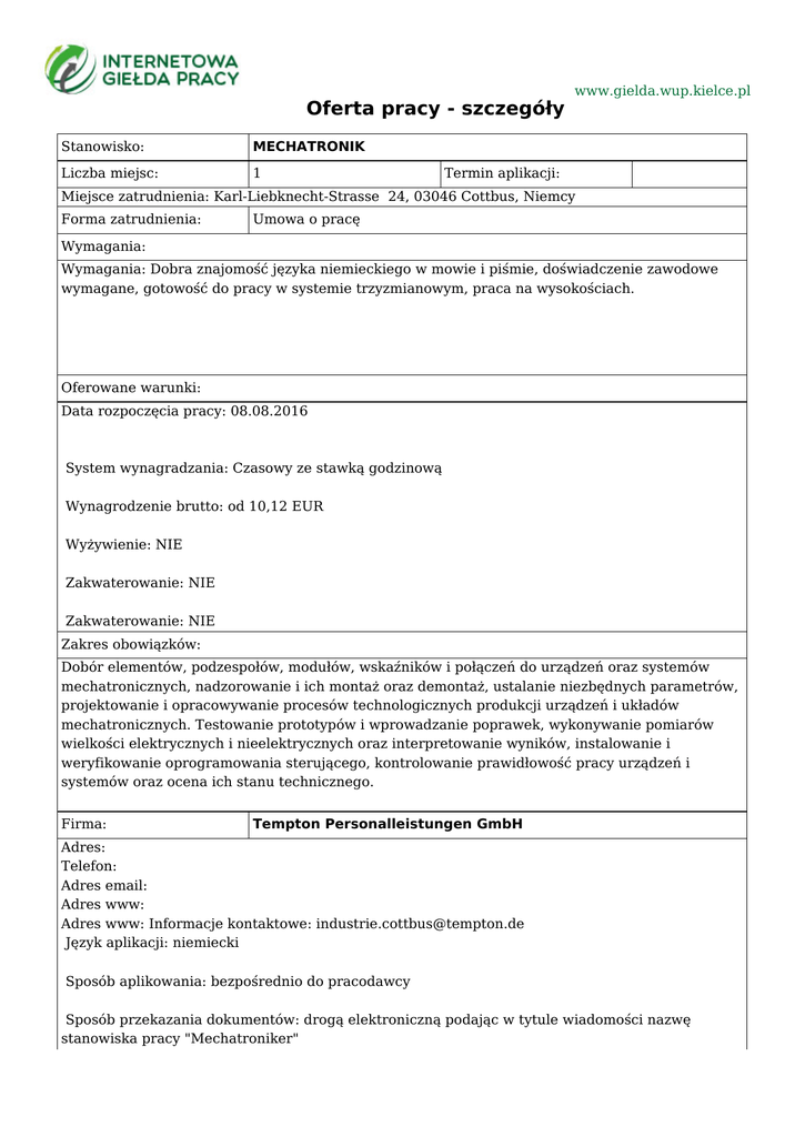 Oferta pracy - szczegóły Stanowisko: MECHATRONIK Liczba miejsc: 1 www.gielda.wup.kielce.pl Termin aplikacji: Miejsce zatrudnienia: Karl-Liebknecht-Strasse 24, 03046 Cottbus, Niemcy Forma zatrudnienia: Umowa o pracę Wymagania: Wymagania: Dobra znajomość języka niemieckiego w mowie i piśmie, doświadczenie zawodowe wymagane, gotowość do pracy w systemie trzyzmianowym, praca na wysokościach. Oferowane warunki: Data rozpoczęcia pracy: 08.08.2016 System wynagradzania: Czasowy ze stawką godzinową Wynagrodzenie brutto: od 10,12 EUR Wyżywienie: NIE Zakwaterowanie: NIE Zakwaterowanie: NIE Zakres obowiązków: Dobór elementów, podzespołów, modułów, wskaźników i połączeń do urządzeń oraz systemów mechatronicznych, nadzorowanie i ich montaż oraz demontaż, ustalanie niezbędnych parametrów, projektowanie i opracowywanie procesów technologicznych produkcji urządzeń i układów mechatronicznych. Testowanie prototypów i wprowadzanie poprawek, wykonywanie pomiarów wielkości elektrycznych i nieelektrycznych oraz interpretowanie wyników, instalowanie i weryfikowanie oprogramowania sterującego, kontrolowanie prawidłowość pracy urządzeń i systemów oraz ocena ich stanu technicznego. Firma: Tempton Personalleistungen GmbH Adres: Telefon: Adres email: Adres www: Adres www: Informacje kontaktowe: [email protected] Język aplikacji: niemiecki Sposób aplikowania: bezpośrednio do pracodawcy Sposób przekazania dokumentów: drogą elektroniczną podając w tytule wiadomości nazwę stanowiska pracy "Mechatroniker" Wymagane dokumenty: CV Uwagi: Identyfikator oferty: 12098-148234577-S Instytucja koordynująca ofertę: Wojewódzki Urząd Pracy w Zielonej Górze Urząd Pracy dokłada wszelkich starań, aby oferty pracy będące w zasobach urzędu, były rzetelne i wiarygodne. Ponieważ wszystkie oferty pracy pochodzą od osób trzecich Urząd Pracy zastrzega, że odpowiedzialność za ewentualne rozbieżności pomiędzy warunkami pracy zaprezentowanymi w niniejszej ofercie a warunkami zaproponowanymi przez potencjalnego pracodawcę ponosi pracodawca.