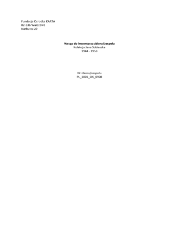 Fundacja Ośrodka KARTA 02-536 Warszawa Narbutta 29 Wstęp do inwentarza zbioru/zespołu Kolekcja Jana Sobieszka 1944 - 1953 Nr zbioru/zespołu PL_1001_OK_0908 I Charakterystyka twórcy zbioru/zespołu Jan Sobieszek urodził się w 1921 roku w rodzinie polskich zesłańców (prawdopodobnie w Kazachstanie). W czasie II wojny światowej został zmobilizowany do Armii Czerwonej, a następnie przeniesiony do 2 Armii Polskiej. W 1949 roku ożenił się z poznaną w wojsku na terenie Związku Sowieckiego sanitariuszką Tamarą Zawadzką. Po zakończeniu II wojny światowej J. Sobieszek pozostał w ludowym Wojsku Polskim. W 1953 roku był członkiem Misji Polskiej do Komisji Nadzorczej Państw Neutralnych, nadzorującej rozejm po zakończeniu wojny koreańskiej. Po powrocie do kraju służył w jednostkach wojskowych na terenie Wielkopolski i Pomorza. Zmarł w Gdańsku - Oliwie w latach 80. II Dzieje zbioru/zespołu Kolekcja została przekazana Archiwum Fotografii Fundacji Ośrodka KARTA przez Mariana Muczyńskiego 4 grudnia 2008 roku. Nie posiadała środka ewidencyjnego. W ewidencji archiwum otrzymała nazwę od nazwiska ofiarodawcy. Informacje dotyczące kolekcji, zgromadzone podczas studiów wstępnych, pozwoliły na ustalenie właściwego twórcy kolekcji – Jana Sobieszka. W związku z tym nazwa kolekcji została zmieniona. Po przeprowadzonej inwentaryzacji kolekcja składa się z dwóch jednostek archiwalnych. III Charakterystyka archiwalna zbioru/zespołu Tytuł: Kolekcja Jana Sobieszka Granice chronologiczne: 1944 - 1957 Granice terytorialne: Polska, Niemcy, Rosja, Korea Północna, Korea Południowa, Pakistan Rozmiar: Jednostki archiwalne: 2,00 IV Zawartość zbioru/zespołu W teczce o sygn. OK_0908_0001 znajdują się fotografie ze służby wojskowej Jana Sobieszka w ludowym Wojsku Polskim w latach 1944-1945. W teczce o sygn. OK_0908_0002 znajdują się fotografie płk Jana Sobieszka z jego pobytu w Korei jako obserwatora w Misji Polskiej do Komisji Nadzorczej Państw Neutralnych w Korei. V Metody porządkowania Kolekcja otrzymała układ schematyczno-rzeczowy, składa się z dwóch jednostek archiwalnych. Dla kolekcji sporządzono inwentarz książkowy i opatrzono go wstępem Bibliografia Brak Sygnatura jednostki archiwalnej 0001 Tytuł INWENTARZ Daty Opis zewnętrzny Służba wojskowa Jana Sobieszka w 1944 - Rozmiar ludowym Wojsku Polskim w latach 1945 dokumentów 40. ogółem: 5 fotografia sepia Sygnatury dawne Uwagi 0002 Pobyt obserwatorów z Komisji 1953 - Rozmiar Nadzorczej Państw Neutralnych w 1959 dokumentów Korei ogółem: 10 fotografia sepia Jednostka archiwalna nr 0001: Służba wojskowa Jana Sobieszka w ludowym Wojsku Polskim w latach 40. Rozmiar i nośnik: liczba dokumentów ogółem: 5 liczba dokumentów obrazowych: 5 odbitka fotograficzna Data: 1944 - 1945 Nazwa twórcy: Sobieszek, Jan (1921-?) Sygnatura dokumentu 0001 0002 0003 0004 0005 Spis dokumentów w jednostce archiwalnej Tytuł Daty Opis zewnętrzny Sygnatury dawne Żołnierz ludowego Wojska Polskiego 1944 - Dokument salutuje przed oficerami 1945 obrazowy Rozmiar (liczba stron): 1 Odbitka fot., sepia Defilada żołnierzy ludowego Wojska 1944 - Dokument Polskiego 1945 obrazowy Rozmiar (liczba stron): 1 Odbitka fot., sepia Żołnierze ludowego Wojska Polskiego 1944 - Dokument śpiewający wojskowe piosenki 1945 obrazowy Rozmiar (liczba stron): 1 Odbitka fot., sepia Żołnierze ludowego Wojska Polskiego 1944 - Dokument 1945 obrazowy Rozmiar (liczba stron): 1 Odbitka fot., sepia Grupa żołnierzy ludowego Wojska 1945 Dokument Polskiego obrazowy Rozmiar (liczba stron): 1 Uwagi Odbitka fot., sepia Jednostka archiwalna nr 0002: Pobyt obserwatorów z Komisji Nadzorczej Państw Neutralnych w Korei Rozmiar i nośnik: liczba dokumentów ogółem: 10 liczba dokumentów obrazowych: 10 Odbitka fotograficzna Data: 1953 - 1959 Nazwa twórcy: Sobieszek, Jan (1921-?) Spis dokumentów w jednostce archiwalnej Sygnatura Tytuł Daty Opis Sygnatury Uwagi dokumentu zewnętrzny dawne 0001 Obserwatorzy z Komisji Nadzorczej Państw 1953- Dokument Neutralnych w Korei w jednym z obozów w 09-04 obrazowy Strefie Zdemilitaryzowanej, powstałej po Rozmiar zakończeniu wojny koreańskiej (liczba stron): 1 Odbitka fot., sepia 0002 Przedstawiciele Komisji Nadzorczej Państw 1953- Dokument Neutralnych w Korei stacjonują w jednym z 09-04 obrazowy obozów w Strefie Zdemilitaryzowanej, Rozmiar powstałej po zakończeniu wojny koreańskiej (liczba stron): 1 Odbitka fot., sepia 0003 Obserwatorzy z Komisji Nadzorczej Państw 1953- Dokument Neutralnych w Korei stacjonują w jednym z 09-04 obrazowy obozów w Strefie Zdemilitaryzowanej, Rozmiar powstałej po zakończeniu wojny koreańskiej (liczba stron): 1 Odbitka fot., sepia 0004 Obserwatorzy z Komisji Nadzorczej Państw 1953- Dokument Neutralnych w Korei stoją przed bramą obozu w 09-04 obrazowy Strefie Zdemilitaryzowanej, powstałej po Rozmiar zakończeniu wojny koreańskiej (liczba stron): 1 Odbitka fot., sepia 0005 Kwatera główna Komisji Nadzorczej Państw 1953- Dokument Neutralnych w Koreańskiej Strefie 09-13 obrazowy Zdemilitaryzowanej, na linii demarkacyjnej Rozmiar między obydwoma państwami (liczba stron): 1 Odbitka fot., 0006 Kobieta niesie na głowie pakunek 195310-20 0007 Grupa polskich i czechosłowackich oficerów z 1953Komisji Nadzorczej Państw Neutralnych w Korei 11-11 pozuje do zdjęcia stojąc na amerykańskim czołgu M4 Sherman 0008 Obserwatorzy z Komisji Nadzorczej Państw Neutralnych, powstałej po zakończeniu wojny koreańskiej 0009 Żołnierze wchodzący w skład Komisji Nadzorczej 1953 Państw Neutralnych w Koreańskiej Strefie Zdemilitaryzowanej pozują do zdjęcia przed pomnikiem komunistycznym 0010 Żołnierze Koreańskiej Armii Ludowej 195311-20 1953 sepia Dokument obrazowy Rozmiar (liczba stron): 1 Odbitka fot., sepia Dokument obrazowy Rozmiar (liczba stron): 1 Odbitka fot., sepia Dokument obrazowy Rozmiar (liczba stron): 1 Odbitka fot., sepia Dokument obrazowy Ro