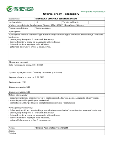 Oferta pracy - szczegóły Stanowisko: KIEROWCA CIĄGNIKA ELEKTRYCZNEGO Liczba miejsc: 10 www.gielda.wup.kielce.pl Termin aplikacji: Miejsce zatrudnienia: Landsberger Strasse 370a, 80687 Monachium, Niemcy Forma zatrudnienia: Umowa o pracę Wymagania: Wymagania: - dobra znajomość jęz. niemieckiego umożliwiająca swobodną komunikację - warunek konieczny, - prawo jazdy kategoria B - warunek konieczny, - doświadczenie w pracy na magazynie mile widziane, - doświadczenie w logistyce mile widziane, - gotowość do pracy w trybie 3 zmianowym. Oferowane warunki: Data rozpoczęcia pracy: 29.10.2015 System wynagradzania: Czasowy ze stawką godzinową Wynagrodzenie brutto: od 9,72 EUR Wyżywienie: NIE Zakwaterowanie: NIE Zakwaterowanie: NIE Zakres obowiązków: - zaopatrywanie linii produkcyjnych w części samochodowe za pomocą ciągnika elektrycznego - kontrola pojazdów pod kątem uszkodzeń - kontrola pojazdów pod kątem kompletności załadunku / rozładunku Wymagania pracodawcy: - dobra znajomość jęz. niemieckiego umożliwiająca swobodną komunikację - warunek konieczny, - prawo jazdy kategoria B - warunek konieczny, - doświadczenie w pracy na magazynie mile widziane, - doświadczenie w logistyce mile widziane, - gotowość do pracy w trybie 3 zmianowym. Firma: Adres: Telefon: Unique Personalservice GmbH Adres email: Adres www: www.work-in-germany.de Adres www: Informacje kontaktowe: [email protected] oraz do wiadomości doradcy EURES na adres e-mail: [email protected] W tytule maila proszę wpisać „Zugmaschinenfahrer” Język aplikacji: niemiecki Sposób aplikowania: do agencji Sposób przekazania dokumentów: e-mail Wymagane dokumenty: CV w jęz. niemieckim Uwagi: Identyfikator oferty: 12913-264765820-S Instytucja koordynująca ofertę: Wojewódzki Urząd Pracy w Gdańsku Urząd Pracy dokłada wszelkich starań, aby oferty pracy będące w zasobach urzędu, były rzetelne i wiarygodne. Ponieważ wszystkie oferty pracy pochodzą od osób trzecich Urząd Pracy zastrzega, że odpowiedzialność za ewentualne rozbieżności pomiędzy warunkami pracy zaprezentowanymi w niniejszej ofercie a warunkami zaproponowanymi przez potencjalnego pracodawcę ponosi pracodawca.