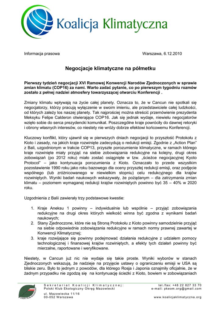 Informacja prasowa Warszawa, 6.12.2010 Negocjacje klimatyczne na półmetku Pierwszy tydzień negocjacji XVI Ramowej Konwencji Narodów Zjednoczonych w sprawie zmian klimatu (COP16) za nami. Warto zadać pytanie, co po pierwszym tygodniu rozmów zostało z pełnej nadziei atmosfery towarzyszącej otwarciu Konferencji . Zmiany klimatu wpływają na życie całej planety. Oznacza to, że w Cancun nie spotkali się negocjatorzy, którzy pracują wyłączenie w swoim imieniu, ale przedstawiciele całej ludzkości, od których zależy los naszej planety. Tak najprościej można streścić przemówienie prezydenta Meksyku Felipe Calderon otwierające COP16. Jak się jednak wydaje, niewielu negocjatorów wzięło sobie do serca prezydencki komunikat. Poszczególne kraje powróciły do dawnej retoryki i obrony własnych interesów, co niestety nie wróży dobrze efektowi końcowemu Konferencji. Kluczowy konflikt, który ujawnił się w pierwszych dniach negocjacji to przyszłość Protokołu z Kioto i zasady, na jakich kraje rozwinięte zadecydują o redukcji emisji. Zgodnie z „Action Plan” z Bali, uzgodnionym w trakcie COP13, przyszłe porozumienie klimatyczne, w ramach którego kraje rozwinięte miały przyjąć na siebie zobowiązania redukcyjne na kolejny, drugi okres zobowiązań (po 2012 roku) miało zostać osiągnięte w tzw. „ścieżce negocjacyjnej Kyoto Protocol” – jako kontynuacja porozumienia z Kioto. Oznaczało to przede wszystkim pozostawienie 1990 roku jako roku bazowego dla oceny przyszłej redukcji emisji, oraz podjęcie wspólnego (lub zróżnicowanego w niewielkim stopniu) celu redukcyjnego dla krajów rozwiniętych. Wyniki badań naukowych wskazywały, że pożądanym – dla zatrzymania zmian klimatu – poziomem wymaganej redukcji krajów rozwiniętych powinno być 35 – 40% w 2020 roku. Uzgodnienia z Balii zawierały trzy podstawowe kwestie: 1. Kraje Aneksu 1 powinny – indywidualnie lub wspólnie – przyjąć zobowiązania redukcyjne na drugi okres których wielkość winna być zgodna z wynikami badań naukowych; 2. Stany Zjednoczone, które nie są Stroną Protokołu z Kioto powinny samodzielnie przyjąć na siebie odpowiednie zobowiązania redukcyjne w ramach normy prawnej zawartej w Konwencji Klimatycznej; 3. kraje rozwijające się powinny podejmować działania redukcyjne z udziałem pomocy technologicznej i finansowej krajów rozwiniętych, a efekty tych działań powinny być mierzalne, raportowane i weryfikowane. Niestety, w Cancun już nic nie wydaje się takie proste. Wyniki wyborów w stanach Zjednoczonych wskazują, że nadzieje na przyjęcie ustawy o ograniczeniu emisji w USA są bliskie zeru. Było to jednym z powodów, dla którego Rosja i Japonia oznajmiły oficjalnie, że w żadnym przypadku nie zgodzą się na kontynuację ścieżki z Kioto, bowiem w zobowiązaniach _______________________________________________________________________________________________________________ Sekretariat Koalicji Klimatycznej: t e l . / f a x: + 4 8 2 2 8 2 7 3 3 7 0 Polski Klub Ekologic zny Okręg Mazowiecki e-mail: [email protected] u l . M a z o wi e c k a 1 1 / 1 6 0 0 - 0 5 2 W a r s z a wa www.koalicjaklimatyczna.org tych nie uczestniczą Stany Zjednoczone, jeden z najważniejszych emitentów gazów cieplarnianych na świecie. Australia, Nowa Zelandia i Kanada poparły to stanowisko. Stawia to Unię Europejską w trudnej sytuacji. UE twierdziła, że poprze ścieżkę Kioto, o ile inne wysoko rozwinięte kraje także to zrobią. Jedynie Norwegia bezwarunkowo przyjęła na siebie zobowiązania w ramach drugiego okresu Kioto. „Śmierć Kioto” jest natomiast nie do zaakceptowania dla krajów rozwijających się. Przykładem jest reakcja Wenezueli, która w imieniu Boliviarian Alliance for the Americas (ALBA) stwierdziła, że kraje ALBA nie podpiszą i nie zaakceptują żadnego nowego porozumienia, dopóki kraje bogate nie przyjmą na siebie nowych zobowiązań w ramach drugiego okresu zobowiązań Kioto. Rozwiązanie tego konfliktu będzie najtrudniejszym zadaniem następnych dni negocjacji. Od tego, czy uda się uzyskać w tym zakresie konsensus, zależeć będzie przyszłość negocjacji klimatycznych. Inną ważną kwestią negocjowaną w pierwszym tygodniu było zagadnienie finansowania polityki klimatycznej w krajach rozwijających się. Unia Europejska zaprezentowała raport ze swoich działań, który jednak nie spotkał się z entuzjazmem przedstawicieli G77, grupy krajów rozwijających się. UE zobowiązała się w ramach „trybu przyspieszonego” (tzw.„fast track”) do przekazania krajom rozwijającym się ok. 7,2 mld EU na działania klimatycznej. I choć można mówić o pewnym sukcesie – w 2010 roku EU przekazała 2,2 mld Euro (57,4% jako pomoc wielostronna, pozostała cześć na zasadach bilateralnych) – to bliższe przyjrzenie się planom unijnym wskazuje, że większość pomocy Unia Europejska planuje przekazywać jako inwestycje i pożyczki, a nie bezzwrotną pomoc. Warto jednak podkreślić, że UE przekazuje fundusze na niezbędne cele: 48% funduszy w 2020 roku przeznaczono na działania mitygacyjne, 33,4% na adaptacje i 16,4% na działania w ramach REDD+. Wśród innych kwestii poruszanych podczas szczytu klimatycznego, warto zwrócić uwagę na propozycję Indii, która zmierza do zapewnienia tego, aby działania w krajach rozwijających się były mierzalne, raportowane i weryfikowalne. Ten dziesięciopunktowy program zawiera ponadto propozycje dotyczące obu ścieżek negocjacji (KP i LCA) i odnoszą się do wszystkich podstawowych zagadnień „Mapy drogowej z Bali” („Bali Roadmap”): redukcji emisji, zalesień, adaptacji, transferu technologii i finansowania. Bardzo interesującym wydarzeniem była prezentacja przez Meksyk krótkoterminowego planu działań dla redukcji emisji gazów cieplarnianych. Meksyk, będąc członkiem G77 dobrowolnie zamierza przyjąć i wdrożyć szereg działań, które umożliwią